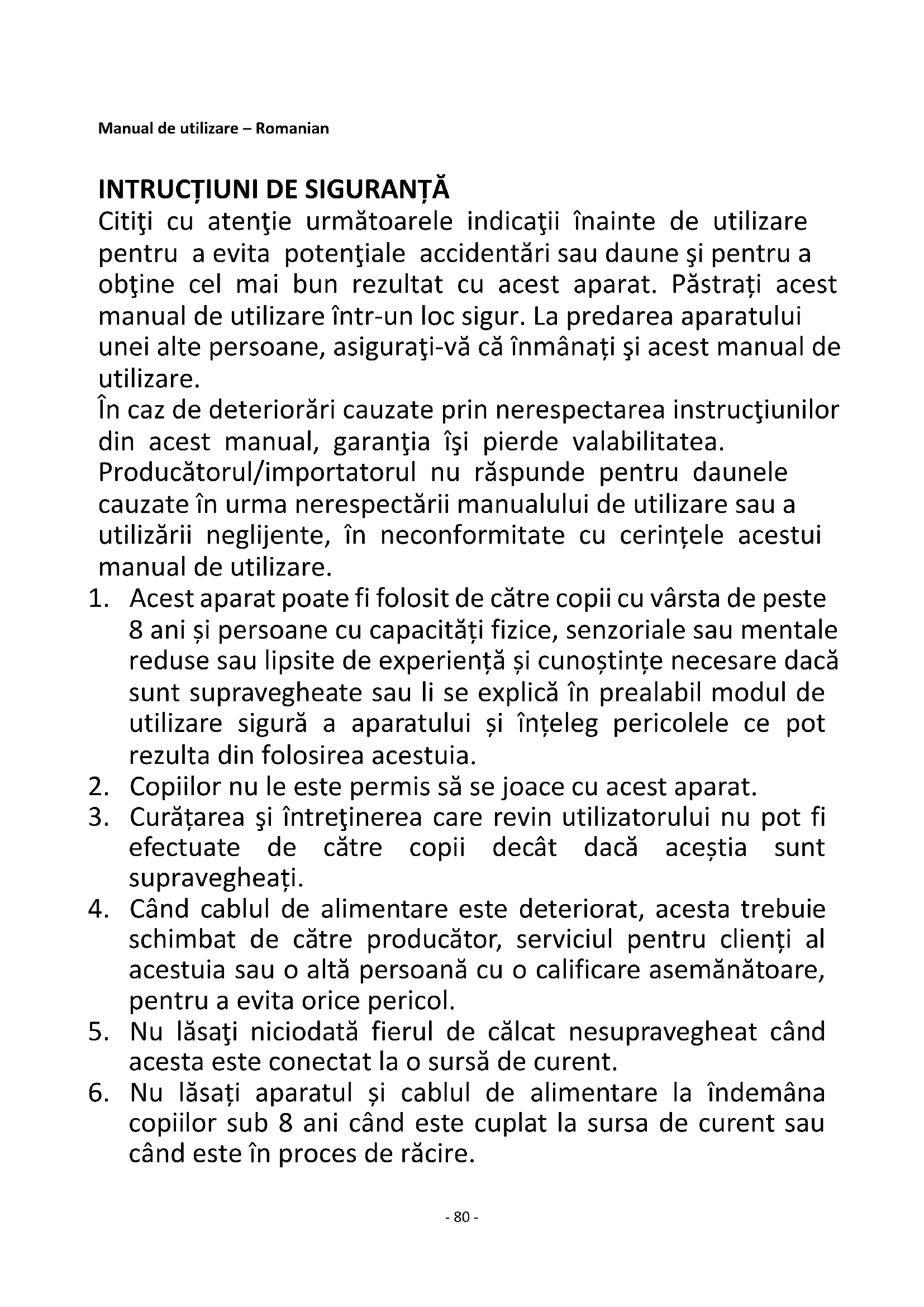 Citiţi cu atenţie următoarele indicaţii înainte de utilizare pentru a evita potenţiale accidentări sau daune şi pentru a obţine cel mai bun rezultat cu acest aparat. Păstrați acest manual de utilizare într-un loc sigur. La predarea aparatului unei alte persoane, asiguraţi-vă că înmânați şi acest manual de utilizare. În caz de deteriorări cauzate prin nerespectarea instrucţiunilor din acest manual, garanţia îşi pierde valabilitatea. Producătorul/importatorul nu răspunde pentru daunele cauzate în urma nerespectării manualului de utilizare sau a utilizării neglijente, în neconformitate cu cerințele acestui manual de utilizare.
