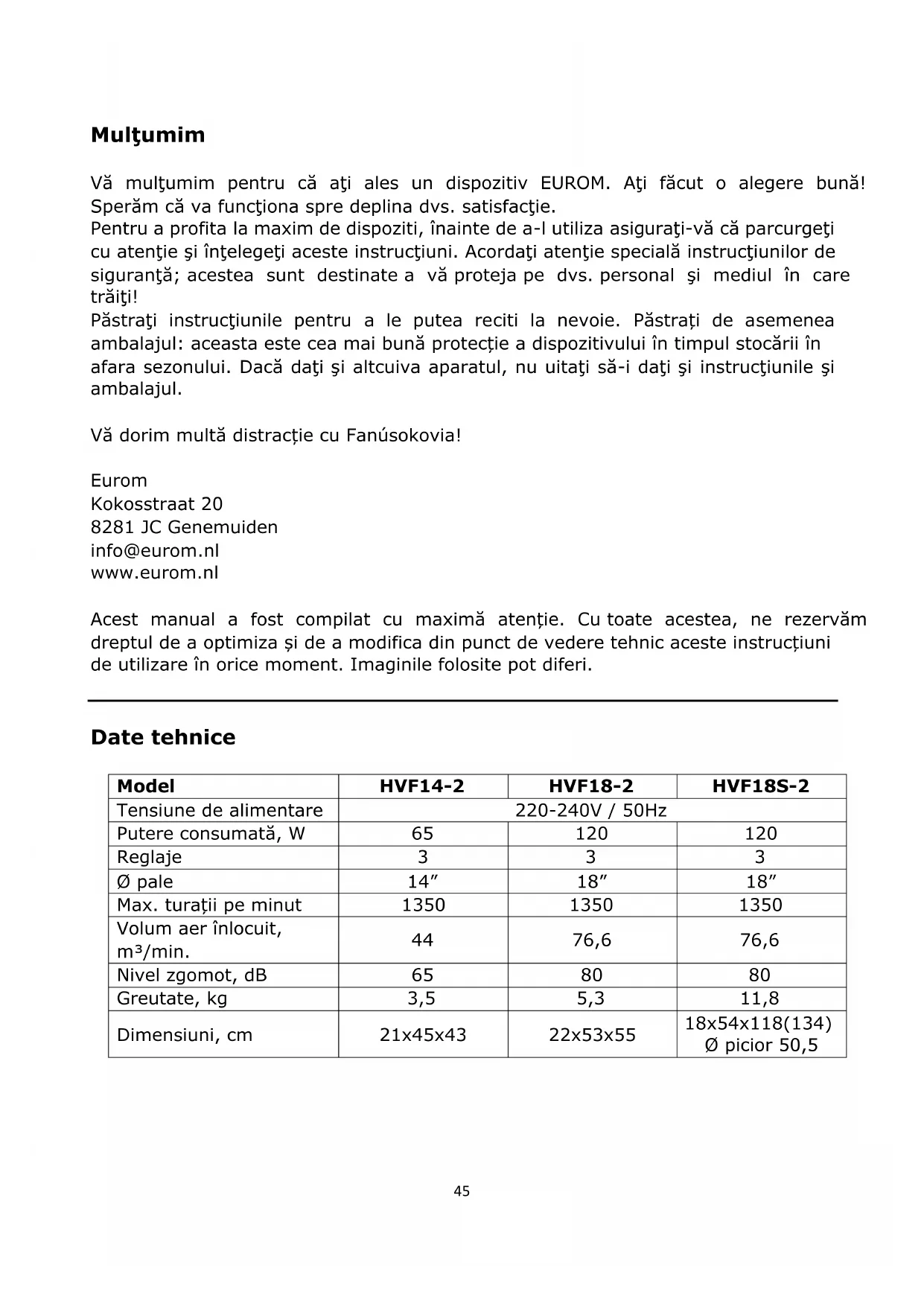 monta în întregime! Funcționarea Înainte de a porni prima dată ventilatorul, verificați dacă sunt respectate toate prevederile de securitate. Buton de acționare (spate) pe 0 Introduceți ștecherul în priză Selectați viteza dorită: 1 = încet (adiere plăcută) 2 = mediu (vânt puternic) 3 = tare (vânt năprasnic) Înapoi la 0 = oprire Pentru oprire, puneți întotdeauna mai întâi butonul în poziția 0, apoi scoateți ștecherul din priză! Reglarea direcției curentului de aer Când reglați direcția curentului de aer, opriți întotdeauna ventilatorul și scoateți-l din priză! Prindeți cu ambele mâini grilajul de protecție care acoperă palele ventilatorului și rotiți în direcția dorită. Pot roti Modelele HVF14-2 și HVF18-2 se pot roti ~150°, iar HVF18S-2 ~275°. Curățirea și întreținerea Opriți ventilatorul și scoateți fișa din priză atunci când doriți să îl curățați sau să efectuați lucrări de întreținere. Ventilatorul necesită doar o întreținere generală și externă. Îndepărtați-l în mod regulat cu o cârpă moale sau un praf de pene sau curățați-l cu o perie moale pentru aspirator. Asigurați-vă că nu există apă în alte părți decât grătarul și tăvile! Nu clătiți niciodată și nu pulverizați ventilatorul! Pentru a evita deteriorarea, deteriorarea sau denaturarea materialului, nu folosiți niciodată agenți abrazivi, agresivi sau corozivi (de curățare). Dacă doriți să curățați ventilatorul la sfârșitul sezonului, faceți acest lucru în ambalajul original: oferă cea mai bună protecție. Puneți-l într-un loc sigur, uscat, nu extrem de cald sau rece.50 Eliminare În UE această pictogramă indică faptul că acest produs nu poate fi eliminat împreună cu deșeurile menajere. Echipamentele vechi conțin materiale valoroase care pot fi reciclate. Aceste materiale trebuie făcute disponibile pentru reutilizare în vederea prevenirii efectelor negative asupra sănătății și mediului înconjurător datorită colectării nereglementate a deșeurilor. Ca urmare, vă rugăm să duceți echipamentele vechi la punctele de colectate desemnate, sau contactați furnizorul original, care poate asigura reciclarea cât mai multor componente posibil. Declaraţie CE Prin urmare, Eurom - Kokosstraat 20 – 8281 JC – Genemuiden - NL declară că Fanúsikovia Eurom, tip HVF14-2, HVF18-2 și HVF18S-2, îndeplinește și este în conformitate cu următoarele standarde: LVD 2014/35/EU EN 60335-2-80:2003+A1:2004+A2:2009 EN 60335-1:2012+A11:2014+A13:2017+A1:2019+A14:2019+A2:2019 EN 62233:2008 EMC 2014/30/EU EN 55014-1:2017 EN 55014-2:2015