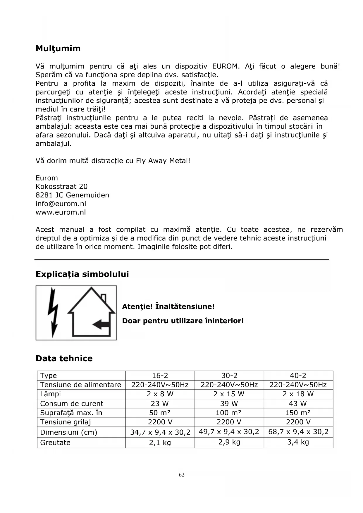 Mulţumim Vă mulţumim pentru că aţi ales un dispozitiv EUROM. Aţi făcut o alegere bună! Sperăm că va funcţiona spre deplina dvs. satisfacţie. Pentru a profita la maxim de dispoziti, înainte de a-l utiliza asiguraţi-vă că parcurgeţi cu atenţie şi înţelegeţi aceste instrucţiuni. Acordaţi atenţie specială instrucţiunilor de siguranţă; acestea sunt destinate a vă proteja pe dvs. personal şi mediul în care trăiţi! Păstraţi instrucţiunile pentru a le putea reciti la nevoie. Păstrați de asemenea ambalajul: aceasta este cea mai bună protecție a dispozitivului în timpul stocării în afara sezonului. Dacă daţi şi altcuiva aparatul, nu uitaţi să-i daţi şi instrucţiunile şi ambalajul. Vă dorim multă distracție cu Fly Away Metal! Eurom Kokosstraat 20 8281 JC Genemuiden info@eurom.nl www.eurom.nl Acest manual a fost compilat cu maximă atenție. Cu toate acestea, ne rezervăm dreptul de a optimiza și de a modifica din punct de vedere tehnic aceste instrucțiuni de utilizare în orice moment. Imaginile folosite pot diferi.