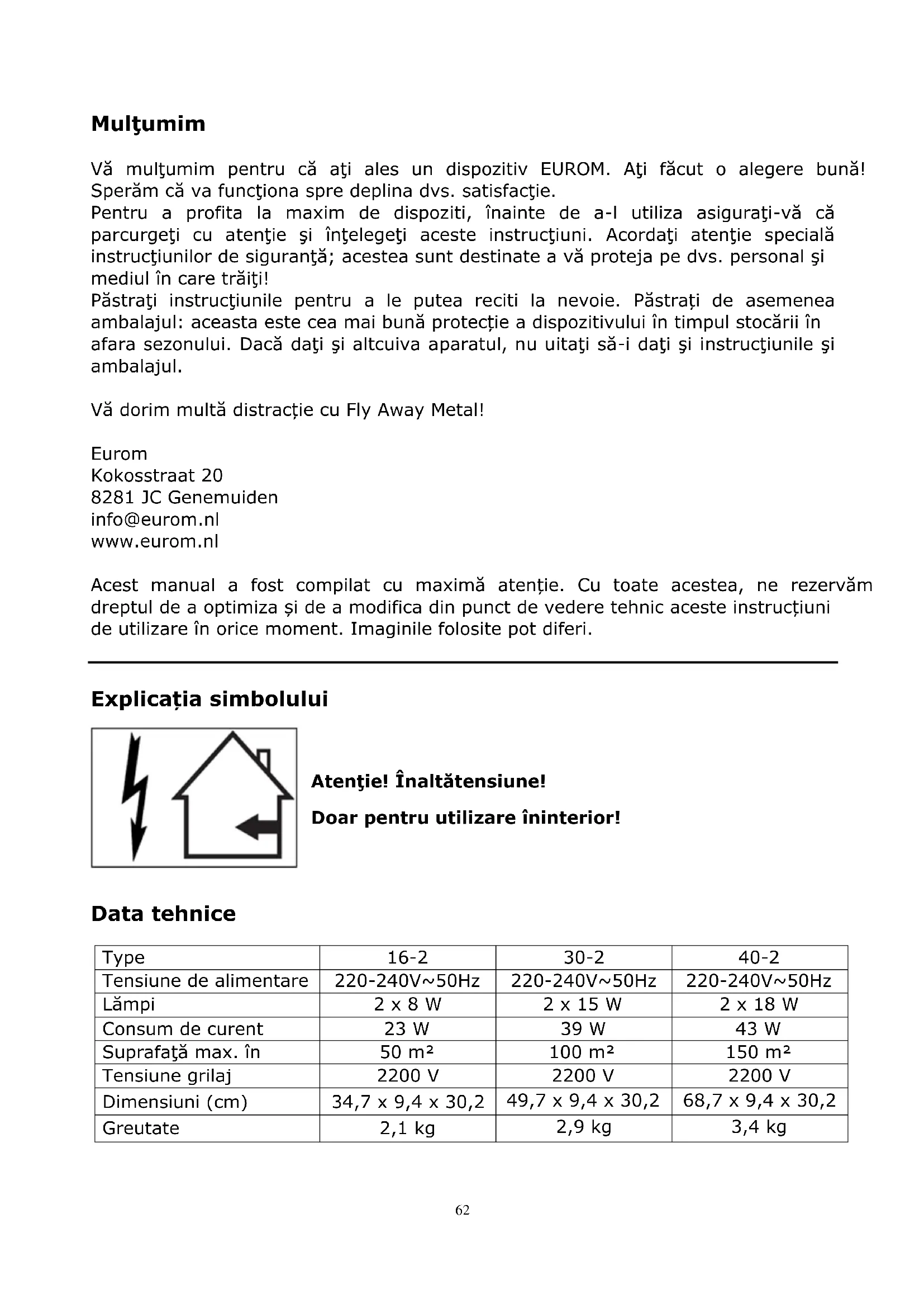 Mulţumim Vă mulţumim pentru că aţi ales un dispozitiv EUROM. Aţi făcut o alegere bună! Sperăm că va funcţiona spre deplina dvs. satisfacţie. Pentru a profita la maxim de dispoziti, înainte de a-l utiliza asiguraţi-vă că parcurgeţi cu atenţie şi înţelegeţi aceste instrucţiuni. Acordaţi atenţie specială instrucţiunilor de siguranţă; acestea sunt destinate a vă proteja pe dvs. personal şi mediul în care trăiţi! Păstraţi instrucţiunile pentru a le putea reciti la nevoie. Păstrați de asemenea ambalajul: aceasta este cea mai bună protecție a dispozitivului în timpul stocării în afara sezonului. Dacă daţi şi altcuiva aparatul, nu uitaţi să-i daţi şi instrucţiunile şi ambalajul. Vă dorim multă distracție cu Fly Away Metal! Eurom Kokosstraat 20 8281 JC Genemuiden info@eurom.nl www.eurom.nl Acest manual a fost compilat cu maximă atenție. Cu toate acestea, ne rezervăm dreptul de a optimiza și de a modifica din punct de vedere tehnic aceste instrucțiuni de utilizare în orice moment. Imaginile folosite pot diferi.