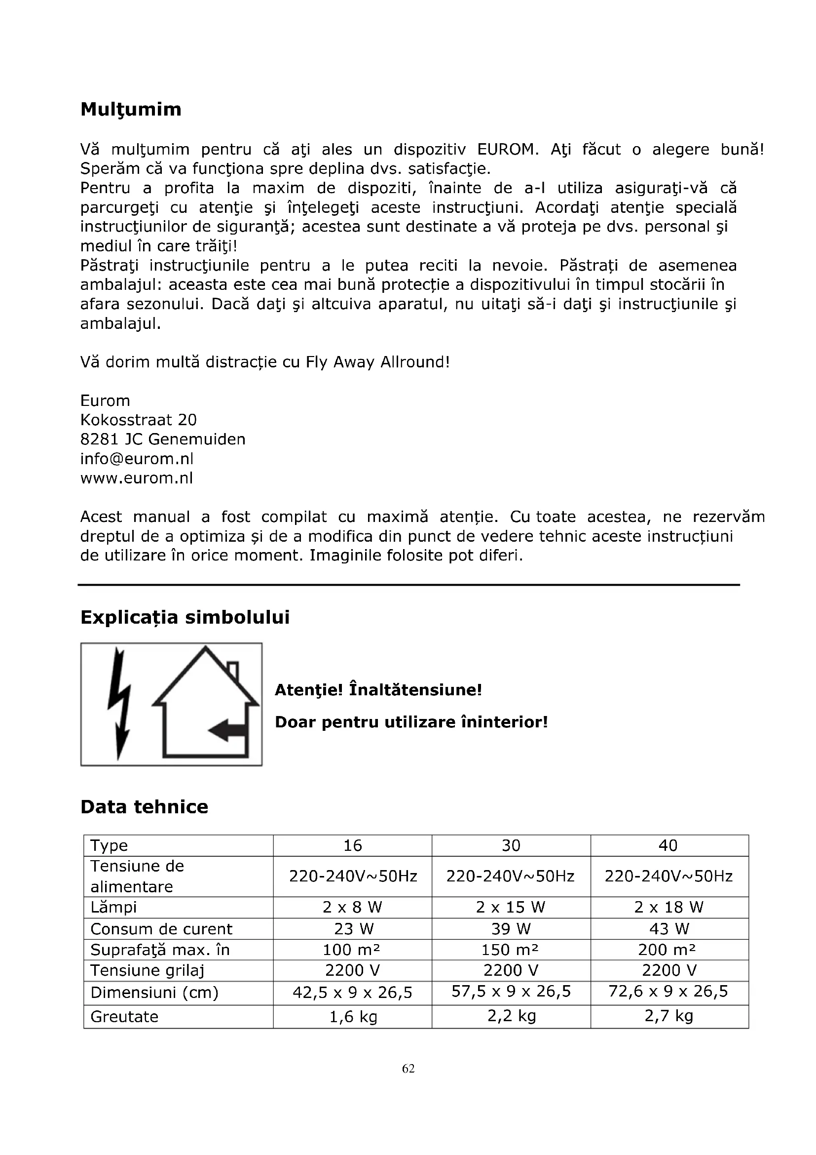 Mulţumim Vă mulţumim pentru că aţi ales un dispozitiv EUROM. Aţi făcut o alegere bună! Sperăm că va funcţiona spre deplina dvs. satisfacţie. Pentru a profita la maxim de dispoziti, înainte de a-l utiliza asiguraţi-vă că parcurgeţi cu atenţie şi înţelegeţi aceste instrucţiuni. Acordaţi atenţie specială instrucţiunilor de siguranţă; acestea sunt destinate a vă proteja pe dvs. personal şi mediul în care trăiţi! Păstraţi instrucţiunile pentru a le putea reciti la nevoie. Păstrați de asemenea ambalajul: aceasta este cea mai bună protecție a dispozitivului în timpul stocării în afara sezonului. Dacă daţi şi altcuiva aparatul, nu uitaţi să-i daţi şi instrucţiunile şi ambalajul. Vă dorim multă distracție cu Fly Away Allround! Eurom Kokosstraat 20 8281 JC Genemuiden info@eurom.nl www.eurom.nl Acest manual a fost compilat cu maximă atenție. Cu toate acestea, ne rezervăm dreptul de a optimiza și de a modifica din punct de vedere tehnic aceste instrucțiuni de utilizare în orice moment. Imaginile folosite pot diferi.