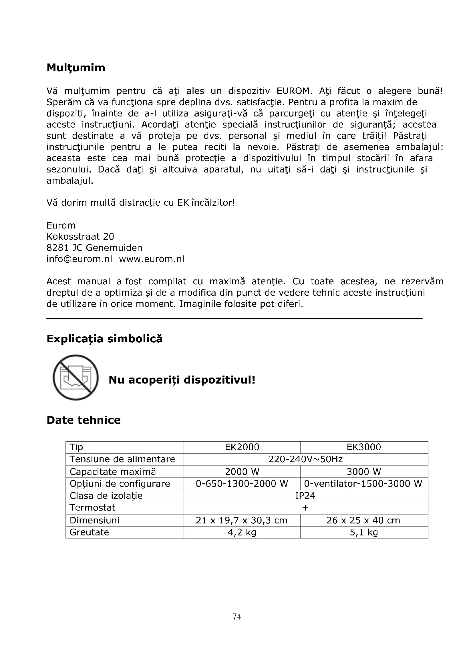 La stânga, se află selectorul de regim cu 4 poziţii. De sus în jos: - O sau off (închis) - numai ventilator - putere de 1.500 W - putere de 3.000 W La dreapta, se află butonul termostatului cu reglare continuă. Loc de amplasare şi conectare Îndepărtaţi ambalajul şi nu îl păstraţi la îndemâna copiilor. După îndepărtarea ambalajului, verificaţi aparatul pentru a depista eventuale deteriorări şi alte semne care ar putea indica deteriorări/defecte/disfuncţionalităţi. În cazul în care aveţi dubii, nu folosiţi aparatul şi contactaţi furnizorul în vederea verificării sau înlocuirii aparatului.81 Selectați o locație adecvată pentru dispozitiv luând în considerare toate avertismentele menționate mai sus în acest manual. Asiguraţi-vă că radiatorul este decuplat (întrerupător în poziţia O), apoi conectaţi-l la o priză care funcţionează la parametrii 230 V-50 Hz. Conectaţi radiatorul numai la o priză cu împământare! Configurare şi exploatare Când radiatorul este pus în funcţiune pentru prima dată (sau când doriţi să reconfiguraţi temperatura dorită), rotiţi butonul termostatului în poziţia maximă (în sensul acelor de ceasornic, până la capăt). Cu selectorul de regim, reglaţi radiatorul după cum preferaţi. Odată ce temperatura spaţiului a atins nivelul dorit, rotiţi încet butonul termostatului în sens invers acelor de ceasornic până când auziţi un clic. Lăsaţi butonul în această poziţie. Radiatorul va menţine în mod automat temperatura la acest nivel. Realizează acest lucru prin decuplarea şi cuplarea elementelor de încălzire de fiecare dată când temperatura creşte sau scade prea mult. Atenţie! După ce termostatul a decuplat elementele de încălzire, ventilatorul continuă să funcţioneze. În acest mod, aerul este menţinut în mişcare continuă, permiţând radiatorului să detecteze cu precizie dacă spaţiul s-a răcit. Butonul termostatului poate fi reglat în orice moment. O temperatură mai ridicată poate fi configurată prin rotirea în sensul acelor de ceasornic, o temperatură mai scăzută, prin rotire în sens invers. Caracteristici de siguranţă Protecţie la supraîncălzire În caz de supraîncălzire internă, funcţia de protecţie la supraîncălzire decuplează radiatorul. În cazul în care radiatorul se decuplează din cauza supraîncălzirii, aduceţi imediat selectorul de regim în poziţia O, scoateţi aparatul din priză şi lăsaţi-l să se răcească cel puţin 10 minute. Teoretic, după aceea radiatorul poate fi utilizat ca de obicei. Totuşi, există o cauză generală a supraîncălzirii aparatului: radiatorul nu poate elibera căldura în mod adecvat sau nu o poate sufla în aerul proaspăt (întrucât radiatorul este acoperit, grătarul blocat, radiatorul este amplasat prea aproape de perete etc.). Înainte de a repune în funcţiune radiatorul, eliminaţi sau remediaţi cauza supraîncălzirii aparatului. Dacă nu puteţi depista cauza şi aparatul se supraîncălzeşte din nou, nu mai folosiţi radiatorul şi contactaţi vânzătorul/un electrician autorizat pentru verificarea/repararea aparatului. Supraîncălzirea reprezintă un risc major de incendiu! Curăţare şi întreţinere Menţineţi aparatul în perfectă stare de curăţenie. Depunerile de praf şi de murdărie din interiorul aparatului sunt cauza frecventă a supraîncălzirii! Din acest motiv,82 trebuie să le îndepărtaţi în mod regulat. Înainte de orice operaţiune de curăţire sau întreţinere, opriţi aeroterma, scoateţi ştecherul din priză şi lăsaţi-o să se răcească. Ştergeţi regulat exteriorul aerotermei cu o cârpă uscată sau bine stoarsă. Nu folosiţi un săpun puternic, spray-uri, detergent sau substanţe abrazive, ceară, lac sau soluţii chimice! Folosind un aspirator sau un compresor, îndepărtaţi cu grijă praful şi murdăria de pe grilaj şi asiguraţi-vă că deschiderile de aspirare şi de evacuare a aerului sunt curate. În timpul curăţării, fiţi atenţi să nu atingeţi sau să deterioraţi componentele interne! Aeroterma nu conţine piese care impun operaţiuni de întreţinere. La sfârşitul sezonului, depozitaţi aeroterma, dacă este posibil în ambalajul original. Păstraţi-o în poziţie verticală, într-un loc răcoros, uscat şi ferit de praf. Eliminare În UE această pictogramă indică faptul că acest produs nu poate fi eliminat împreună cu deșeurile menajere. Echipamentele vechi conțin materiale valoroase care pot fi reciclate. Aceste materiale trebuie făcute disponibile pentru reutilizare în vederea prevenirii efectelor negative asupra sănătății și mediului înconjurător datorită colectării nereglementate a deșeurilor. Ca urmare, vă rugăm să duceți echipamentele vechi la punctele de colectate desemnate, sau contactați furnizorul original, care poate asigura reciclarea cât mai multor componente posibil. Declaraţie CE Vezi pagina 83.83 CE–declaration Eurom Kokosstraat 20 8281 JC Genemuiden The Netherlands declares the following device in sole responsibility: Product: workspace heaters Brand name: EUROM Model: EK 2000 & EK3000 Item number: 332605 & 332643 Complies with the following harmonization rules: Low Voltage Directive: LVD 2014/35/EU Electromagnetic compatibility Directive: EMC 2014/30/EU Restriction of Hazardous Substances RoHS Directive: 2011/65/EU&(EU)2015/863 Framework Directive Ecodesign requirements: ERP 2009/125/EC Regulation Ecodesign requirements for Individual room heaters: (EU) 2015/1188 Regulation Ecodesign requirements Electricity Consumption in standby and off state: 1275/2008/EC Applied harmonized standards: EN 60335-2-30:2009+A11:2012 EN 60335-1:2012+AC:2014+A11:2014+A1:2014+A13:2017+ A1:2019+A14:2019+A2 :2019 EN 62233:2008 EN 55014-1:2017 EN 55014-2:2015 EN 61000-3-3:2013 EN 61000-3-2:2014 Genemuiden, 15-04-2020 W.J. Bakker, alg. Dir.84