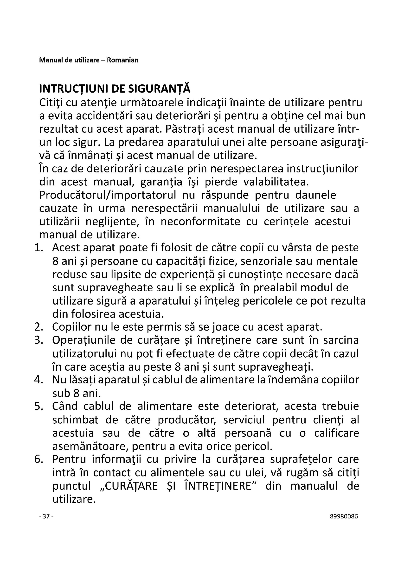 intră în contact cu alimentele sau cu ulei, vă rugăm să citiţi punctul „CURĂȚARE ȘI ÎNTREȚINERE“ din manualul de utilizare.- 38 - 89980086
