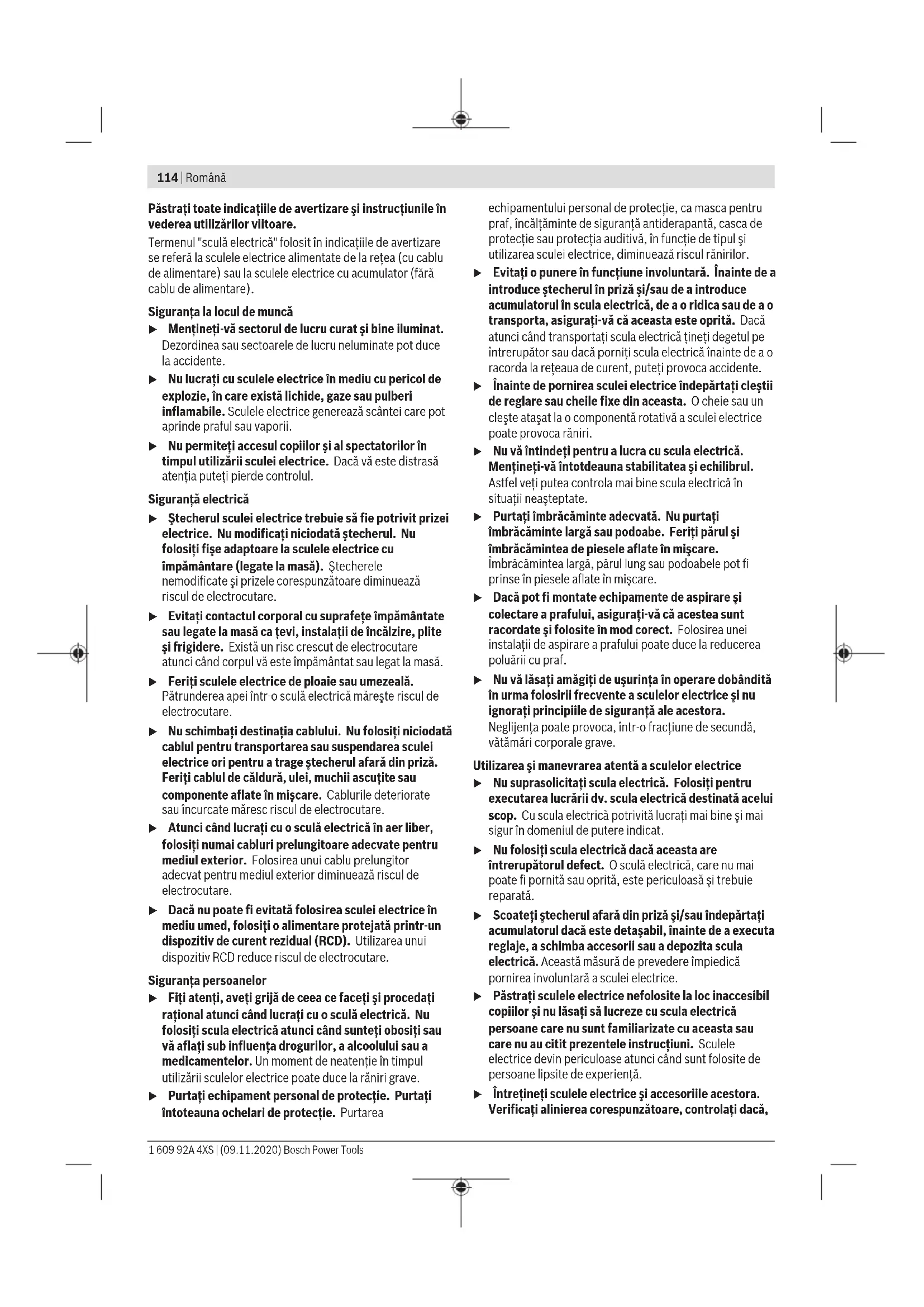 Бұл литий-иондық аккумуляторлар қауіпті тауарларға қойылатын талаптарға сай болуы керек. Пайдаланушы аккумуляторларды көшеде қосымша құжаттарсыз тасымалдай алады. Үшінші тұлғалар (мысалы, әуе көлігі немесе жіберу) орамаға және маркаларға қойылатын арнайы талаптарды сақтау керек. Жіберуге дайындау кезінде қауіпті жүктерді тасымалдау маманымен хабарласу керек. Аккумуляторды корпусы зақымдалған болса ғана жіберіңіз. Ашық түйіспелерді желімдеңіз және аккумуляторды орамада қозғалмайтындай ораңыз. Қажет болса, қосымша ұлттық ережелерді сақтаңыз. Кәдеге жарату Электр құралдарды, аккумуляторларды, керек-жарақтарды және орау материалдарын экологиялық тұрғыдан дұрыс утилизациялауға тапсыру керек. Электр құралдарды және аккумуляторларды/ батареяларды үй қоқысына тастамаңыз! Тек қана ЕО елдері үшін: Еуропа 2012/19/EU ережесі бойынша жарамсыз электр құралдары және Еуропа 2006/66/EC ережесі бойынша зақымдалған немесе ескі аккумулятор/батареялар бөлек жиналып кәдеге жаратылуы қажет. Аккумуляторлар/батареялар: Литий-иондық: Тасымалдау бөліміндегі нұсқауларды орындаңыз (қараңыз „Тасымалдау“, Бет113). Română Instrucţiuni de siguranţă Instrucţiuni generale de siguranţă pentru scule electrice AVERTIS- MENT Citiţi toate avertizările, instrucţiunile, ilustraţiile şi specificaţiile puse la dispoziţie împreună cu această sculă electrică. Nerespectarea instrucţiunilor menţionate mai jos poate duce la electrocutare, incendiu şi/sau vătămări corporale grave. Bosch Power Tools 1 609 92A 4XS | (09.11.2020)114 | Română Păstraţi toate indicaţiile de avertizare şi instrucţiunile în vederea utilizărilor viitoare. Termenul "sculă electrică" folosit în indicaţiile de avertizare se referă la sculele electrice alimentate de la reţea (cu cablu de alimentare) sau la sculele electrice cu acumulator (fără cablu de alimentare). Siguranţa la locul de muncă u Menţineţi‑vă sectorul de lucru curat şi bine iluminat. Dezordinea sau sectoarele de lucru neluminate pot duce la accidente. u Nu lucraţi cu sculele electrice în mediu cu pericol de explozie, în care există lichide, gaze sau pulberi inflamabile. Sculele electrice generează scântei care pot aprinde praful sau vaporii. u Nu permiteţi accesul copiilor şi al spectatorilor în timpul utilizării sculei electrice. Dacă vă este distrasă atenţia puteţi pierde controlul. Siguranţă electrică u Ştecherul sculei electrice trebuie să fie potrivit prizei electrice. Nu modificaţi niciodată ştecherul. Nu folosiţi fişe adaptoare la sculele electrice cu împământare (legate la masă). Ştecherele nemodificate şi prizele corespunzătoare diminuează riscul de electrocutare. u Evitaţi contactul corporal cu suprafeţe împământate sau legate la masă ca ţevi, instalaţii de încălzire, plite şi frigidere. Există un risc crescut de electrocutare atunci când corpul vă este împământat sau legat la masă. u Feriţi sculele electrice de ploaie sau umezeală. Pătrunderea apei într‑o sculă electrică măreşte riscul de electrocutare. u Nu schimbaţi destinaţia cablului. Nu folosiţi niciodată cablul pentru transportarea sau suspendarea sculei electrice ori pentru a trage ştecherul afară din priză. Feriţi cablul de căldură, ulei, muchii ascuţite sau componente aflate în mişcare. Cablurile deteriorate sau încurcate măresc riscul de electrocutare. u Atunci când lucraţi cu o sculă electrică în aer liber, folosiţi numai cabluri prelungitoare adecvate pentru mediul exterior. Folosirea unui cablu prelungitor adecvat pentru mediul exterior diminuează riscul de electrocutare. u Dacă nu poate fi evitată folosirea sculei electrice în mediu umed, folosiţi o alimentare protejată printr-un dispozitiv de curent rezidual (RCD). Utilizarea unui dispozitiv RCD reduce riscul de electrocutare. Siguranţa persoanelor u Fiţi atenţi, aveţi grijă de ceea ce faceţi şi procedaţi raţional atunci când lucraţi cu o sculă electrică. Nu folosiţi scula electrică atunci când sunteţi obosiţi sau vă aflaţi sub influenţa drogurilor, a alcoolului sau a medicamentelor. Un moment de neatenţie în timpul utilizării sculelor electrice poate duce la răniri grave. u Purtaţi echipament personal de protecţie. Purtaţi întoteauna ochelari de protecţie. Purtarea echipamentului personal de protecţie, ca masca pentru praf, încălţăminte de siguranţă antiderapantă, casca de protecţie sau protecţia auditivă, în funcţie de tipul şi utilizarea sculei electrice, diminuează riscul rănirilor. u Evitaţi o punere în funcţiune involuntară. Înainte de a introduce ştecherul în priză şi/sau de a introduce acumulatorul în scula electrică, de a o ridica sau de a o transporta, asiguraţi‑vă că aceasta este oprită. Dacă atunci când transportaţi scula electrică ţineţi degetul pe întrerupător sau dacă porniţi scula electrică înainte de a o racorda la reţeaua de curent, puteţi provoca accidente. u Înainte de pornirea sculei electrice îndepărtaţi cleştii de reglare 