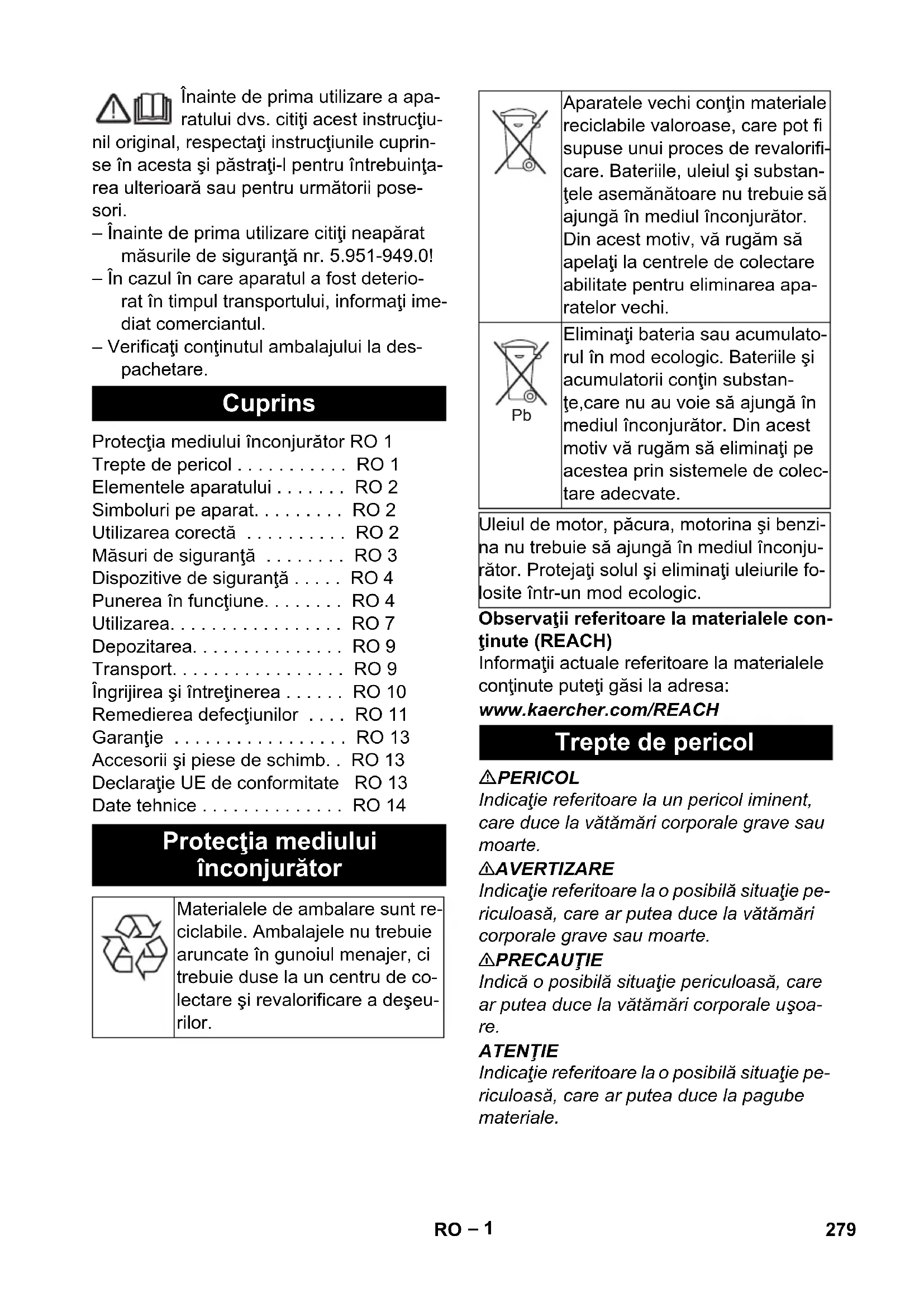 278 PL– 1 Înainte de prima utilizare a apa- ratului dvs. citiţi acest instrucţiu- nil original, respectaţi instrucţiunile cuprin- se în acesta şi păstraţi-l pentru întrebuinţa- rea ulterioară sau pentru următorii pose- sori. – Înainte de prima utilizare citiţi neapărat măsurile de siguranţă nr. 5.951-949.0! – În cazul în care aparatul a fost deterio- rat în timpul transportului, informaţi ime- diat comerciantul. – Verificaţi conţinutul ambalajului la des- pachetare. Observaţii referitoare la materialele con- ţinute (REACH) Informaţii actuale referitoare la materialele conţinute puteţi găsi la adresa: www.kaercher.com/REACH PERICOL Indicaţie referitoare la un pericol iminent, care duce la vătămări corporale grave sau moarte. 몇 AVERTIZARE Indicaţie referitoare la o posibilă situaţie pe- riculoasă, care ar putea duce la vătămări corporale grave sau moarte. 몇 PRECAUŢIE Indică o posibilă situaţie periculoasă, care ar putea duce la vătămări corporale uşoa- re. ATENŢIE Indicaţie referitoare la o posibilă situaţie pe- riculoasă, care ar putea duce la pagube materiale. Cuprins Protecţia mediului înconjurător RO 1 Trepte de pericol . . . . . . . . . . . RO 1 Elementele aparatului . . . . . . . RO 2 Simboluri pe aparat. . . . . . . . . RO 2 Utilizarea corectă . . . . . . . . . . RO 2 Măsuri de siguranţă . . . . . . . . RO 3 Dispozitive de siguranţă . . . . . RO 4 Punerea în funcţiune. . . . . . . . RO 4 Utilizarea. . . . . . . . . . . . . . . . . RO 7 Depozitarea. . . . . . . . . . . . . . . RO 9 Transport. . . . . . . . . . . . . . . . . RO 9 Îngrijirea şi întreţinerea . . . . . . RO 10 Remedierea defecţiunilor . . . . RO 11 Garanţie . . . . . . . . . . . . . . . . . RO 13 Accesorii şi piese de schimb. . RO 13 Declaraţie UE de conformitate RO 13 Date tehnice . . . . . . . . . . . . . . RO 14 Protecţia mediului înconjurător Materialele de ambalare sunt re- ciclabile. Ambalajele nu trebuie aruncate în gunoiul menajer, ci trebuie duse la un centru de co- lectare şi revalorificare a deşeu- rilor. Aparatele vechi conţin materiale reciclabile valoroase, care pot fi supuse unui proces de revalorifi- care. Bateriile, uleiul şi substan- ţele asemănătoare nu trebuie să ajungă în mediul înconjurător. Din acest motiv, vă rugăm să apelaţi la centrele de colectare abilitate pentru eliminarea apa- ratelor vechi. Eliminaţi bateria sau acumulato- rul în mod ecologic. Bateriile şi acumulatorii conţin substan- ţe,care nu au voie să ajungă în mediul înconjurător. Din acest motiv vă rugăm să eliminaţi pe acestea prin sistemele de colec- tare adecvate. Uleiul de motor, păcura, motorina şi benzi- na nu trebuie să ajungă în mediul înconju- rător. Protejaţi solul şi eliminaţi uleiurile fo- losite într-un mod ecologic. Trepte de pericol