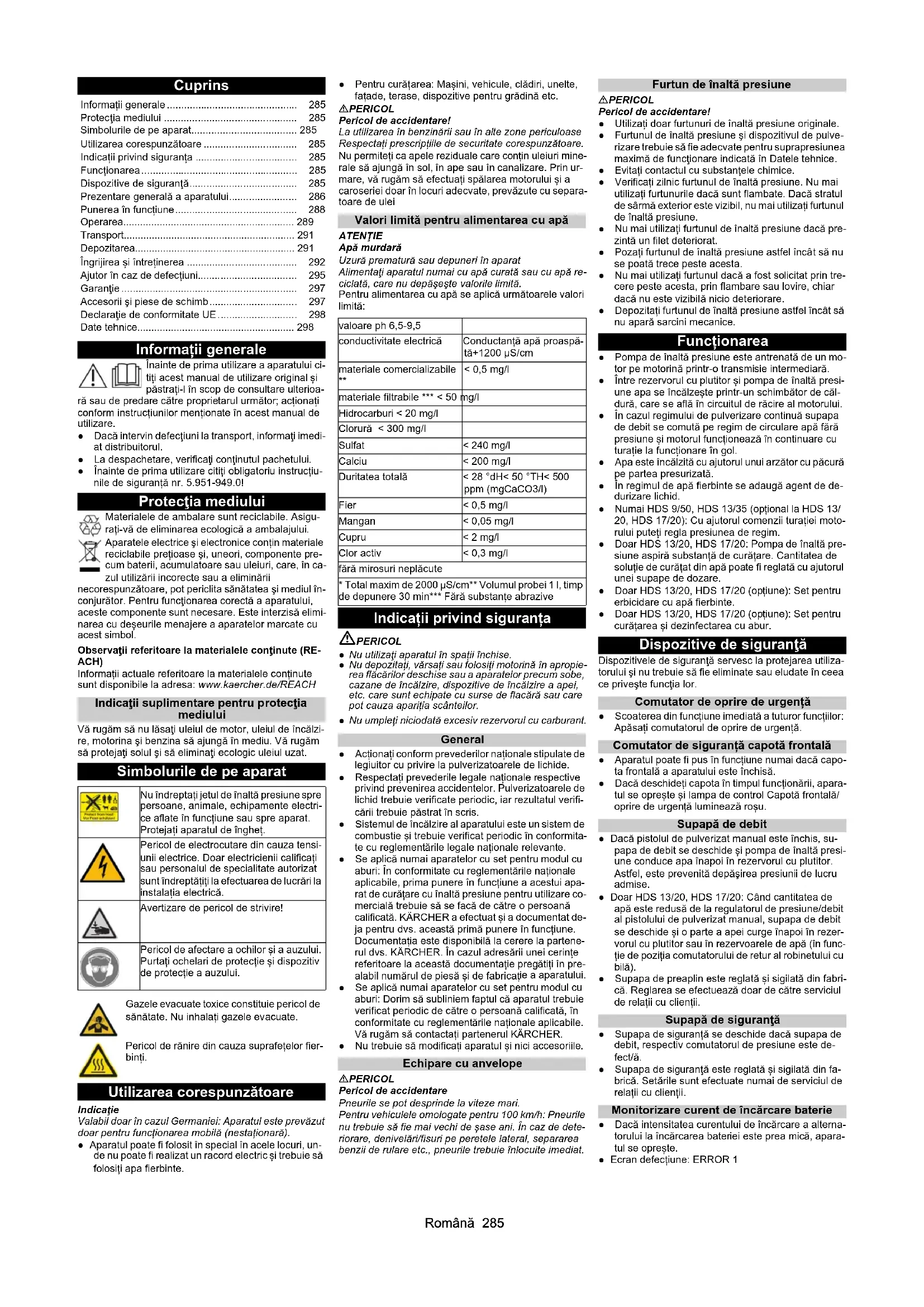 - 2,1 2,1 0,85 0,8Română 285 Cuprins Informații generale Înainte de prima utilizare a aparatului ci- tiți acest manual de utilizare original și păstrați-l în scop de consultare ulterioa- ră sau de predare către proprietarul următor; acționați conform instrucțiunilor menționate în acest manual de utilizare. ● Dacă intervin defecţiuni la transport, informaţi imedi- at distribuitorul. ● La despachetare, verificaţi conţinutul pachetului. ● Înainte de prima utilizare citiți obligatoriu instrucțiu- nile de siguranță nr. 5.951-949.0! Protecţia mediului Materialele de ambalare sunt reciclabile. Asigu- rați-vă de eliminarea ecologică a ambalajului. Aparatele electrice şi electronice conțin materiale reciclabile prețioase şi, uneori, componente pre- cum baterii, acumulatoare sau uleiuri, care, în ca- zul utilizării incorecte sau a eliminării necorespunzătoare, pot periclita sănătatea şi mediul în- conjurător. Pentru funcţionarea corectă a aparatului, aceste componente sunt necesare. Este interzisă elimi- narea cu deșeurile menajere a aparatelor marcate cu acest simbol. Observaţii referitoare la materialele conţinute (RE- ACH) Informații actuale referitoare la materialele conținute sunt disponibile la adresa: www.kaercher.de/REACH Indicaţii suplimentare pentru protecţia mediului Vă rugăm să nu lăsaţi uleiul de motor, uleiul de încălzi- re, motorina şi benzina să ajungă în mediu. Vă rugăm să protejaţi solul şi să eliminaţi ecologic uleiul uzat. Simbolurile de pe aparat Utilizarea corespunzătoare Indicaţie Valabil doar în cazul Germaniei: Aparatul este prevăzut doar pentru funcționarea mobilă (nestaționară). ● Aparatul poate fi folosit în special în acele locuri, un- de nu poate fi realizat un racord electric și trebuie să folosiți apa fierbinte. ● Pentru curățarea: Mașini, vehicule, clădiri, unelte, fațade, terase, dispozitive pentru grădină etc. PERICOL Pericol de accidentare! La utilizarea în benzinării sau în alte zone periculoase Respectați prescripțiile de securitate corespunzătoare. Nu permiteți ca apele reziduale care conțin uleiuri mine- rale să ajungă în sol, în ape sau în canalizare. Prin ur- mare, vă rugăm să efectuați spălarea motorului și a caroseriei doar în locuri adecvate, prevăzute cu separa- toare de ulei Valori limită pentru alimentarea cu apă ATENŢIE Apă murdară Uzură prematură sau depuneri în aparat Alimentaţi aparatul numai cu apă curată sau cu apă re- ciclată, care nu depăşeşte valorile limită. Pentru alimentarea cu apă se aplică următoarele valori limită: Indicații privind siguranța PERICOL ● Nu utilizaţi aparatul în spații închise. ● Nu depozitați, vărsați sau folosiți motorină în apropie- rea flăcărilor deschise sau a aparatelor precum sobe, cazane de încălzire, dispozitive de încălzire a apei, etc. care sunt echipate cu surse de flacără sau care pot cauza apariția scânteilor. ● Nu umpleți niciodată excesiv rezervorul cu carburant. General ● Acționați conform prevederilor naționale stipulate de legiuitor cu privire la pulverizatoarele de lichide. ● Respectați prevederile legale naționale respective privind prevenirea accidentelor. Pulverizatoarele de lichid trebuie verificate periodic, iar rezultatul verifi- cării trebuie păstrat în scris. ● Sistemul de încălzire al aparatului este un sistem de combustie și trebuie verificat periodic în conformita- te cu reglementările legale naționale relevante. ● Se aplică numai aparatelor cu set pentru modul cu aburi: În conformitate cu reglementările naționale aplicabile, prima punere în funcțiune a acestui apa- rat de curățare cu înaltă presiune pentru utilizare co- mercială trebuie să se facă de către o persoană calificată. KÄRCHER a efectuat și a documentat de- ja pentru dvs. această primă punere în funcțiune. Documentația este disponibilă la cerere la partene- rul dvs. KÄRCHER. În cazul adresării unei cerințe referitoare la această documentație pregătiți în pre- alabil numărul de piesă și de fabricaț ie a aparatului. ● Se aplică numai aparatelor cu set pentru modul cu aburi: Dorim să subliniem faptul că aparatul trebuie verificat periodic de către o persoană calificată, în conformitate cu reglementările naționale aplicabile. Vă rugăm să contactați partenerul KÄRCHER. ● Nu trebuie să modificați aparatul și nici accesoriile. Echipare cu anvelope PERICOL Pericol de accidentare Pneurile se pot desprinde la viteze mari. Pentru vehiculele omologate pentru 100 km/h: Pneurile nu trebuie să fie mai vechi de șase ani. În caz de dete- riorare, denivelări/fisuri pe peretele lateral, separarea benzii de rulare etc., pneurile trebuie înlocuite imediat. Furtun de înaltă presiune PERICOL Pericol de accidentare! ● Utilizați doar furtunuri de înaltă presiune originale. ● Furtunul de înaltă presiune şi dispozitivul de pulve- rizare trebuie să fie adecvate pentru suprapresiunea maximă de funcţionare indicată în Datele tehnice. ● Evitați contactul cu substanțele chimice. ● Verificați zilnic furtunul de înaltă presiune. Nu mai utilizați furtunurile dacă sunt flambate. Dacă stratul de sârmă exterior este vizibil, nu mai utilizați furtunul de înaltă presiune. ● Nu mai utilizați furtunul de înaltă presiune dacă pre- zintă un filet deteriorat. ● Pozați furtunul de înaltă presiune astfel încât să nu se poată trece peste acesta. ● Nu mai utilizați furtunul dacă a fost solicitat prin tre- cere peste acesta, prin flambare sau lovire, chiar dacă nu este vizibilă nicio deteriorare. ● Depozitați furtunul de înaltă presiune astfel încât să nu apară sarcini mecanice. Funcționarea ● Pompa de înaltă presiune este antrenată de un mo- tor pe motorină printr-o transmisie intermediară. ● Între rezervorul cu plutitor și pompa de înaltă presi-