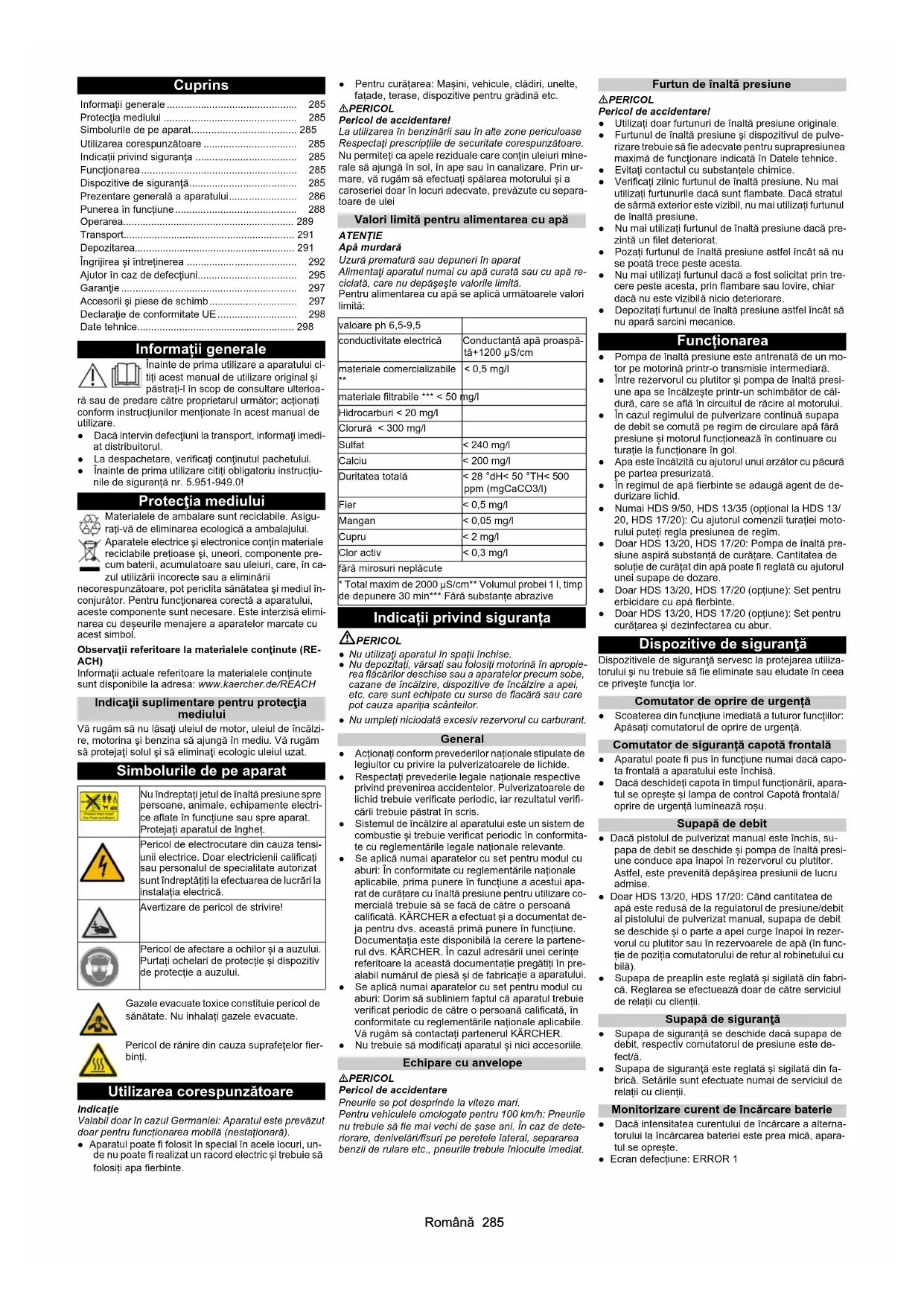 - 2,1 2,1 0,85 0,8Română 285 Cuprins Informații generale Înainte de prima utilizare a aparatului ci- tiți acest manual de utilizare original și păstrați-l în scop de consultare ulterioa- ră sau de predare către proprietarul următor; acționați conform instrucțiunilor menționate în acest manual de utilizare. ● Dacă intervin defecţiuni la transport, informaţi imedi- at distribuitorul. ● La despachetare, verificaţi conţinutul pachetului. ● Înainte de prima utilizare citiți obligatoriu instrucțiu- nile de siguranță nr. 5.951-949.0! Protecţia mediului Materialele de ambalare sunt reciclabile. Asigu- rați-vă de eliminarea ecologică a ambalajului. Aparatele electrice şi electronice conțin materiale reciclabile prețioase şi, uneori, componente pre- cum baterii, acumulatoare sau uleiuri, care, în ca- zul utilizării incorecte sau a eliminării necorespunzătoare, pot periclita sănătatea şi mediul în- conjurător. Pentru funcţionarea corectă a aparatului, aceste componente sunt necesare. Este interzisă elimi- narea cu deșeurile menajere a aparatelor marcate cu acest simbol. Observaţii referitoare la materialele conţinute (RE- ACH) Informații actuale referitoare la materialele conținute sunt disponibile la adresa: www.kaercher.de/REACH Indicaţii suplimentare pentru protecţia mediului Vă rugăm să nu lăsaţi uleiul de motor, uleiul de încălzi- re, motorina şi benzina să ajungă în mediu. Vă rugăm să protejaţi solul şi să eliminaţi ecologic uleiul uzat. Simbolurile de pe aparat Utilizarea corespunzătoare Indicaţie Valabil doar în cazul Germaniei: Aparatul este prevăzut doar pentru funcționarea mobilă (nestaționară). ● Aparatul poate fi folosit în special în acele locuri, un- de nu poate fi realizat un racord electric și trebuie să folosiți apa fierbinte. ● Pentru curățarea: Mașini, vehicule, clădiri, unelte, fațade, terase, dispozitive pentru grădină etc. PERICOL Pericol de accidentare! La utilizarea în benzinării sau în alte zone periculoase Respectați prescripțiile de securitate corespunzătoare. Nu permiteți ca apele reziduale care conțin uleiuri mine- rale să ajungă în sol, în ape sau în canalizare. Prin ur- mare, vă rugăm să efectuați spălarea motorului și a caroseriei doar în locuri adecvate, prevăzute cu separa- toare de ulei Valori limită pentru alimentarea cu apă ATENŢIE Apă murdară Uzură prematură sau depuneri în aparat Alimentaţi aparatul numai cu apă curată sau cu apă re- ciclată, care nu depăşeşte valorile limită. Pentru alimentarea cu apă se aplică următoarele valori limită: Indicații privind siguranța PERICOL ● Nu utilizaţi aparatul în spații închise. ● Nu depozitați, vărsați sau folosiți motorină în apropie- rea flăcărilor deschise sau a aparatelor precum sobe, cazane de încălzire, dispozitive de încălzire a apei, etc. care sunt echipate cu surse de flacără sau care pot cauza apariția scânteilor. ● Nu umpleți niciodată excesiv rezervorul cu carburant. General ● Acționați conform prevederilor naționale stipulate de legiuitor cu privire la pulverizatoarele de lichide. ● Respectați prevederile legale naționale respective privind prevenirea accidentelor. Pulverizatoarele de lichid trebuie verificate periodic, iar rezultatul verifi- cării trebuie păstrat în scris. ● Sistemul de încălzire al aparatului este un sistem de combustie și trebuie verificat periodic în conformita- te cu reglementările legale naționale relevante. ● Se aplică numai aparatelor cu set pentru modul cu aburi: În conformitate cu reglementările naționale aplicabile, prima punere în funcțiune a acestui apa- rat de curățare cu înaltă presiune pentru utilizare co- mercială trebuie să se facă de către o persoană calificată. KÄRCHER a efectuat și a documentat de- ja pentru dvs. această primă punere în funcțiune. Documentația este disponibilă la cerere la partene- rul dvs. KÄRCHER. În cazul adresării unei cerințe referitoare la această documentație pregătiți în pre- alabil numărul de piesă și de fabricaț ie a aparatului. ● Se aplică numai aparatelor cu set pentru modul cu aburi: Dorim să subliniem faptul că aparatul trebuie verificat periodic de către o persoană calificată, în conformitate cu reglementările naționale aplicabile. Vă rugăm să contactați partenerul KÄRCHER. ● Nu trebuie să modificați aparatul și nici accesoriile. Echipare cu anvelope PERICOL Pericol de accidentare Pneurile se pot desprinde la viteze mari. Pentru vehiculele omologate pentru 100 km/h: Pneurile nu trebuie să fie mai vechi de șase ani. În caz de dete- riorare, denivelări/fisuri pe peretele lateral, separarea benzii de rulare etc., pneurile trebuie înlocuite imediat. Furtun de înaltă presiune PERICOL Pericol de accidentare! ● Utilizați doar furtunuri de înaltă presiune originale. ● Furtunul de înaltă presiune şi dispozitivul de pulve- rizare trebuie să fie adecvate pentru suprapresiunea maximă de funcţionare indicată în Datele tehnice. ● Evitați contactul cu substanțele chimice. ● Verificați zilnic furtunul de înaltă presiune. Nu mai utilizați furtunurile dacă sunt flambate. Dacă stratul de sârmă exterior este vizibil, nu mai utilizați furtunul de înaltă presiune. ● Nu mai utilizați furtunul de înaltă presiune dacă pre- zintă un filet deteriorat. ● Pozați furtunul de înaltă presiune astfel încât să nu se poată trece peste acesta. ● Nu mai utilizați furtunul dacă a fost solicitat prin tre- cere peste acesta, prin flambare sau lovire, chiar dacă nu este vizibilă nicio deteriorare. ● Depozitați furtunul de înaltă presiune astfel încât să nu apară sarcini mecanice. Funcționarea ● Pompa de înaltă presiune este antrenată de un mo- tor pe motorină printr-o transmisie intermediară. ● Între rezervorul cu plutitor și pompa de înaltă presi-