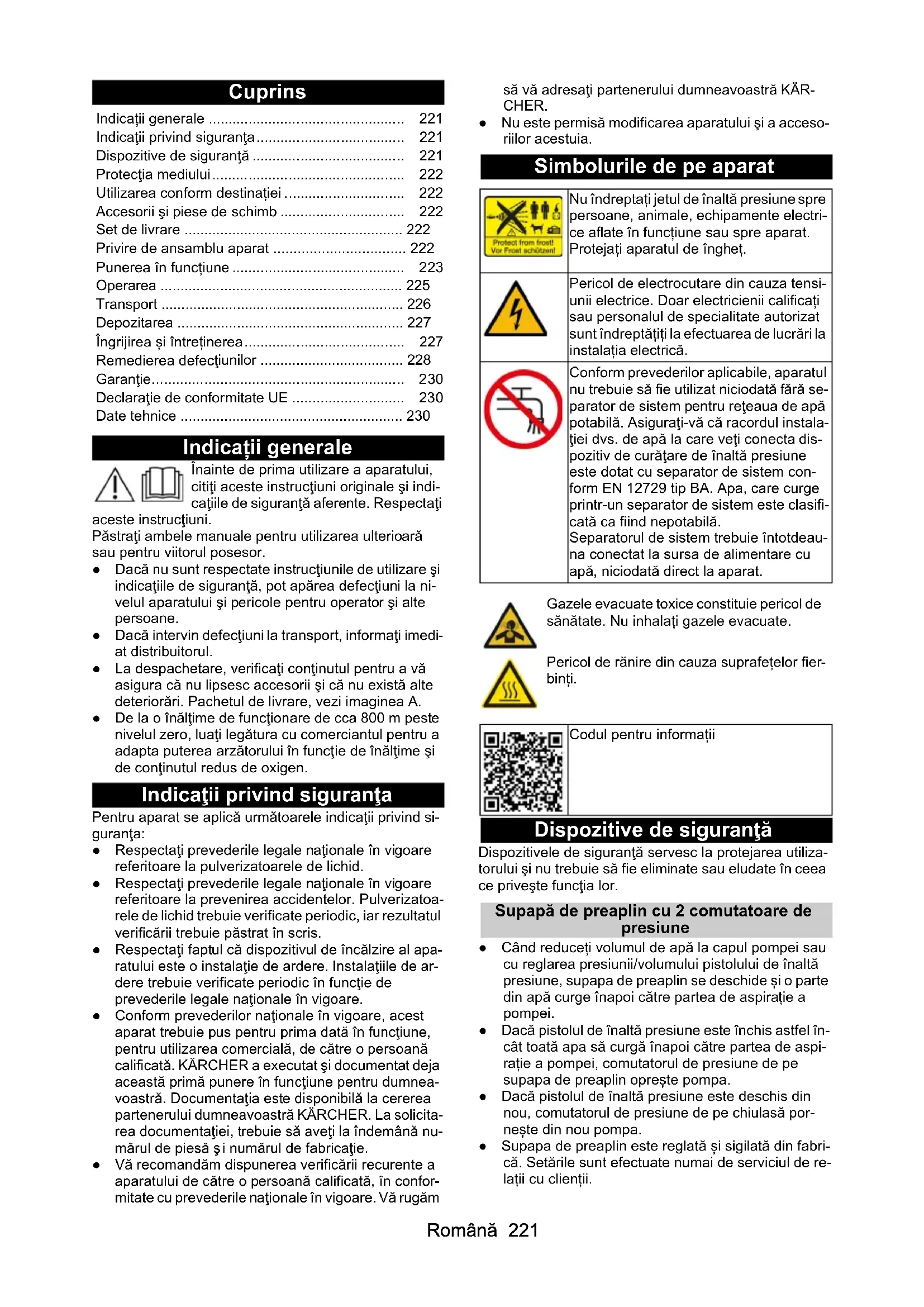 - HDS 9/17-4 CXARomână 221 Cuprins Indicații generale Înainte de prima utilizare a aparatului, citiţi aceste instrucţiuni originale şi indi- caţiile de siguranţă aferente. Respectaţi aceste instrucţiuni. Păstraţi ambele manuale pentru utilizarea ulterioară sau pentru viitorul posesor. ● Dacă nu sunt respectate instrucţiunile de utilizare şi indicaţiile de siguranţă, pot apărea defecţiuni la ni- velul aparatului şi pericole pentru operator şi alte persoane. ● Dacă intervin defecţiuni la transport, informaţi imedi- at distribuitorul. ● La despachetare, verificaţi conţinutul pentru a vă asigura că nu lipsesc accesorii şi că nu există alte deteriorări. Pachetul de livrare, vezi imaginea A. ● De la o înălţime de funcţionare de cca 800 m peste nivelul zero, luaţi legătura cu comerciantul pentru a adapta puterea arzătorului în funcţie de înălţime şi de conţinutul redus de oxigen. Indicaţii privind siguranţa Pentru aparat se aplică următoarele indicaţii privind si- guranţa: ● Respectaţi prevederile legale naţionale în vigoare referitoare la pulverizatoarele de lichid. ● Respectaţi prevederile legale naţionale în vigoare referitoare la prevenirea accidentelor. Pulverizatoa- rele de lichid trebuie verificate periodic, iar rezultatul verificării trebuie păstrat în scris. ● Respectaţi faptul că dispozitivul de încălzire al apa- ratului este o instalaţie de ardere. Instalaţiile de ar- dere trebuie verificate periodic în funcţie de prevederile legale naţionale în vigoare. ● Conform prevederilor naţionale în vigoare, acest aparat trebuie pus pentru prima dată în funcţiune, pentru utilizarea comercială, de către o persoană calificată. KÄRCHER a executat şi documentat deja această primă punere în funcţiune pentru dumnea- voastră. Documentaţia este disponibilă la cererea partenerului dumneavoastră KÄRCHER. La solicita- rea documentaţiei, trebuie să aveţi la îndemână nu- mărul de piesă ş i numărul de fabricaţie. ● Vă recomandăm dispunerea verificării recurente a aparatului de către o persoană calificată, în confor- mitate cu prevederile naţionale în vigoare. Vă rugăm să vă adresaţi partenerului dumneavoastră KÄR- CHER. ● Nu este permisă modificarea aparatului şi a acceso- riilor acestuia. Simbolurile de pe aparat Dispozitive de siguranţă Dispozitivele de siguranţă servesc la protejarea utiliza- torului şi nu trebuie să fie eliminate sau eludate în ceea ce priveşte funcţia lor. Supapă de preaplin cu 2 comutatoare de presiune ● Când reduceți volumul de apă la capul pompei sau cu reglarea presiunii/volumului pistolului de înaltă presiune, supapa de preaplin se deschide și o parte din apă curge înapoi către partea de aspirație a pompei. ● Dacă pistolul de înaltă presiune este închis astfel în- cât toată apa să curgă înapoi către partea de aspi- rație a pompei, comutatorul de presiune de pe supapa de preaplin oprește pompa. ● Dacă pistolul de înaltă presiune este deschis din nou, comutatorul de presiune de pe chiulasă por- nește din nou pompa. ● Supapa de preaplin este reglată și sigilată din fabri- că. Setările sunt efectuate numai de serviciul de re- lații cu clienții. Indicații generale p. 221