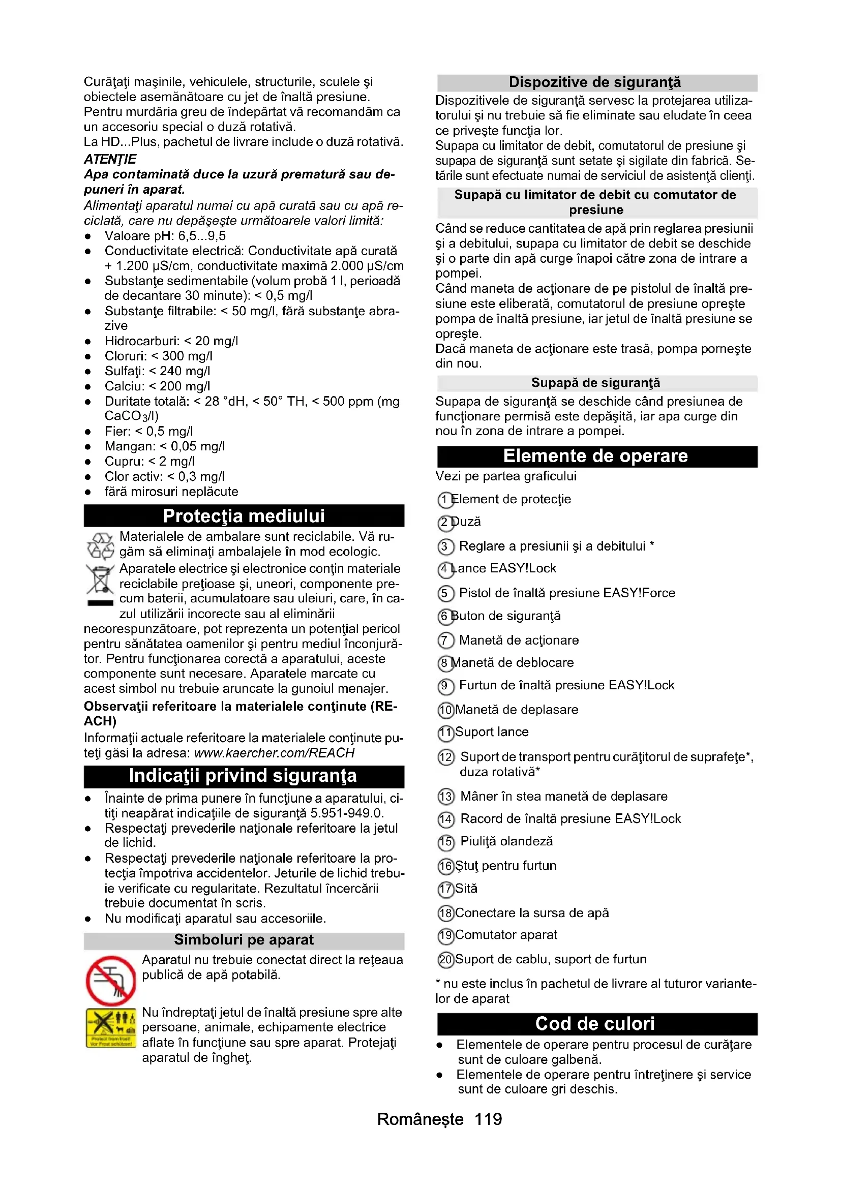 /l) ● Fier: < 0,5 mg/l ● Mangan: < 0,05 mg/l ● Cupru: < 2 mg/l ● Clor activ: < 0,3 mg/l ● fără mirosuri neplăcute Protecţia mediului Materialele de ambalare sunt reciclabile. Vă ru- găm să eliminaţi ambalajele în mod ecologic. Aparatele electrice şi electronice conţin materiale reciclabile preţioase şi, uneori, componente pre- cum baterii, acumulatoare sau uleiuri, care, în ca- zul utilizării incorecte sau al eliminării necorespunzătoare, pot reprezenta un potenţial pericol pentru sănătatea oamenilor şi pentru mediul înconjură- tor. Pentru funcţionarea corectă a aparatului, aceste componente sunt necesare. Aparatele marcate cu acest simbol nu trebuie aruncate la gunoiul menajer. Observaţii referitoare la materialele conţinute (RE- ACH) Informaţii actuale referitoare la materialele conţinute pu- teţi găsi la adresa: www.kaercher.com/REACH Indicaţii privind siguranţa ● Înainte de prima punere în funcţiune a aparatului, ci- tiţi neapărat indicaţiile de siguranţă 5.951-949.0. ● Respectaţi prevederile naţionale referitoare la jetul de lichid. ● Respectaţi prevederile naţionale referitoare la pro- tecţia împotriva accidentelor. Jeturile de lichid trebu- ie verificate cu regularitate. Rezultatul încercării trebuie documentat în scris. ● Nu modificaţi aparatul sau accesoriile. Simboluri pe aparat Aparatul nu trebuie conectat direct la reţeaua publică de apă potabilă. Nu îndreptaţi jetul de înaltă presiune spre alte persoane, animale, echipamente electrice aflate în funcţiune sau spre aparat. Protejaţi aparatul de îngheţ. Dispozitive de siguranţă Dispozitivele de siguranţă servesc la protejarea utiliza- torului şi nu trebuie să fie eliminate sau eludate în ceea ce priveşte funcţia lor. Supapa cu limitator de debit, comutatorul de presiune şi supapa de siguranţă sunt setate şi sigilate din fabrică. Se- tările sunt efectuate numai de serviciul de asistenţă clienţi. Supapă cu limitator de debit cu comutator de presiune Când se reduce cantitatea de apă prin reglarea presiunii şi a debitului, supapa cu limitator de debit se deschide şi o parte din apă curge înapoi către zona de intrare a pompei. Când maneta de acţionare de pe pistolul de înaltă pre- siune este eliberată, comutatorul de presiune opreşte pompa de înaltă presiune, iar jetul de înaltă presiune se opreşte. Dacă maneta de acţionare este trasă, pompa porneşte din nou. Supapă de siguranţă Supapa de siguranţă se deschide când presiunea de funcţionare permisă este depăşită, iar apa curge din nou în zona de intrare a pompei. Elemente de operare Vezi pe partea graficului 1 Element de protecţie 2 Duză 3 Reglare a presiunii şi a debitului * 4 Lance EASY!Lock 5 Pistol de înaltă presiune EASY!Force 6 Buton de siguranţă 7 Manetă de acţionare 8 Manetă de deblocare 9 Furtun de înaltă presiune EASY!Lock 10 Manetă de deplasare 11 Suport lance 12 Suport de transport pentru curăţitorul de suprafeţe*, duza rotativă* 13 Mâner în stea manetă de deplasare 14 Racord de înaltă presiune EASY!Lock 15 Piuliţă olandeză 16 Ştuţ pentru furtun 17 Sită 18 Conectare la sursa de apă 19 Comutator aparat 20 Suport de cablu, suport de furtun