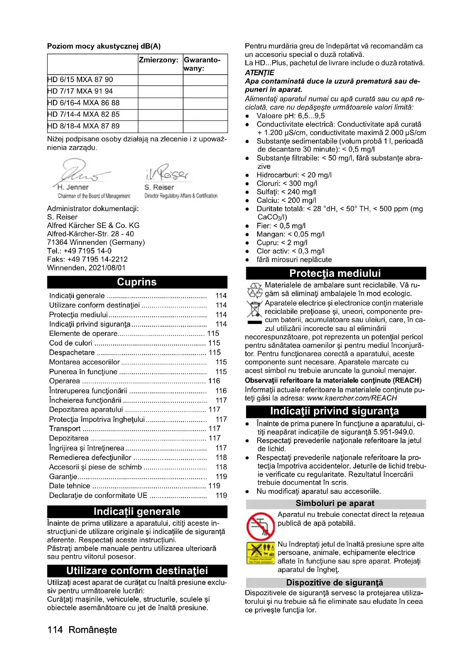 dB(A)90909488858889 HD 6/15 MXA HD 6/15 MXA HD 7/17 MXA HD 6/ 16-4 MXA HD 7/ 14-4 MXA HD 7/ 16-4 MXA HD 8/ 18-4 MXA114 Româneşte Poziom mocy akustycznej dB(A) Niżej podpisane osoby działają na zlecenie i z upoważ- nienia zarządu. Administrator dokumentacji: S. Reiser Alfred Kärcher SE & Co. KG Alfred-Kärcher-Str. 28 - 40 71364 Winnenden (Germany) Tel.: +49 7195 14-0 Faks: +49 7195 14-2212 Winnenden, 2021/08/01 Cuprins Indicații generale Înainte de prima utilizare a aparatului, citiţi aceste in- strucţiuni de utilizare originale şi indicaţiile de siguranţă aferente. Respectați aceste instrucțiuni. Păstraţi ambele manuale pentru utilizarea ulterioară sau pentru viitorul posesor. Utilizare conform destinaţiei Utilizaţi acest aparat de curăţat cu înaltă presiune exclu- siv pentru următoarele lucrări: Curăţaţi maşinile, vehiculele, structurile, sculele şi obiectele asemănătoare cu jet de înaltă presiune. Pentru murdăria greu de îndepărtat vă recomandăm ca un accesoriu special o duză rotativă. La HD...Plus, pachetul de livrare include o duză rotativă. ATENŢIE Apa contaminată duce la uzură prematură sau de- puneri în aparat. Alimentaţi aparatul numai cu apă curată sau cu apă re- ciclată, care nu depăşeşte următoarele valori limită: ● Valoare pH: 6,5...9,5 ● Conductivitate electrică: Conductivitate apă curată + 1.200 µS/cm, conductivitate maximă 2.000 µS/cm ● Substanţe sedimentabile (volum probă 1 l, perioadă de decantare 30 minute): < 0,5 mg/l ● Substanţe filtrabile: < 50 mg/l, fără substanţe abra- zive ● Hidrocarburi: < 20 mg/l ● Cloruri: < 300 mg/l ● Sulfaţi: < 240 mg/l ● Calciu: < 200 mg/l ● Duritate totală: < 28 °dH, < 50° TH, < 500 ppm (mg CaCO