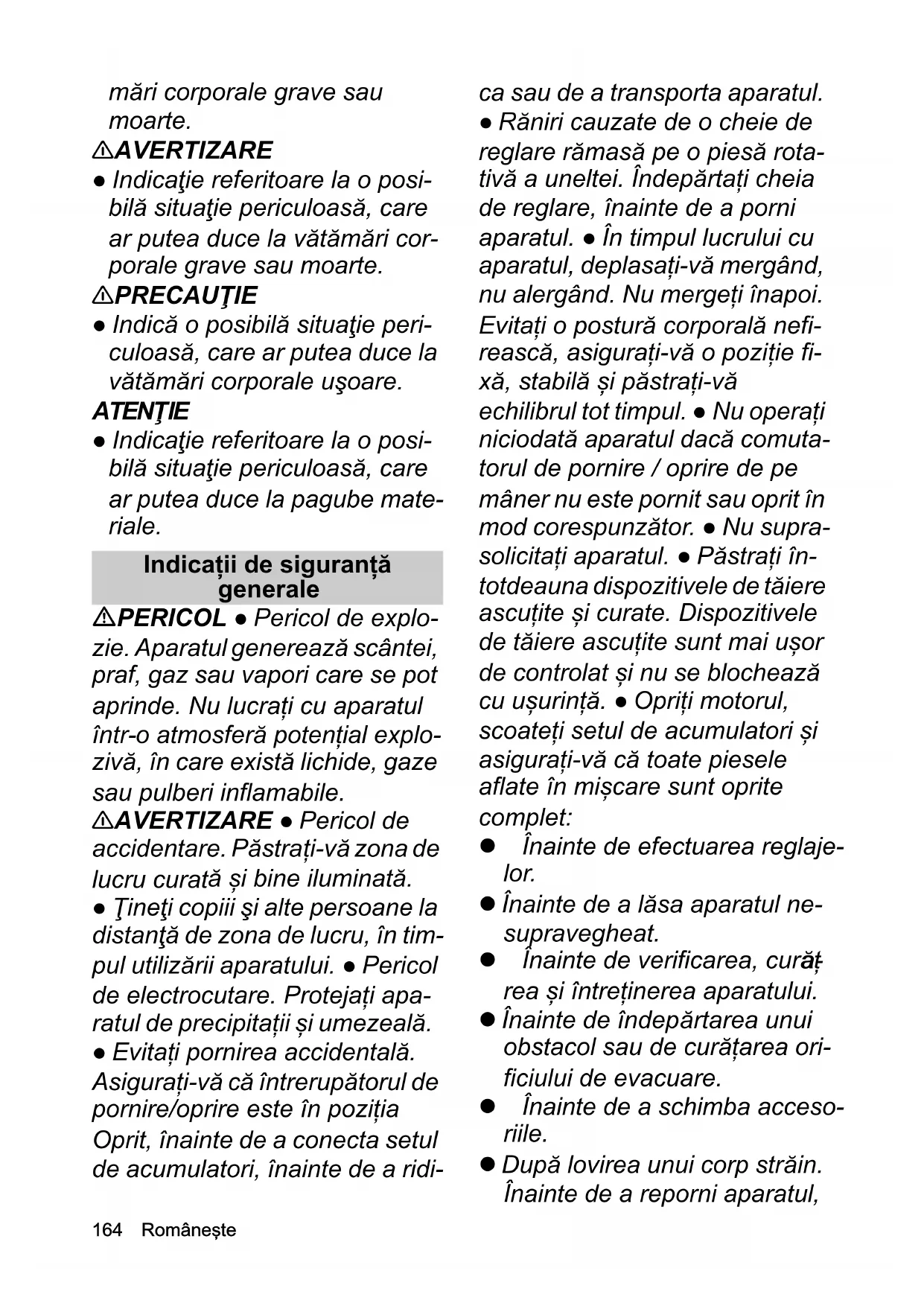 - Declaraţie de conformitate UE 64 Româneşte mări corporale grave sau moarte. 몇 AVERTIZARE ● Indicaţie referitoare la o posi- bilă situaţie periculoasă, care ar putea duce la vătămări cor- porale grave sau moarte. 몇 PRECAUŢIE ● Indică o posibilă situaţie peri- culoasă, care ar putea duce la vătămări corporale uşoare. ATENŢIE ● Indicaţie referitoare la o posi- bilă situaţie periculoasă, care ar putea duce la pagube mate- riale. Indicații de siguranță generale PERICOL ● Pericol de explo- zie. Aparatul generează scântei, praf, gaz sau vapori care se pot aprinde. Nu lucrați cu aparatul într-o atmosferă potențial explo- zivă, în care există lichide, gaze sau pulberi inflamabile. 몇 AVERTIZARE ● Pericol de accidentare. Păstrați-vă zona de lucru curat ă și bine iluminată. ● Ţineţi copiii şi alte persoane la distanţă de zona de lucru, în tim- pul utilizării aparatului. ● Pericol de electrocutare. Protejați apa- ratul de precipitații și umezeală. ● Evitați pornirea accidentală. Asigurați-vă că întrerupătorul de pornire/oprire este în poziția Oprit, înainte de a conecta setul de acumulatori, înainte de a ridi- ca sau de a transporta aparatul. ● Răniri cauzate de o cheie de reglare rămasă pe o piesă rota- tivă a uneltei. Îndepărtați cheia de reglare, înainte de a porni aparatul. ● În timpul lucrului cu aparatul, deplasați-vă mergând, nu alergând. Nu mergeți înapoi. Evitați o postură corporală nefi- rească, asigurați-vă o pozi ție fi- xă, stabilă și păstrați-vă echilibrul tot timpul. ● Nu operați niciodată aparatul dacă comuta- torul de pornire / oprire de pe mâner nu este pornit sau oprit în mod corespunzător. ● Nu supra- solicitați aparatul. ● Păstrați în- totdeauna dispozitivele de tăiere ascuțite și curate. Dispozitivele de tăiere ascuțite sunt mai ușor de controlat și nu se blochează cu ușurință. ● Opriți motorul, scoateți setul de acumulatori și asigurați-vă că toate piesele aflate în mișcare sunt oprite complet: Înainte de efectuarea reglaje- lor. Înainte de a lăsa aparatul ne- supravegheat. Înainte de verificarea, curăț p. 1711