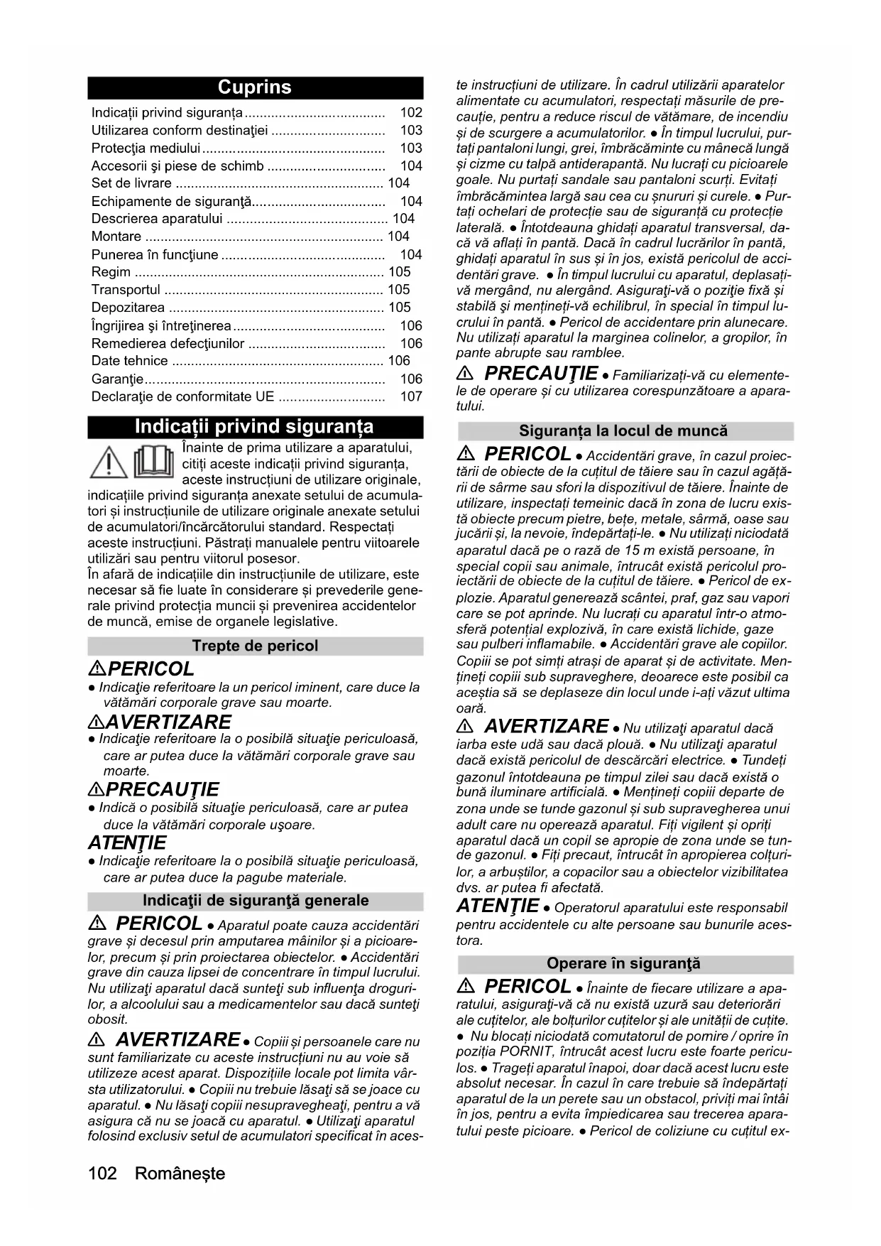 - Masa (bez zestawu akumulato- rów) kg 13,4 Chairman of the Board of Management Director Regulatory Affairs & Certification H. Jenner S. Reiser102 Româneşte Cuprins Indicații privind siguranța Înainte de prima utilizare a aparatului, citiți aceste indicații privind siguranța, aceste instrucțiuni de utilizare originale, indicațiile privind siguranța anexate setului de acumula- tori și instrucțiunile de utilizare originale anexate setului de acumulatori/încărcătorului standard. Respectați aceste instrucțiuni. Păstrați manualele pentru viitoarele utilizări sau pentru viitorul posesor. În afară de indicațiile din instrucțiunile de utilizare, este necesar să fie luate în considerare și prevederile gene- rale privind protecția muncii și prevenirea accidentelor de muncă, emise de organele legislative. Trepte de pericol PERICOL ● Indicaţie referitoare la un pericol iminent, care duce la vătămări corporale grave sau moarte. 몇 AVERTIZARE ● Indicaţie referitoare la o posibilă situaţie periculoasă, care ar putea duce la vătămări corporale grave sau moarte. 몇 PRECAUŢIE ● Indică o posibilă situaţie periculoasă, care ar putea duce la vătămări corporale uşoare. ATENŢIE ● Indicaţie referitoare la o posibilă situaţie periculoasă, care ar putea duce la pagube materiale. Indicaţii de siguranţă generale PERICOL ● Aparatul poate cauza accidentări grave și decesul prin amputarea mâinilor și a picioare- lor, precum și prin proiectarea obiectelor. ● Accidentări grave din cauza lipsei de concentrare în timpul lucrului. Nu utilizaţi aparatul dacă sunteţi sub influenţa droguri- lor, a alcoolului sau a medicamentelor sau dacă sunteţi obosit. 몇 AVERTIZARE ● Copiii și persoanele care nu sunt familiarizate cu aceste instrucțiuni nu au voie să utilizeze acest aparat. Dispozițiile locale pot limita vâr- sta utilizatorului. ● Copiii nu trebuie lăsaţi să se joace cu aparatul. ● Nu lăsaţi copiii nesupravegheaţi, pentru a vă asigura că nu se joacă cu aparatul. ● Utilizaţi aparatul folosind exclusiv setul de acumulatori specificat în aces- te instrucțiuni de utilizare. În cadrul utilizării aparatelor alimentate cu acumulatori, respectați măsurile de pre- cauție, pentru a reduce riscul de vătămare, de incendiu și de scurgere a acumulatorilor. ● În timpul lucrului, pur- tați pantaloni lungi, grei, îmbrăcăminte cu mânecă lungă și cizme cu talpă antiderapantă. Nu lucrați cu picioarele goale. Nu purtați sandale sau pantaloni scurți. Evitați îmbrăcămintea largă sau cea cu șnururi și curele. ● Pur- tați ochelari de protecție sau de siguranță cu protecție laterală. ● Întotdeauna ghidați aparatul transversal, da- că vă aflați în pantă. Dacă în cadrul lucrărilor în pantă, ghidați aparatul în sus și în jos, există pericolul de acci- dentări grave. ● În timpul lucrului cu aparatul, deplasați- vă mergând, nu alergând. Asiguraţi-vă o poziţie fixă și stabilă şi mențineți-vă echilibrul, în special în timpul lu- crului în pantă. ● Pericol de accidentare prin alunecare. Nu utilizați aparatul la marginea colinelor, a gropilor, în pante abrupte sau ramblee. 몇 PRECAUŢIE ● Familiarizați-vă cu elemente- le de operare și cu utilizarea corespunzătoare a apara- tului. Siguranța la locul de muncă PERICOL ● Accidentări grave, în cazul proiec- tării de obiecte de la cuțitul de tăiere sau în cazul agăță- rii de sârme sau sfori la dispozitivul de tăiere. Înainte de utilizare, inspectați temeinic dacă în zona de lucru exis- tă obiecte precum pietre, bețe, metale, sârmă, oase sau jucării și, la nevoie, îndepărtați-le. ● Nu utilizați niciodată aparatul dacă pe o rază de 15 m există persoane, în special copii sau animale, întrucât există pericolul pro- iectării de obiecte de la cuțitul de tăiere. ● Pericol de ex- plozie. Aparatul generează scântei, praf, gaz sau vapori care se pot aprinde. Nu lucrați cu aparatul într-o atmo- sferă potențial explozivă, în care există lichide, gaze sau pulberi inflamabile. ● Accidentări grave ale copiilor. Copiii se pot simți atrași de aparat și de activitate. Men- țineți copiii sub supraveghere, deoarece este posibil ca aceștia să se deplaseze din locul unde i-ați văzut ultima oară. 몇 AVERTIZARE ● Nu utilizaţi aparatul dacă iarba este udă sau dacă plouă. ● Nu utilizaţi aparatul dacă există pericolul de descărcări electrice. ● Tundeți gazonul întotdeauna pe timpul zilei sau dacă există o bună iluminare artificială. ● Mențineți copiii departe de zona unde se tunde gazonul și sub supravegherea unui adult care nu operează aparatul. Fiți vigilent și opriți aparatul dacă un copil se apropie de zona unde se tun- de gazonul. ● Fiți precaut, întrucât în apropierea colțuri- lor, a arbuștilor, a copacilor sau a obiectelor vizibilitatea dvs. ar putea fi afectată. ATENŢIE ● Operatorul aparatului este responsabil pentru accidentele cu alte persoane sau bunurile aces- tora. Operare în siguranţă PERICOL ● Înainte de fiecare utilizare a apa- ratului, asiguraţi-vă că nu există uzură sau deteriorări ale cuțitelor, ale bolțurilor cuțitelor și ale unității de cuțite. ● Nu blocați niciodată comutatorul de pornire / oprire în poziția PORNIT, întrucât acest lucru este foarte pericu- los. ● Trageți aparatul înapoi, doar dacă acest lucru este absolut necesar. În cazul în care trebuie să îndepărtați aparatul de la un perete sau un obstacol, priviți mai întâi în jos, pentru a evita împiedicarea sau trecerea apara- tului peste picioare. ● Pericol de coliziune cu cuțitul ex- Indicații privind siguranța p. 102
