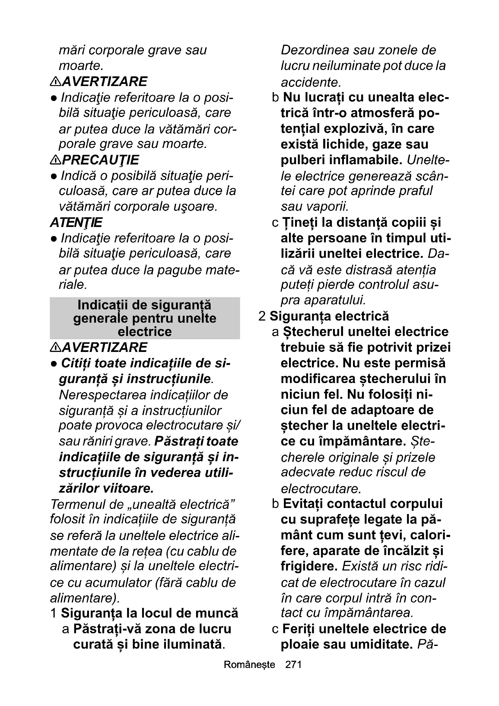 - Declaraţie de conformitate UE Româneşte 271 mări corporale grave sau moarte. 몇 AVERTIZARE ● Indicaţie referitoare la o posi- bilă situaţie periculoasă, care ar putea duce la vătămări cor- porale grave sau moarte. 몇 PRECAUŢIE ● Indică o posibilă situaţie peri- culoasă, care ar putea duce la vătămări corporale uşoare. ATENŢIE ● Indicaţie referitoare la o posi- bilă situaţie periculoasă, care ar putea duce la pagube mate- riale. Indicații de siguranță generale pentru unelte electrice 몇 AVERTIZARE ● Citiți toate indicațiile de si- guranță și instrucțiunile. Nerespectarea indicațiilor de siguranță și a instrucțiunilor poate provoca electrocutare și/ sau răniri grave. P ăstrați toate indicațiile de siguranță și in- strucțiunile în vederea utili- zărilor viitoare. Termenul de „unealtă electrică” folosit în indicațiile de siguranță se referă la uneltele electrice ali- mentate de la rețea (cu cablu de alimentare) și la uneltele electri- ce cu acumulator (fără cablu de alimentare). 1 Siguranța la locul de muncă a Păstrați-vă zona de lucru curată și bine iluminată. Dezordinea sau zonele de lucru neiluminate pot duce la accidente. b Nu lucrați cu unealta elec- trică într-o atmosferă po- tențial explozivă, în care există lichide, gaze sau pulberi inflamabile. Unelte- le electrice generează scân- tei care pot aprinde praful sau vaporii. c Țineți la distanță copiii și alte persoane în timpul uti- lizării uneltei electrice. Da- că vă este distrasă atenția puteți pierde controlul asu- pra aparatului. 2 Siguranța electrică a Ștecherul uneltei electrice trebuie să fie potrivit prizei electrice. Nu este permisă modificarea ștecherului în niciun fel. Nu folosiți ni- ciun fel de adaptoare de ștecher la uneltele electri- ce cu împământare. Ște- cherele originale și prizele adecvate reduc riscul de electrocutare. b Evitați contactul corpului cu suprafețe legate la pă- mânt cum sunt țevi, calori- fere, aparate de încălzit și frigidere. Există un risc ridi- cat de electrocutare în cazul în care corpul intră în con- tact cu împământarea. c Feriți uneltele electrice de ploaie sau umiditate. Pă-272 Româneşte trunderea apei într-o unealtă electrică crește riscul de electrocutare. d Nu folosiți niciodată cablul în alte scopuri decât cele prevăzute, pentru a trans- porta, suspenda unealta electrică sau pentru a scoate ștecherul din priză. Feriți cablul de căldură, ulei, muchii ascuțite sau componente aflate în miș- care. Cablurile de conectare deteriorate sau răsucite cresc riscul de electrocutare. e Dacă lucrați în aer liber cu o unealtă electrică, folosiți numai cabluri prelungitoa- re adecvate și pentru folo- sirea în meniul exterior. Folosirea unui cablu prelun- gitor adecvat pentru mediul exterior reduce riscul de electrocutare. f Dacă nu se poate evita uti- lizarea uneltei electrice în mediu umed, folosiți un în- trerupător de protecție îm- potriva curenților reziduali. Utilizarea unui în- trerupător de protecție împo- triva curenților reziduali reduce riscul de electrocuta- re. 3 Siguranța persoanelor a Fiți atenți, aveți grijă la ce- ea ce faceți și procedați în mod rațional atunci când lucrați cu o unealtă electri- că. Nu folosiți o unealtă electrică dacă sunteți obo- sit sau vă aflați sub influ- ența drogurilor, alcoolului sau a medicamentelor. Un moment de neatenție în tim- pul utilizării uneltei electrice poate duce la răniri grave. b Purtați echipament indivi- dual de protecție și întot- deauna o pereche de ochelari de protecție. Pur- tarea de echipament indivi- dual de protecție, precum masca de praf, încălțămin- tea de siguranță antidera- pantă, casca de protecție sau protecția auditivă, în funcție de tipul și utilizarea uneltei electrice, reduce ris- cul de rănire. c Evitați o punere în funcțiu- ne accidentală. Asigurați- vă că unealta electrică es- te oprită înainte de a o co- necta la rețeaua de alimentare și/sau la acu- mulator, înainte de a o ridi- ca sau transporta. Dacă atunci când transportați unealta electrică țineți dege- tul pe întrerupător sau apa- ratul este conectat la rețeaua de alimentare, se pot produce accidente. d Îndepărtați unealta de re- glare sau cheia de strâns șuruburi, înainte de a por- ni unealta electrică. ORomâneşte 273 unealtă sau o cheie rămasă într-o piesă a aparatului care se rotește poate duce la ră- niri. e Evitați o postură corporală nefirească. Asigurați-vă o poziție stabilă și păstrați- vă echilibrul tot timpul. Astfel puteți controla mai bi- ne unealta electrică în situa- ții neprevăzute. f Purtați îmbrăcăminte adecvată. Nu purtați haine largi sau bijuterii. Țineți-vă părul, hainele și încălță- mintea departe de piesele aflate în mișcare. Hainele largi, mănușile, bijuteriile sau părul lung pot fi prinse în piesele aflate în mișcare. g Dacă se pot monta instala- ții de aspirare și de colec- tare a prafului, asigurați- vă că acestea sunt racor- date și utilizate în mod co- rect. Folosirea unei instalații de aspirare a prafului poate reduce riscurile cauzate de praf. 4 Utilizarea și manipularea uneltelor electrice a Nu suprasolicitați apara- tul. Pentru lucrarea dum- neavoastră, folosiți unealta electrică destinată acelui scop. Cu o unealtă electrică adecvată lucrați mai bine și mai sigur în do- meniul de performanță indi- cat. b Nu folosiți o unealtă elec- trică al cărei întrerupător este defect. O unealtă elec- trică, care nu mai poate fi pornită sau oprită, este peri- culoasă și trebuie reparată. c Scoateți ștecherul afară din priză și/sau îndepărtați acumulatorul, înainte de a efectua reglaje la aparat, înainte de a schimba acce- soriile sau de a pune apa- ratul deoparte. Această măsură de precauție împie- dică