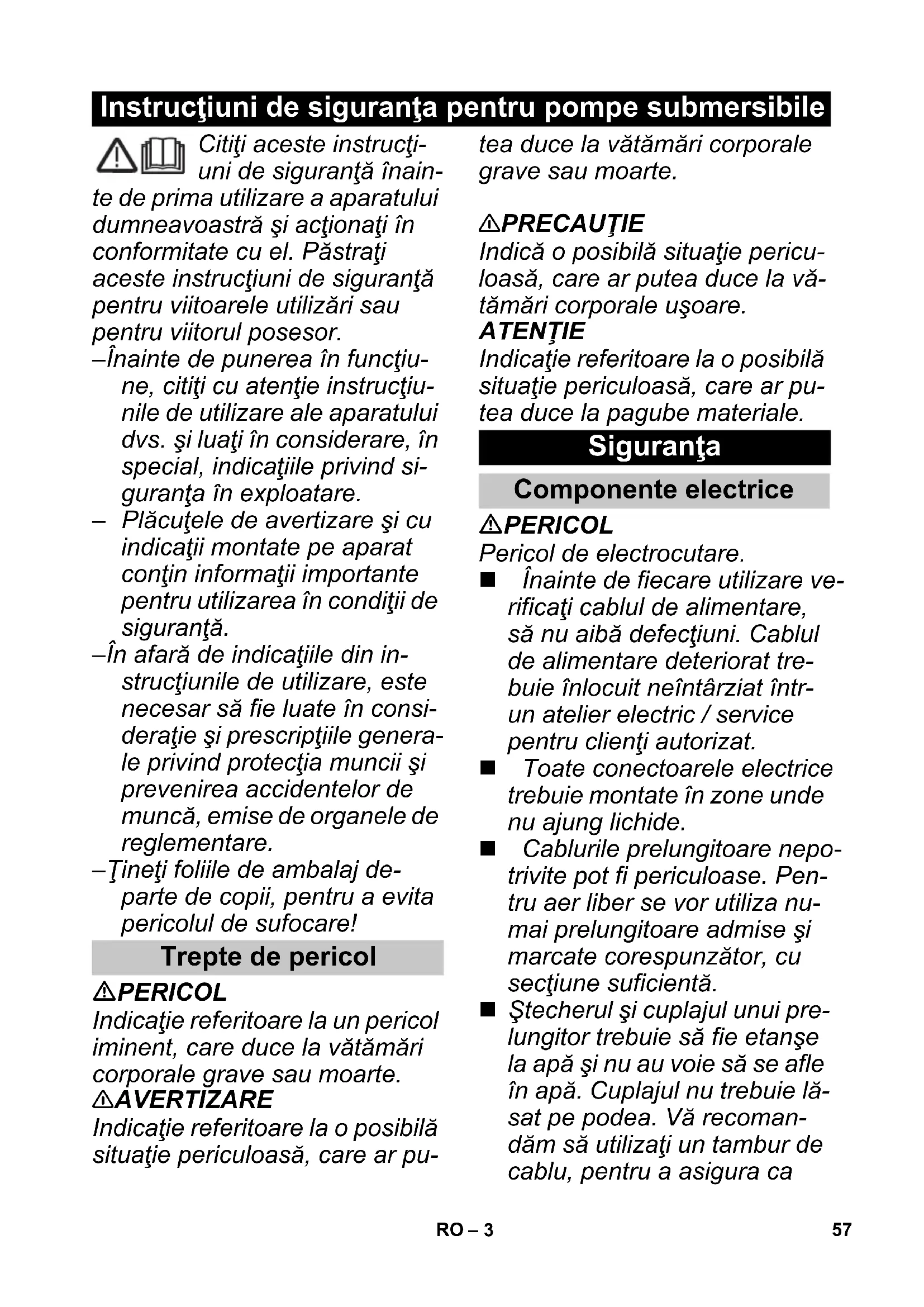 W Austrii pompy używane w basenach pływackich i sta- wach ogrodowych, wyposa- żone w stały przewód łączą- cy, muszą być zasilane zgod- nie z ÖVE B/EN 60555 cz. 1 do 3 poprzez transformator izolacyjny atestowany przez ÖVE, przy czym napięcie znamionowe sekundarne nie może przekraczać 230 V. Przyłącze elektryczne może być wykonane jedynie przez specjalistę elektryka. Przy tym należy przestrzegać od- nośnych krajowych przepi- sów! 몇 OSTRZEŻENIE Niniejsze urządzenie nie jest przewidziane do użytkowania przez osoby o ograniczonych możliwościach fizycznych, sensorycznych lub mental- nych albo takie, którym bra- kuje doświadczenia i/lub wie- dzy na temat jego używania, Bezpieczna obsługa 55PL– 5 chyba że są one nadzorowa- ne przez osobę odpowie- dzialną za ich bezpieczeń- stwo i otrzymały od niej wska- zówki na temat użytkowania urządzenia oraz istniejących zagrożeń. Dzieci mogą użytkować urzą- dzenie tylko wtedy, gdy mają ponad 8 lat i gdy są one nad- zorowane przez osobę odpo- wiedzialną za ich bezpie- czeństwo lub otrzymały od niej wskazówki na temat użyt- kowania urządzenia i zrozu- miały zaistniałe wskutek tego zagrożenia. Dzieci nie mogą się bawić tym urządzeniem. Dzieci powinny być nadzoro- wane, żeby zapewnić, iż nie bawią się urządzeniem. Czyszczenie i konserwacja nie może być przeprowadza- na przez dzieci bez nadzoru. Przed przystąpienie do kon- serwacji urządzenie wyłączyć i wyjąć wtyczkę z gniazdka sieciowego. 몇 OSTROŻNIE Przed jakimikolwiek czynnoś- ciami wykonywanymi przy urządzeniu lub przy jego uży- ciu, należy zapewnić statecz- ność, w celu uniknięcia wy- padków wzgl. uszkodzeń urządzenia. W celu uniknięcia wypadków wzgl. zranień przy transpor- cie należy uwzględnić ciężar urządzenia (patrz dane tech- niczne). W celu uniknięcia wypadków lub zranień przy wyborze miejsca przechowywania urządzenia, należy uwzględ- nić jego ciężar (patrz dane techniczne). NIEBEZPIECZEŃSTWO zagrożenia wybuchem Nie przet łaczać materiałów żrących, łatwopalnych lub wybuchowych (np. nafta, benzyna, kwasy lub rozcień- czalnik nitro). Nie eksploatować urządzenia w otoczeniu zagrożonym po- żarem lub wybuchem. 몇 OSTROŻNIE Woda, która tłoczona jest przez to urządzenie, nie jest wodą pitną! UWAGA Urządzenie może ulec uszko- dzeniu. Nie tłoczyć smarów, olejów ani wody słonej. Nie tłoczyć ścieków z toalet ani wody zamulonej, która ma mniejszą płynność niż czysta woda. Nie tłoczyć wody o tempera- turze wyższej od 35°C. Inne niebezpieczeństwa 56 PL– 3 Citiţi aceste instrucţi- uni de siguranţă înain- te de prima utilizare a aparatului dumneavoastră şi acţionaţi în conformitate cu el. Păstraţi aceste instrucţiuni de siguranţă pentru viitoarele utilizări sau pentru viitorul posesor. – Înainte de punerea în funcţiu- ne, citiţi cu atenţie instrucţiu- nile de utilizare ale aparatului dvs. şi luaţi în considerare, în special, indicaţiile privind si- guranţa în exploatare. – Plăcuţele de avertizare şi cu indicaţii montate pe aparat conţin informaţii importante pentru utilizarea în condiţii de siguranţă. – În afară de indicaţiile din in- strucţiunile de utilizare, este necesar să fie luate în consi- deraţie şi prescripţiile genera- le privind protecţia muncii şi prevenirea accidentelor de muncă, emise de organele de reglementare. – Ţineţi foliile de ambalaj de- parte de copii, pentru a evita pericolul de sufocare! PERICOL Indicaţie referitoare la un pericol iminent, care duce la vătămări corporale grave sau moarte. 몇 AVERTIZARE Indicaţie referitoare la o posibilă situaţie periculoasă, care ar pu- tea duce la vătămări corporale grave sau moarte. 몇 PRECAUŢIE Indică o posibilă situaţie pericu- loasă, care ar putea duce la vă- tămări corporale uşoare. ATENŢIE Indicaţie referitoare la o posibilă situaţie periculoasă, care ar pu- tea duce la pagube materiale. PERICOL Pericol de electrocutare. Înainte de fiecare utilizare ve- rificaţi cablul de alimentare, să nu aibă defecţiuni. Cablul de alimentare deteriorat tre- buie înlocuit neîntârziat într- un atelier electric / service pentru clienţi autorizat. Toate conectoarele electrice trebuie montate în zone unde nu ajung lichide. Cablurile prelungitoare nepo- trivite pot fi periculoase. Pen- tru aer liber se vor utiliza nu- mai prelungitoare admise şi marcate corespunzător, cu secţiune suficientă. Ştecherul şi cuplajul unui pre- lungitor trebuie să fie etanşe la apă şi nu au voie să se afle în apă. Cuplajul nu trebuie lă- sat pe podea. Vă recoman- dăm să utilizaţi un tambur de cablu, pentru a asigura ca Instrucţiuni de siguranţa pentru pompe submersibile Trepte de pericol Siguranţa Componente electrice 57RO– 4 ştecherele să se afle la cel puţin 60 mm deasupra pode- lei. Nu utilizaţi cablul de racorda- re la reţea pentru a transporta sau fixa aparatul. Pentru a decupla aparatul de la reţeaua de curent, nu tra- geţi de cablul de alimentare, ci de ştecher. Nu trageţi cablul de racordare la reţea peste muchii ascuţite şi nu-l striviţi. Tensiunea indicată pe plăcu- ţa de tip trebuie să corespun- dă tensiunii sursei de curent. Pentru a evita pericolele, re- paraţiile şi montarea pieselor de schimb se vor face doar de service-ul autorizat. Pompele trebuie alimentate de la prize prevăzute cu un comutator de protecţie împo- triva curenţilor reziduali având o intensitate de de- clanşare de 30 mA (împă- mântare). Verificaţi regulat comutatorul de protecţie împotriva curen- ţilor reziduali şi conductorul de protecţie (împământarea). Nu puneţi pompele în funcţio- nare, dac ă în piscină sau iaz se află persoane. Nu atingeţi lichidele pompate, cablul fixat la mânerul de transport şi obiectele care se află în contact cu lichidele pompate (de ex. conductele sau păr