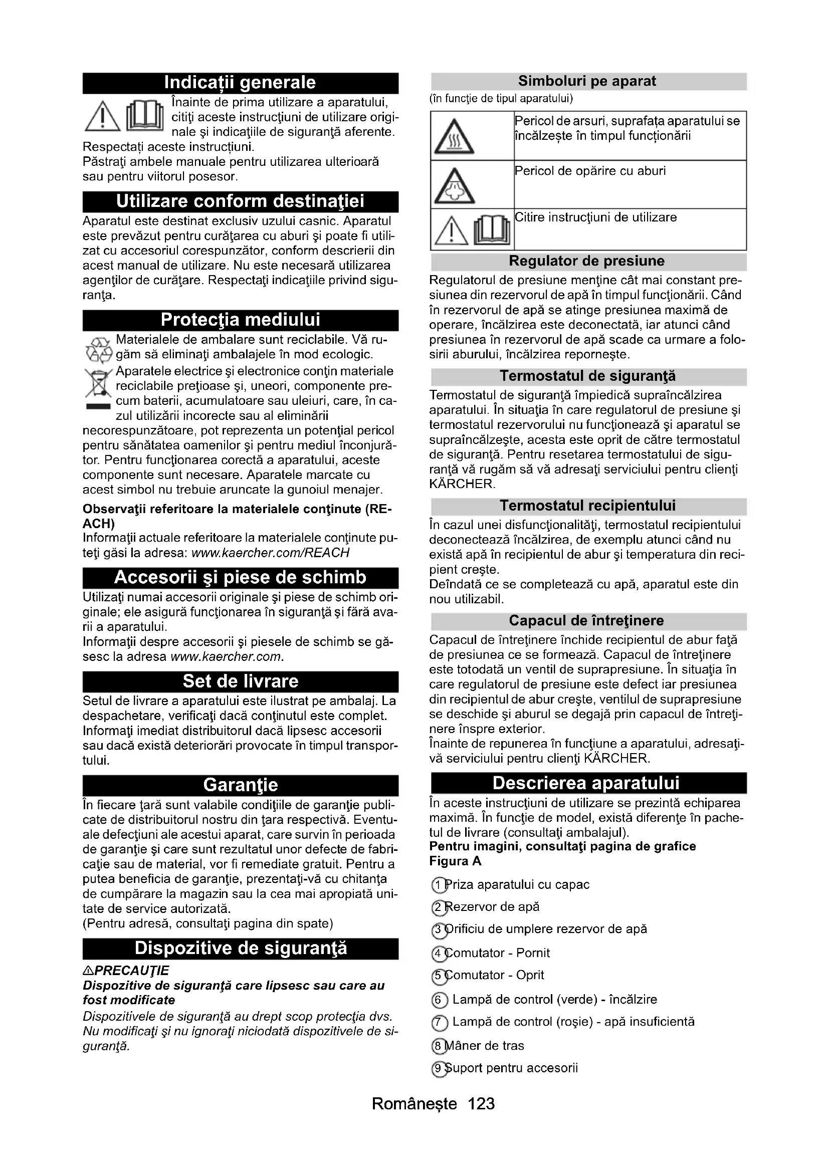 - Date tehnice Româneşte 123 Indicații generale Înainte de prima utilizare a aparatului, citiţi aceste instrucţiuni de utilizare origi- nale şi indicaţiile de siguranţă aferente. Respectați aceste instrucțiuni. Păstraţi ambele manuale pentru utilizarea ulterioară sau pentru viitorul posesor. Utilizare conform destinaţiei Aparatul este destinat exclusiv uzului casnic. Aparatul este prevăzut pentru curăţarea cu aburi şi poate fi utili- zat cu accesoriul corespunzător, conform descrierii din acest manual de utilizare. Nu este necesară utilizarea agenţilor de curăţare. Respectaţi indicaţiile privind sigu- ranţa. Protecţia mediului Materialele de ambalare sunt reciclabile. Vă ru- găm să eliminaţi ambalajele în mod ecologic. Aparatele electrice şi electronice conţin materiale reciclabile preţioase şi, uneori, componente pre- cum baterii, acumulatoare sau uleiuri, care, în ca- zul utilizării incorecte sau al eliminării necorespunzătoare, pot reprezenta un potenţial pericol pentru sănătatea oamenilor şi pentru mediul înconjură- tor. Pentru funcţionarea corectă a aparatului, aceste componente sunt necesare. Aparatele marcate cu acest simbol nu trebuie aruncate la gunoiul menajer. Observaţii referitoare la materialele conţinute (RE- ACH) Informaţii actuale referitoare la materialele conţinute pu- teţi găsi la adresa: www.kaercher.com/REACH Accesorii şi piese de schimb Utilizaţi numai accesorii originale şi piese de schimb ori- ginale; ele asigură funcţionarea în siguranţă şi fără ava- rii a aparatului. Informaţii despre accesorii şi piesele de schimb se gă- sesc la adresa www.kaercher.com. Set de livrare Setul de livrare a aparatului este ilustrat pe ambalaj. La despachetare, verificaţi dacă conţinutul este complet. Informaţi imediat distribuitorul dacă lipsesc accesorii sau dacă există deteriorări provocate în timpul transpor- tului. Garanţie În fiecare ţară sunt valabile condiţiile de garanţie publi- cate de distribuitorul nostru din ţara respectivă. Eventu- ale defecţiuni ale acestui aparat, care survin în perioada de garanţie şi care sunt rezultatul unor defecte de fabri- caţie sau de material, vor fi remediate gratuit. Pentru a putea beneficia de garanţie, prezentaţi-vă cu chitanţa de cumpărare la magazin sau la cea mai apropiată uni- tate de service autorizată. (Pentru adresă, consultaţi pagina din spate) Dispozitive de siguranţă 몇 PRECAUŢIE Dispozitive de siguranţă care lipsesc sau care au fost modificate Dispozitivele de siguranţă au drept scop protecţia dvs. Nu modificaţi şi nu ignoraţi niciodată dispozitivele de si- guranţă. Simboluri pe aparat (în funcţie de tipul aparatului) Regulator de presiune Regulatorul de presiune menţine cât mai constant pre- siunea din rezervorul de apă în timpul funcţionării. Când în rezervorul de apă se atinge presiunea maximă de operare, încălzirea este deconectată, iar atunci când presiunea în rezervorul de apă scade ca urmare a folo- sirii aburului, încălzirea reporneşte. Termostatul de siguranţă Termostatul de siguranţă împiedică supraîncălzirea aparatului. În situaţia în care regulatorul de presiune şi termostatul rezervorului nu funcţionează şi aparatul se supraîncălzeşte, acesta este oprit de către termostatul de siguranţă. Pentru resetarea termostatului de sigu- ranţă vă rugăm să vă adresaţi serviciului pentru clienţi KÄRCHER. Termostatul recipientului În cazul unei disfuncţionalităţi, termostatul recipientului deconectează încălzirea, de exemplu atunci când nu există apă în recipientul de abur şi temperatura din reci- pient creşte. Deîndată ce se completează cu apă, aparatul este din nou utilizabil. Capacul de întreţinere Capacul de întreţinere închide recipientul de abur faţă de presiunea ce se formează. Capacul de întreţinere este totodată un ventil de suprapresiune. În situaţia în care regulatorul de presiune este defect iar presiunea din recipientul de abur creşte, ventilul de suprapresiune se deschide şi aburul se degajă prin capacul de întreţi- nere înspre exterior. Înainte de repunerea în funcţiune a aparatului, adresaţi- vă serviciului pentru clienţi KÄRCHER. Descrierea aparatului În aceste instrucţiuni de utilizare se prezintă echiparea maximă. În funcţie de model, există diferenţe în pache- tul de livrare (consultaţi ambalajul). Pentru imagini, consultaţi pagina de grafice Figura A 1 Priza aparatului cu capac 2 Rezervor de apă 3 Orificiu de umplere rezervor de apă 4 Comutator - Pornit 5 Comutator - Oprit 6 Lampă de control (verde) - încălzire 7 Lampă de control (roşie) - apă insuficientă 8 Mâner de tras 9 Suport pentru accesorii Pericol de arsuri, suprafața aparatului se încălzește în timpul funcționării Pericol de opărire cu aburi Citire instrucţiuni de utilizare124 Româneşte 10 Suport pentru accesorii 11 Capacul de întreţinere 12 Depozitare a conductei de racordare la reţea 13 Suport pentru menţinerea poziţiei duzei pentru po- dea 14 Cablu de alimentare cu ştecăr 15 Roţi deplasare aparat (2 bucăţi) 16 Rolă de ghidaj 17 Pistol cu abur 18 Manetă de abur 19 Buton de deblocare 20 Comutator de selectare a cantităţii de abur (cu dis- pozitiv de siguranţă pentru copii) 21 Furtun de abur 22 Fişă de conectare abur 23 Duză cu jet punctiform 24 Peria rotundă (mică) 25 **Duza de putere 26 **Peria rotundă (mare) 27 Duză manuală 28 Husă din microfibră pentru duza manuală 29 Conducte de extensie (2 bucăţi) 30 Buton de deblocare 31 Duză pentru podea 32 Sistem de îmbinare cu scai 33 Lavetă din microfibră (1 bucată) 34 **Lavetă din microfibră (2 bucăţi) 35 **Glisor pentru covoare 36 Agent de detartrare 37 Fier de călcat cu abur sub presiune 38 Lampă de control (portocalie) - încălzire 39 Comutator abur (jos) 40 Fişă de conectare abur ** opţional Montare Montarea accesoriil