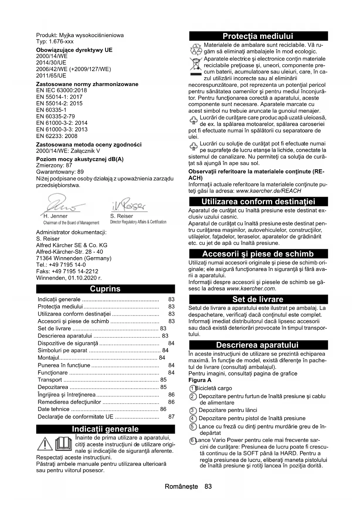 - dB(A) 89Româneşte 83 Produkt: Myjka wysokociśnieniowa Typ: 1.676-xxx Obowiązujące dyrektywy UE 2000/14/WE 2014/30/UE 2006/42/WE (+2009/127/WE) 2011/65/UE Zastosowane normy zharmonizowane EN IEC 63000:2018 EN 55014-1: 2017 EN 55014-2: 2015 EN 60335-1 EN 60335-2-79 EN 61000-3-2: 2014 EN 61000-3-3: 2013 EN 62233: 2008 Zastosowana metoda oceny zgodności 2000/14/WE: Załącznik V Poziom mocy akustycznej dB(A) Zmierzony: 87 Gwarantowany: 89 Niżej podpisane osoby działają z upoważnienia zarządu przedsiębiorstwa. Administrator dokumentacji: S. Reiser Alfred Kärcher SE & Co. KG Alfred-Kärcher-Str. 28 - 40 71364 Winnenden (Germany) Tel.: +49 7195 14-0 Faks: +49 7195 14-2212 Winnenden, 01.10.2020 r. Cuprins Indicații generale Înainte de prima utilizare a aparatului, citiţi aceste instrucţiuni de utilizare origi- nale şi indicaţiile de siguranţă aferente. Respectați aceste instrucțiuni. Păstraţi ambele manuale pentru utilizarea ulterioară sau pentru viitorul posesor. Protecţia mediului Materialele de ambalare sunt reciclabile. Vă ru- găm să eliminaţi ambalajele în mod ecologic. Aparatele electrice şi electronice conţin materiale reciclabile preţioase şi, uneori, componente pre- cum baterii, acumulatoare sau uleiuri, care, în ca- zul utilizării incorecte sau al eliminării necorespunzătoare, pot reprezenta un potenţial pericol pentru sănătatea oamenilor şi pentru mediul înconjură- tor. Pentru funcţionarea corectă a aparatului, aceste componente sunt necesare. Aparatele marcate cu acest simbol nu trebuie aruncate la gunoiul menajer. Lucrări de curăţare care produc apă uzată uleioasă, de ex. la spălarea motoarelor, spălarea caroseriei pot fi efectuate numai în spălătorii cu separatoare de ulei. Lucrări cu soluţie de curăţat pot fi efectuate numai pe suprafeţe de lucru etanşe la lichide, conectate la sistemul de canalizare. Nu permiteţi ca soluţia de cură- ţat să ajungă în ape sau sol. Observaţii referitoare la materialele conţinute (RE- ACH) Informaţ ii actuale referitoare la materialele conţinute pu- teţi găsi la adresa: www.kaercher.de/REACH Utilizarea conform destinaţiei Aparatul de curăţat cu înaltă presiune este destinat ex- clusiv uzului casnic. Aparatul de curăţat cu înaltă presiune este destinat pen- tru curăţarea maşinilor, autovehiculelor, construcţiilor, utilajelor, faţadelor, teraselor, aparatelor de grădinărit etc. cu jet de apă cu înaltă presiune. Accesorii şi piese de schimb Utilizaţi numai accesorii originale şi piese de schimb ori- ginale; ele asigură funcţionarea în siguranţă şi fără ava- rii a aparatului. Informaţii despre accesorii şi piesele de schimb se gă- sesc la adresa www.kaercher.com. Set de livrare Setul de livrare a aparatului este ilustrat pe ambalaj. La despachetare, verificaţi dacă conţinutul este complet. Informaţi imediat distribuitorul dacă lipsesc accesorii sau dacă există deteriorări provocate în timpul transpor- tului. Descrierea aparatului În aceste instrucţiuni de utilizare se prezintă echiparea maximă. În funcţie de model, există diferenţe în pache- tul de livrare (consultaţi ambalajul). Pentru imagini, consultați pagina de grafice Figura A 1 Bicicletă cargo 2 Depozitare pentru furtun de înaltă presiune şi cablu de alimentare 3 Depozitare pentru lănci 4 Depozitare pentru pistol de înaltă presiune 5 Lance cu freză cu dinţi pentru murdărie greu de în- depărtat 6 Lance Vario Power pentru cele mai frecvente sar- cini de curăţare: Presiunea de lucru poate fi crescu- tă continuu de la SOFT până la HARD. Pentru a regla presiunea de lucru, eliberaţi maneta pistolului de înaltă presiune şi rotiţi lancea în poziţia dorită. Indicații generale p. 83