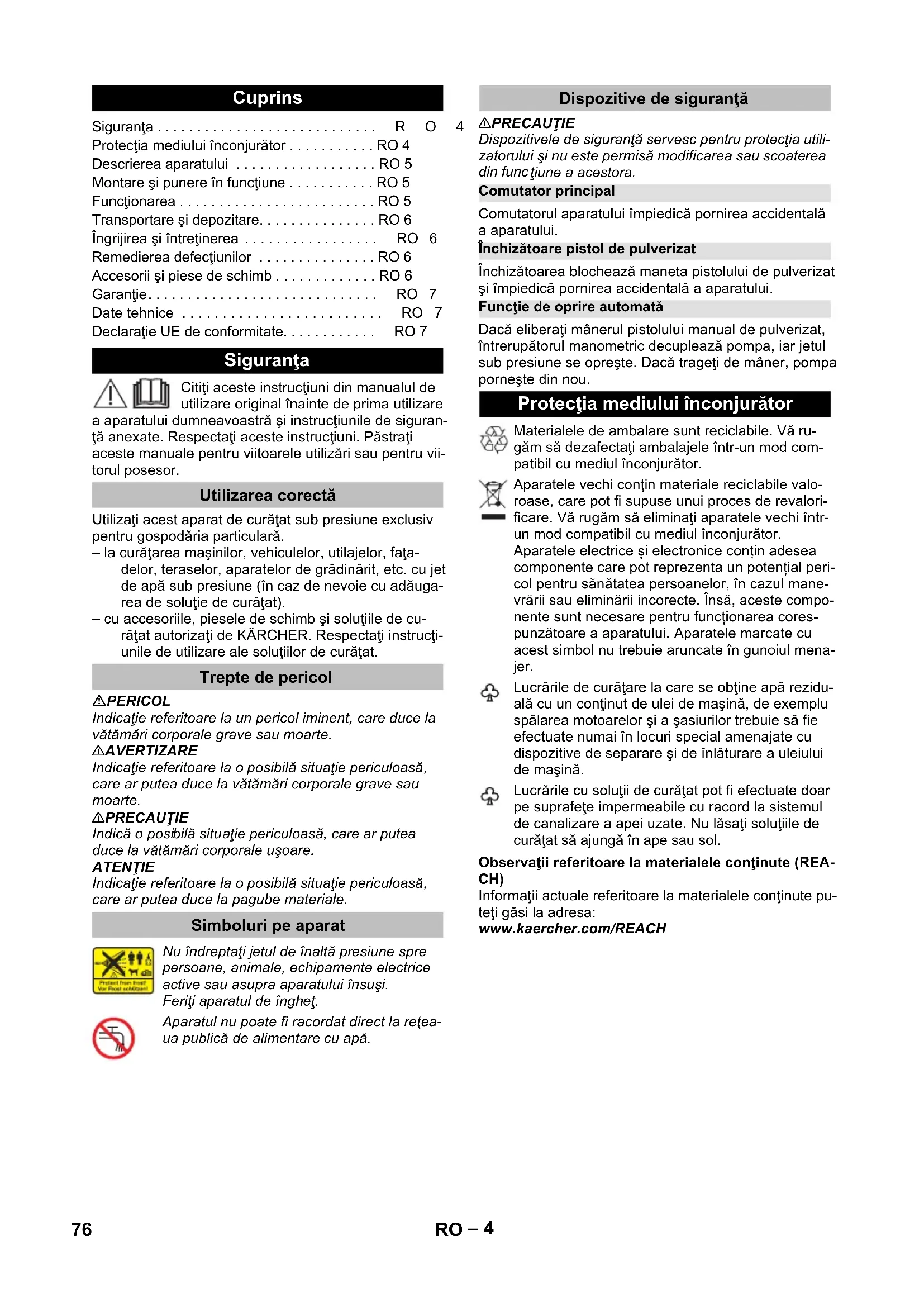 93 dB(A) Zastrzega się prawo wprowadzania zmian technicznych. Deklaracja zgodności UE Produkt: Myjka wysokociśnieniowa Typ: 1.673-xxx Obowiązujące dyrektywy UE 2011/65/UE 2000/14/WE 2006/42/WE (+2009/127/WE) 2014/30/UE Zastosowane normy zharmonizowane EN 60335–1 EN 60335–2–79 EN 62233: 2008 EN 55014–1:2017 EN 55014–2: 2015 EN 61000–3–2: 2014 EN 61000–3–3: 2013 EN IEC 63000: 2018 Zastosowana metoda oceny zgodności 2000/14/WE: Załącznik V Poziom mocy akustycznej dB(A) Zmierzony: 90 Gwarantowany: 93 Chairman of the Board of Management Director Regulatory Affairs & Certification 75PL– 4 Citiţi aceste instrucţiuni din manualul de utilizare original înainte de prima utilizare a aparatului dumneavoastră şi instrucţiunile de siguran- ţă anexate. Respectaţi aceste instrucţiuni. Păstraţi aceste manuale pentru viitoarele utilizări sau pentru vii- torul posesor. Utilizaţi acest aparat de curăţat sub presiune exclusiv pentru gospodăria particulară. – la curăţarea maşinilor, vehiculelor, utilajelor, faţa- delor, teraselor, aparatelor de grădinărit, etc. cu jet de apă sub presiune (în caz de nevoie cu adăuga- rea de soluţie de curăţat). – cu accesoriile, piesele de schimb şi soluţiile de cu- răţat autorizaţi de KÄRCHER. Respectaţi instrucţi- unile de utilizare ale soluţiilor de curăţat. PERICOL Indicaţie referitoare la un pericol iminent, care duce la vătămări corporale grave sau moarte. 몇 AVERTIZARE Indicaţie referitoare la o posibilă situaţie periculoasă, care ar putea duce la vătămări corporale grave sau moarte. 몇 PRECAUŢIE Indică o posibilă situaţie periculoasă, care ar putea duce la vătămări corporale uşoare. ATENŢIE Indicaţie referitoare la o posibilă situaţie periculoasă, care ar putea duce la pagube materiale. 몇 PRECAUŢIE Dispozitivele de siguranţă servesc pentru protecţia utili- zatorului şi nu este permisă modificarea sau scoaterea din func ţiune a acestora. Comutatorul aparatului împiedică pornirea accidentală a aparatului. Închizătoarea blochează maneta pistolului de pulverizat şi împiedică pornirea accidentală a aparatului. Dacă eliberaţi mânerul pistolului manual de pulverizat, întrerupătorul manometric decuplează pompa, iar jetul sub presiune se opreşte. Dacă trageţi de mâner, pompa porneşte din nou. Observaţii referitoare la materialele conţinute (REA- CH) Informaţii actuale referitoare la materialele conţinute pu- teţi găsi la adresa: www.kaercher.com/REACH Cuprins Siguranţa . . . . . . . . . . . . . . . . . . . . . . . . . . . .RO4 Protecţia mediului înconjurător . . . . . . . . . . . RO 4 Descrierea aparatului . . . . . . . . . . . . . . . . . . RO 5 Montare şi punere în funcţiune . . . . . . . . . . . RO 5 Funcţionarea . . . . . . . . . . . . . . . . . . . . . . . . . RO 5 Transportare şi depozitare. . . . . . . . . . . . . . . RO 6 Îngrijirea şi întreţinerea . . . . . . . . . . . . . . . . . RO 6 Remedierea defecţiunilor . . . . . . . . . . . . . . . RO 6 Accesorii şi piese de schimb . . . . . . . . . . . . . RO 6 Garanţie. . . . . . . . . . . . . . . . . . . . . . . . . . . . . RO 7 Date tehnice . . . . . . . . . . . . . . . . . . . . . . . . . RO7 Declaraţie UE de conformitate. . . . . . . . . . . . RO 7 Siguranţa Utilizarea corectă Trepte de pericol Simboluri pe aparat Nu îndreptaţi jetul de înaltă presiune spre persoane, animale, echipamente electrice active sau asupra aparatului însuşi. Feriţi aparatul de îngheţ. Aparatul nu poate fi racordat direct la reţea- ua publică de alimentare cu apă. Dispozitive de siguranţă Comutator principal Închizătoare pistol de pulverizat Funcţie de oprire automată Protecţia mediului înconjurător Materialele de ambalare sunt reciclabile. Vă ru- găm să dezafectaţi ambalajele într-un mod com- patibil cu mediul înconjurător. Aparatele vechi conţin materiale reciclabile valo- roase, care pot fi supuse unui proces de revalori- ficare. Vă rugăm să eliminaţi aparatele vechi într- un mod compatibil cu mediul înconjurător. Aparatele electrice și electronice conțin adesea componente care pot reprezenta un potențial peri- col pentru sănătatea persoanelor, în cazul mane- vrării sau eliminării incorecte. Însă, aceste compo- nente sunt necesare pentru funcționarea cores- punzătoare a aparatului. Aparatele marcate cu acest simbol nu trebuie aruncate în gunoiul mena- jer. Lucrările de curăţare la care se obţine apă rezidu- ală cu un conţinut de ulei de maşină, de exemplu spălarea motoarelor şi a şasiurilor trebuie să fie efectuate numai în locuri special amenajate cu dispozitive de separare şi de înlăturare a uleiului de maşină. Lucrările cu soluţii de curăţat pot fi efectuate doar pe suprafeţe impermeabile cu racord la sistemul de canalizare a apei uzate. Nu lăsaţi soluţiile de curăţat să ajungă în ape sau sol. 76 RO– 5 Setul de livrare a aparatului (în funcţie de model) este ilustrat pe ambalaj. Acest manual de utilizare descrie toate opţiunile posibile. Pentru figuri, vezi paginile cu grafice 1 Racord de presiune înaltă 2 Comutatorul aparatului „0/OFF“ / „I/ON“ 3 Spaţiu de depozitare pentru furtunul de presiune 4 Mâner pentru transport 5 Spaţiu de depozitare pentru lance 6 Racord de apă cu sită inclusă 7 Piesă de cuplare pentru conexiunea de apă 8 Cablu de reţea cu ştecher 9 Plăcuţa de tip 10 Pistol de pulverizat sub presiune 11 Închizătoare pistol de pulverizat 12 Furtun de înaltă presiune 13 Cleme pentru furtunul de înaltă presiune 14 Lancea cu duză cvadruplă Pentru operaţiuni de curăţare normale. 15 Lance cu freză pentru murdărie Pentru murdărie persistentă Pentru figuri, vezi paginile cu grafice Figură Înainte de punerea în funcţiune montaţi piesele ne- fixate, livrate împreună cu aparatul. Amplasaţi aparatul pe o suprafaţă plană. Figură Scoateţi clemele pistolului de