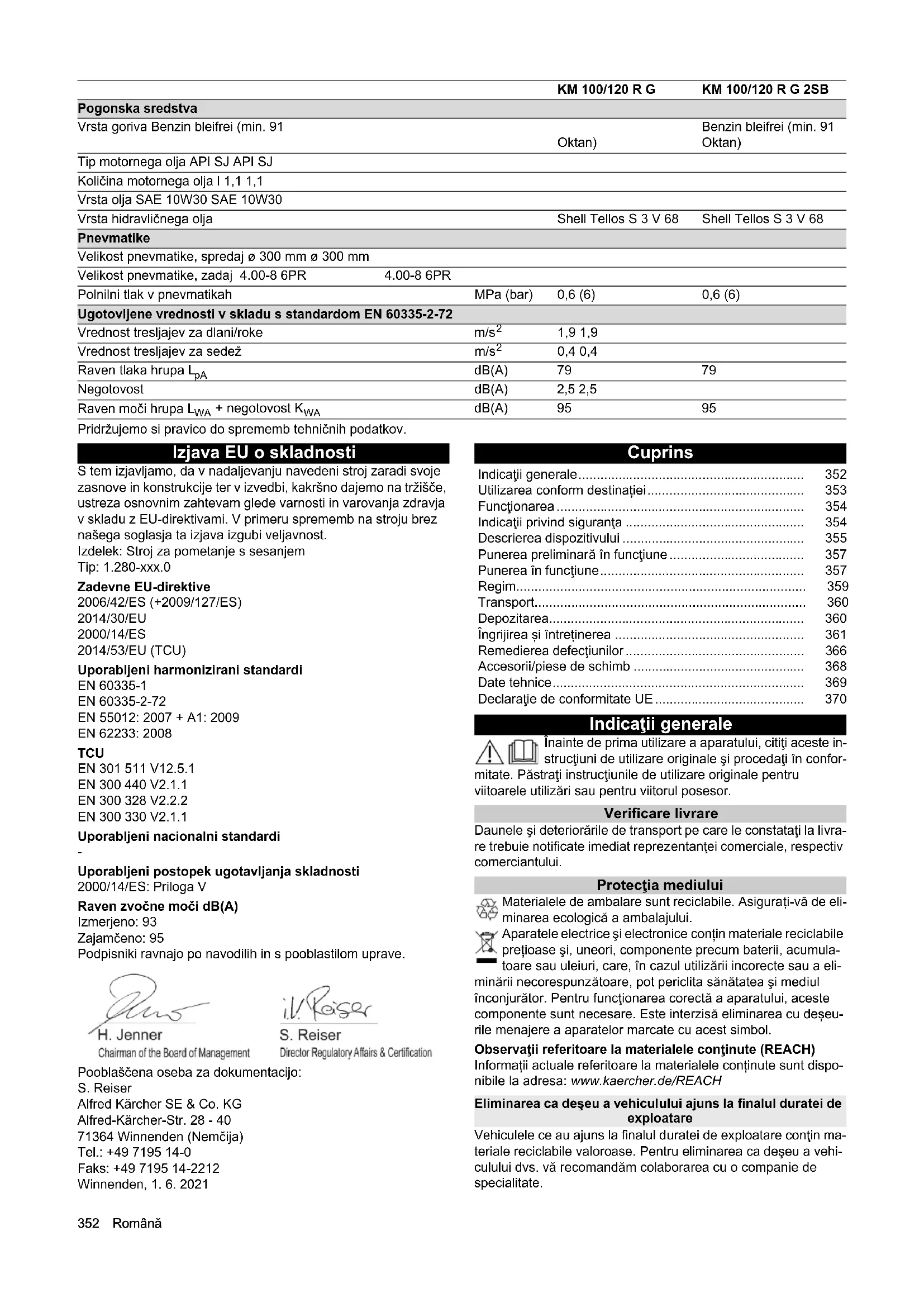 Uporabljeni postopek ugotavljanja skladnosti 2000/14/ES: Priloga V Raven zvočne moči dB(A) Izmerjeno: 93 Zajamčeno: 95 Podpisniki ravnajo po navodilih in s pooblastilom uprave. Pooblaščena oseba za dokumentacijo: S. Reiser Alfred Kärcher SE & Co. KG Alfred-Kärcher-Str. 28 - 40 71364 Winnenden (Nemčija) Tel.: +49 7195 14-0 Faks: +49 7195 14-2212 Winnenden, 1. 6. 2021 Cuprins Indicaţii generale Înainte de prima utilizare a aparatului, citiţi aceste in- strucţiuni de utilizare originale şi procedaţi în confor- mitate. Păstraţi instrucţiunile de utilizare originale pentru viitoarele utilizări sau pentru viitorul posesor. Verificare livrare Daunele şi deteriorările de transport pe care le constataţi la livra- re trebuie notificate imediat reprezentanţei comerciale, respectiv comerciantului. Protecţia mediului Materialele de ambalare sunt reciclabile. Asigurați-vă de eli- minarea ecologică a ambalajului. Aparatele electrice şi electronice conțin materiale reciclabile prețioase şi, uneori, componente precum baterii, acumula- toare sau uleiuri, care, în cazul utilizării incorecte sau a eli- minării necorespunzătoare, pot periclita sănătatea şi mediul înconjurător. Pentru funcţionarea corectă a aparatului, aceste componente sunt necesare. Este interzisă eliminarea cu deșeu- rile menajere a aparatelor marcate cu acest simbol. Observaţii referitoare la materialele conţinute (REACH) Informații actuale referitoare la materialele conținute sunt dispo- nibile la adresa: www.kaercher.de/REACH Eliminarea ca deşeu a vehiculului ajuns la finalul duratei de exploatare Vehiculele ce au ajuns la finalul duratei de exploatare conţin ma- teriale reciclabile valoroase. Pentru eliminarea ca deşeu a vehi- culului dvs. vă recomandăm colaborarea cu o companie de specialitate. Pogonska sredstva Vrsta goriva Benzin bleifrei (min. 91 Oktan) Benzin bleifrei (min. 91 Oktan) Tip motornega olja API SJ API SJ Količina motornega olja l 1,1 1,1 Vrsta olja SAE 10W30 SAE 10W30 Vrsta hidravličnega olja Shell Tellos S 3 V 68 Shell Tellos S 3 V 68 Pnevmatike Velikost pnevmatike, spredaj ø 300 mm ø 300 mm Velikost pnevmatike, zadaj 4.00-8 6PR 4.00-8 6PR Polnilni tlak v pnevmatikah MPa (bar) 0,6 (6) 0,6 (6) Ugotovljene vrednosti v skladu s standardom EN 60335-2-72 Vrednost tresljajev za dlani/roke m/s