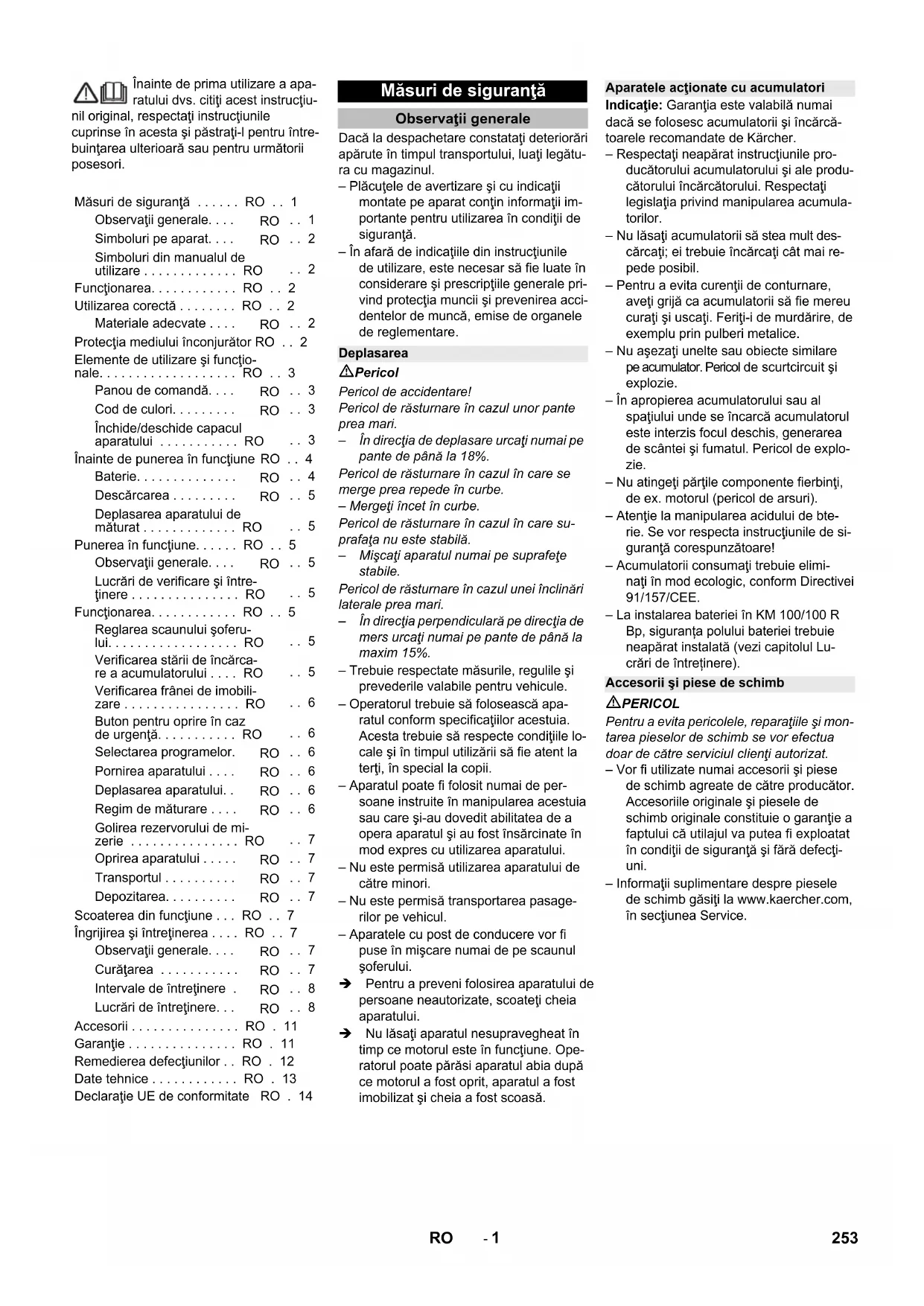 Chairman of the Board of Management Director Regulatory Affairs & Certification 252 PL- 1 Înainte de prima utilizare a apa- ratului dvs. citiţi acest instrucţiu- nil original, respectaţi instrucţiunile cuprinse în acesta şi păstraţi-l pentru între- buinţarea ulterioară sau pentru următorii posesori. Dacă la despachetare constataţi deteriorări apărute în timpul transportului, luaţi legătu- ra cu magazinul. – Plăcuţele de avertizare şi cu indicaţii montate pe aparat conţin informaţii im- portante pentru utilizarea în condiţii de siguranţă. – În afară de indicaţiile din instrucţiunile de utilizare, este necesar să fie luate în considerare şi prescripţiile generale pri- vind protecţia muncii şi prevenirea acci- dentelor de muncă, emise de organele de reglementare. Pericol Pericol de accidentare! Pericol de răsturnare în cazul unor pante prea mari. – În direcţia de deplasare urcaţi numai pe pante de până la 18%. Pericol de răsturnare în cazul în care se merge prea repede în curbe. – Mergeţi încet în curbe. Pericol de răsturnare în cazul în care su- prafaţa nu este stabilă. – Mişcaţi aparatul numai pe suprafeţe stabile. Pericol de răsturnare în cazul unei înclinări laterale prea mari. – În direcţia perpendiculară pe direcţia de mers urcaţi numai pe pante de până la maxim 15%. – Trebuie respectate măsurile, regulile şi prevederile valabile pentru vehicule. – Operatorul trebuie să folosească apa- ratul conform specificaţiilor acestuia. Acesta trebuie să respecte condiţiile lo- cale şi în timpul utilizării să fie atent la terţi, în special la copii. – Aparatul poate fi folosit numai de per- soane instruite în manipularea acestuia sau care şi-au dovedit abilitatea de a opera aparatul şi au fost însărcinate în mod expres cu utilizarea aparatului. – Nu este permisă utilizarea aparatului de către minori. – Nu este permisă transportarea pasage- rilor pe vehicul. – Aparatele cu post de conducere vor fi puse în mişcare numai de pe scaunul şoferului. Pentru a preveni folosirea aparatului de persoane neautorizate, scoateţi cheia aparatului. Nu lăsaţi aparatul nesupravegheat în timp ce motorul este în funcţiune. Ope- ratorul poate părăsi aparatul abia după ce motorul a fost oprit, aparatul a fost imobilizat şi cheia a fost scoasă. Indicaţie: Garanţia este valabilă numai dacă se folosesc acumulatorii şi încărcă- toarele recomandate de Kärcher. – Respectaţi neapărat instrucţiunile pro- ducătorului acumulatorului şi ale produ- cătorului încărcătorului. Respectaţi legislaţia privind manipularea acumula- torilor. – Nu lăsaţi acumulatorii să stea mult des- cărcaţi; ei trebuie încărcaţi cât mai re- pede posibil. – Pentru a evita curenţii de conturnare, aveţi grijă ca acumulatorii să fie mereu curaţi şi uscaţi. Feriţi-i de murdărire, de exemplu prin pulberi metalice. – Nu aşezaţi unelte sau obiecte similare pe acumulator. Pericol de scurtcircuit şi explozie. – În apropierea acumulatorului sau al spaţiului unde se încarcă acumulatorul este interzis focul deschis, generarea de scântei şi fumatul. Pericol de explo- zie. – Nu atingeţi părţile componente fierbinţi, de ex. motorul (pericol de arsuri). – Atenţie la manipularea acidului de bte- rie. Se vor respecta instrucţiunile de si- guranţă corespunzătoare! – Acumulatorii consumaţi trebuie elimi- naţi în mod ecologic, conform Directivei 91/157/CEE. – La instalarea bateriei în KM 100/100 R Bp, siguranța polului bateriei trebuie neapărat instalată (vezi capitolul Lu- crări de întreținere). PERICOL Pentru a evita pericolele, reparaţiile şi mon- tarea pieselor de schimb se vor efectua doar de către serviciul clienţi autorizat. – Vor fi utilizate numai accesorii şi piese de schimb agreate de către producător. Accesoriile originale şi piesele de schimb originale constituie o garanţie a faptului că utilajul va putea fi exploatat în condiţii de siguranţă şi fără defecţi- uni. – Informaţii suplimentare despre piesele de schimb găsiţi la www.kaercher.com, în secţiunea Service. Măsuri de siguranţă . . . . . . RO . . 1 Observaţii generale. . . .