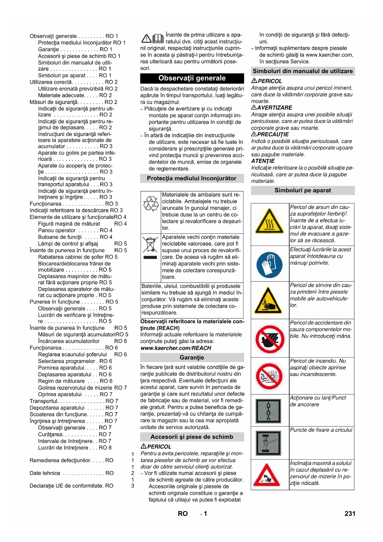Chairman of the Board of Management Director Regulatory Affairs & Certification 230 PL- 1 Înainte de prima utilizare a apa- ratului dvs. citiţi acest instrucţiu- nil original, respectaţi instrucţiunile cuprin- se în acesta şi păstraţi-l pentru întrebuinţa- rea ulterioară sau pentru următorii pose- sori. Dacă la despachetare constataţi deteriorări apărute în timpul transportului, luaţi legătu- ra cu magazinul. – Plăcuţele de avertizare şi cu indicaţii montate pe aparat conţin informaţii im- portante pentru utilizarea în condiţii de siguranţă. – În afară de indicaţiile din instrucţiunile de utilizare, este necesar să fie luate în considerare şi prescripţiile generale pri- vind protecţia muncii şi prevenirea acci- dentelor de muncă, emise de organele de reglementare. Observaţii referitoare la materialele con- ţinute (REACH) Informaţii actuale referitoare la materialele conţinute puteţi găsi la adresa: www.kaercher.com/REACH În fiecare ţară sunt valabile condiţiile de ga- ranţie publicate de distribuitorul nostru din ţara respectivă. Eventuale defecţiuni ale acestui aparat, care survin în perioada de garanţie şi care sunt rezultatul unor defecte de fabricaţie sau de material, vor fi remedi- ate gratuit. Pentru a putea beneficia de ga- ranţie, prezentaţi-vă cu chitanţa de cumpă- rare la magazin sau la cea mai apropiată unitate de service autorizată. PERICOL Pentru a evita pericolele, reparaţiile şi mon- tarea pieselor de schimb se vor efectua doar de către serviciul clienţi autorizat. – Vor fi utilizate numai accesorii şi piese de schimb agreate de către producător. Accesoriile originale şi piesele de schimb originale constituie o garanţie a faptului că utilajul va putea fi exploatat în condiţii de siguranţă şi fără defecţi- uni. – Informaţii suplimentare despre piesele de schimb găsiţi la www.kaercher.com, în secţiunea Service. PERICOL Atrage atenţia asupra unui pericol iminent, care duce la vătămări corporale grave sau moarte. 몇 AVERTIZARE Atrage atenţia asupra unei posibile situaţii periculoase, care ar putea duce la vătămări corporale grave sau moarte. 몇 PRECAUŢIE Indică o posibilă situaţie periculoasă, care ar putea duce la vătămări corporale uşoare sau pagube materiale. ATENŢIE Indicaţie referitoare la o posibilă situaţie pe- riculoasă, care ar putea duce la pagube materiale. Observaţii generale . . . . . . . . . RO 1 Protecţia mediului înconjurător RO 1 Garanţie . . . . . . . . . . . . . RO 1 Accesorii şi piese de schimb RO 1 Simboluri din manualul de utili- zare . . . . . . . . . . . . . . . . RO 1 Simboluri pe aparat . . . . RO 1 Utilizarea corectă. . . . . . . . . . . RO 2 Utilizare eronată previzibilă RO 2 Materiale adecvate. . . . . RO 2 Măsuri de siguranţă. . . . . . . . . RO 2 Indicaţii de siguranţă pentru uti- lizare . . . . . . . . . . . . . . . RO 2 Indicaţii de siguranţă pentru re- gimul de deplasare. . . . . RO 2 Instrucţiuni de siguranţă referi- toare la aparatele acţionate de acumulator . . . . . . . . . . . RO 3 Aparate cu golire pe partea infe- rioară . . . . . . . . . . . . . . . RO 3 Aparate cu acoperiş de protec- ţie . . . . . . . . . . . . . . . . . . RO 3 Indicaţii de siguranţă pentru transportul aparatului . . . RO 3 Indicaţii de siguranţă pentru în- treţinere şi îngrijire . . . . . RO 3 Funcţionarea . . . . . . . . . . . . . . RO 3 Indicaţii referitoare la descărcare RO 3 Elemente de utilizare şi funcţionaleRO 4 Figură maşină de măturat RO 4 Panou operator . . . . . . . RO 4 Butoane de funcţii . . . . . RO 4 Lămpi de control şi afişaj RO 5 Înainte de punerea în funcţiune RO 5 Rabatarea cabinei de şofer RO 5 Blocarea/deblocarea frânei de imobilizare . . . . . . . . . . . RO 5 Deplasarea maşinilor de mătu- rat fără acţionare proprie RO 5 Deplasarea aparatelor de mătu- rat cu acţionare proprie . RO 5 Punerea în funcţiune . . . . . . . . RO 5 Observaţii generale . . . . RO 5 Lucrări de verificare şi întreţine- re . . . . . . . . . . . . . . . . . . RO 5 Înainte de punerea în funcţiune RO 5 Măsuri de siguranţă acumulatoriRO 5 Încărcarea acumulatorilor RO 6 Funcţionarea . . . . . . . . . . . . . . RO 6 Reglarea scaunului şoferului RO 6 Selectarea programelor . RO 6 Pornirea aparatului. . . . . RO 6 Deplasarea aparatului . . RO 6 Regim de măturare . . . . RO 6 Golirea rezervorului de mizerie RO 7 Oprirea aparatului . . . . . RO 7 Transportul. . . . . . . . . . . . . . . . RO 7 Depozitarea aparatului . . . . . . RO 7 Scoaterea din funcţiune. . . . . . RO 7 Îngrijirea şi întreţinerea . . . . . . RO 7 Observaţii generale . . . . RO 7 Curăţarea. . . . . . . . . . . . RO 7 Intervale de întreţinere. . RO 7 Lucrări de întreţinere . . . RO 8 Remedierea defecţiunilor. . . . . RO