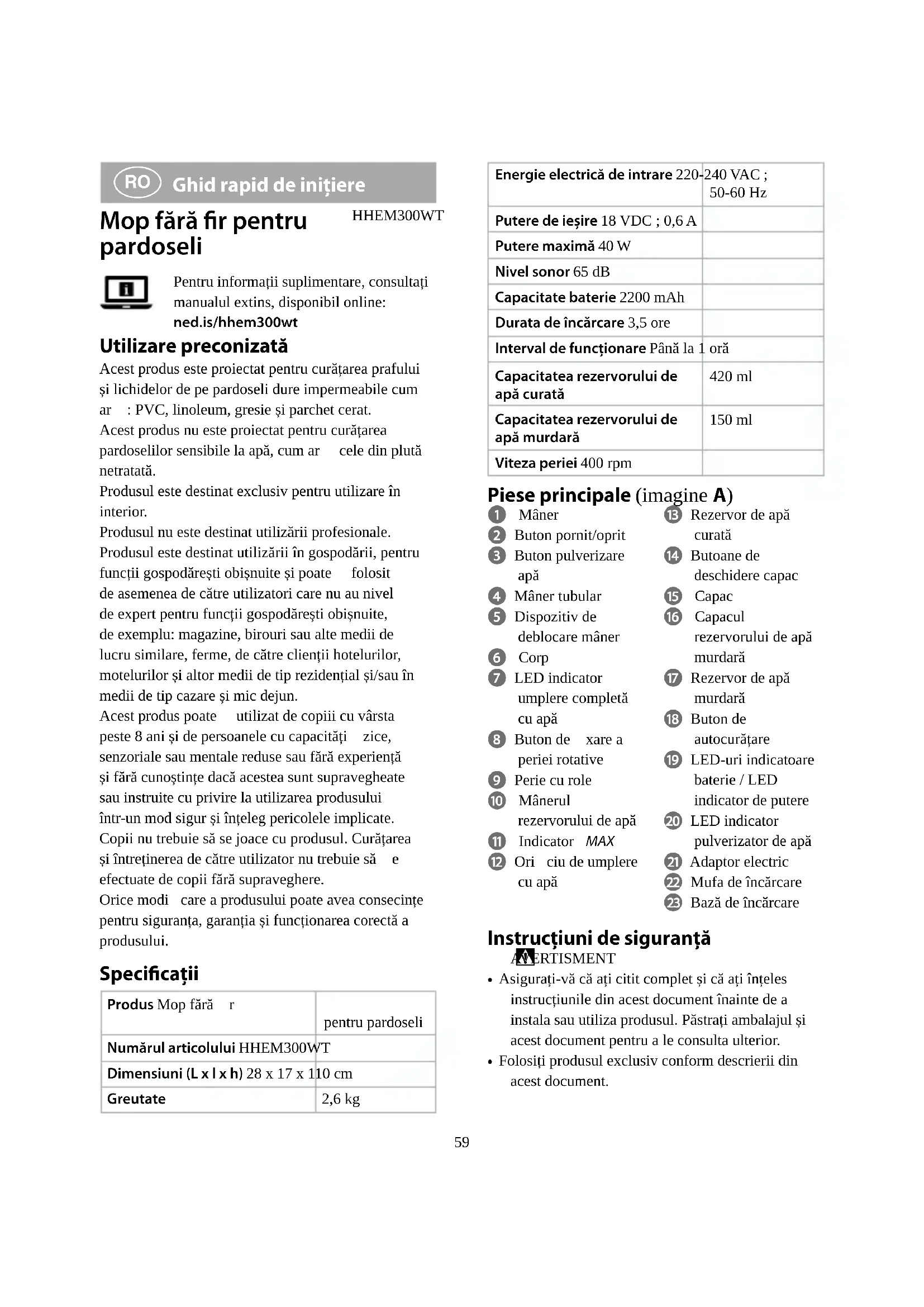 Ghid rapid de inițiere Mop fără r pentru pardoseli HHEM300WTPentru informații suplimentare, consultați manualul extins, disponibil online: ned.is/hhem300wt Utilizare preconizată Acest produs este proiectat pentru curățarea prafului și lichidelor de pe pardoseli dure impermeabile cum ar : PVC, linoleum, gresie și parchet cerat.Acest produs nu este proiectat pentru curățarea pardoselilor sensibile la apă, cum ar cele din plută netratată.Produsul este destinat exclusiv pentru utilizare în interior.Produsul nu este destinat utilizării profesionale.Produsul este destinat utilizării în gospodării, pentru funcții gospodărești obișnuite și poate folosit de asemenea de către utilizatori care nu au nivel de expert pentru funcții gospodărești obișnuite, de exemplu: magazine, birouri sau alte medii de lucru similare, ferme, de către clienții hotelurilor, motelurilor și altor medii de tip rezidențial și/sau în medii de tip cazare și mic dejun.Acest produs poate utilizat de copiii cu vârsta peste 8 ani și de persoanele cu capacități zice, senzoriale sau mentale reduse sau fără experiență și fără cunoștințe dacă acestea sunt supravegheate sau instruite cu privire la utilizarea produsului într-un mod sigur și înțeleg pericolele implicate. Copii nu trebuie să se joace cu produsul. Curățarea și întreținerea de către utilizator nu trebuie să e efectuate de copii fără supraveghere.Orice modicare a produsului poate avea consecințe pentru siguranța, garanția și funcționarea corectă a produsului. Specicaţii Produs Mop fără r pentru pardoseliNumărul articolului HHEM300WTDimensiuni (L x l x h) 28 x 17 x 110 cmGreutate 2,6 kg60
