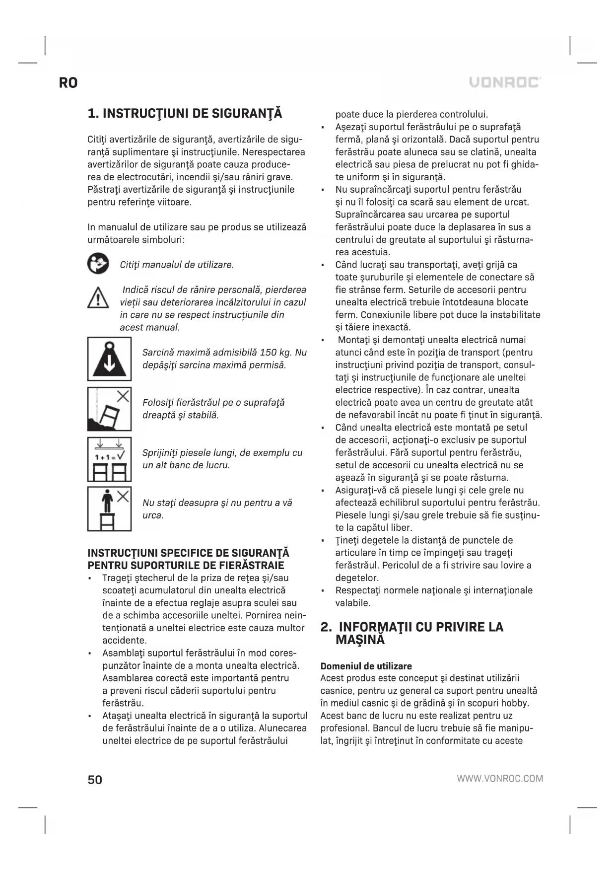 Fierăstrăul de tăieri înclinate este realizat să funcţioneze fără probleme pentru o perioadă lungă de timp şi cu o întreţinere minimă. Extindeţi durata de viaţă curăţând în mod regulat bancul şi tratându-l corect. Curăare Curăai în mod regulat suportul ferăstrăului, după fiecare utilizare. Curăai cu un curăitor de uz cas- nic adecvat şi cu o cârpă moale uscată. Nu scufun- dai ferăstrăul în apă sau în orice lichid din orice motiv. Nu utilizai solveni (benzină, alcool, amoniac etc.) deoarece vor deteriora piesele din plastic. Întreinerea Nu folosii niciodată un suport de ferăstrău cu unghi de prindere deteriorat sau rupt. Reparaiile temporare nu sunt permise. Verificai picioarele din plastic ale suportului pentru ferăstrău înainte şi după utilizarea acestuia. Nu utilizai suportul pen- tru ferăstrău fără picioarele din plastic sau atunci când picioarele din plastic sunt uzate. Meninei întotdeauna un control vizual al suportului pentru ferăstrău înainte şi după utilizarea acestuia. Reparaiile şi întreinerea trebuie efectuate să fie de o persoană competentă, cu piese de schimb adecvate. Piesele de schimb de la teri neaprobate nu sunt recomandate şi vă vor anula garania. GARANIE Produsele VONROC sunt realizate la cele mai înalte standarde de calitate și sunt garantate în privina materialelor și a manoperei pentru întreaga perioadă de utilizare în garanie, începând cu data achiziiei. În cazul în care produsul se defectează în timpul perioadei de utilizare, contactai direct VONROC. Următoarele circumstane sunt excluse de la această garanie: