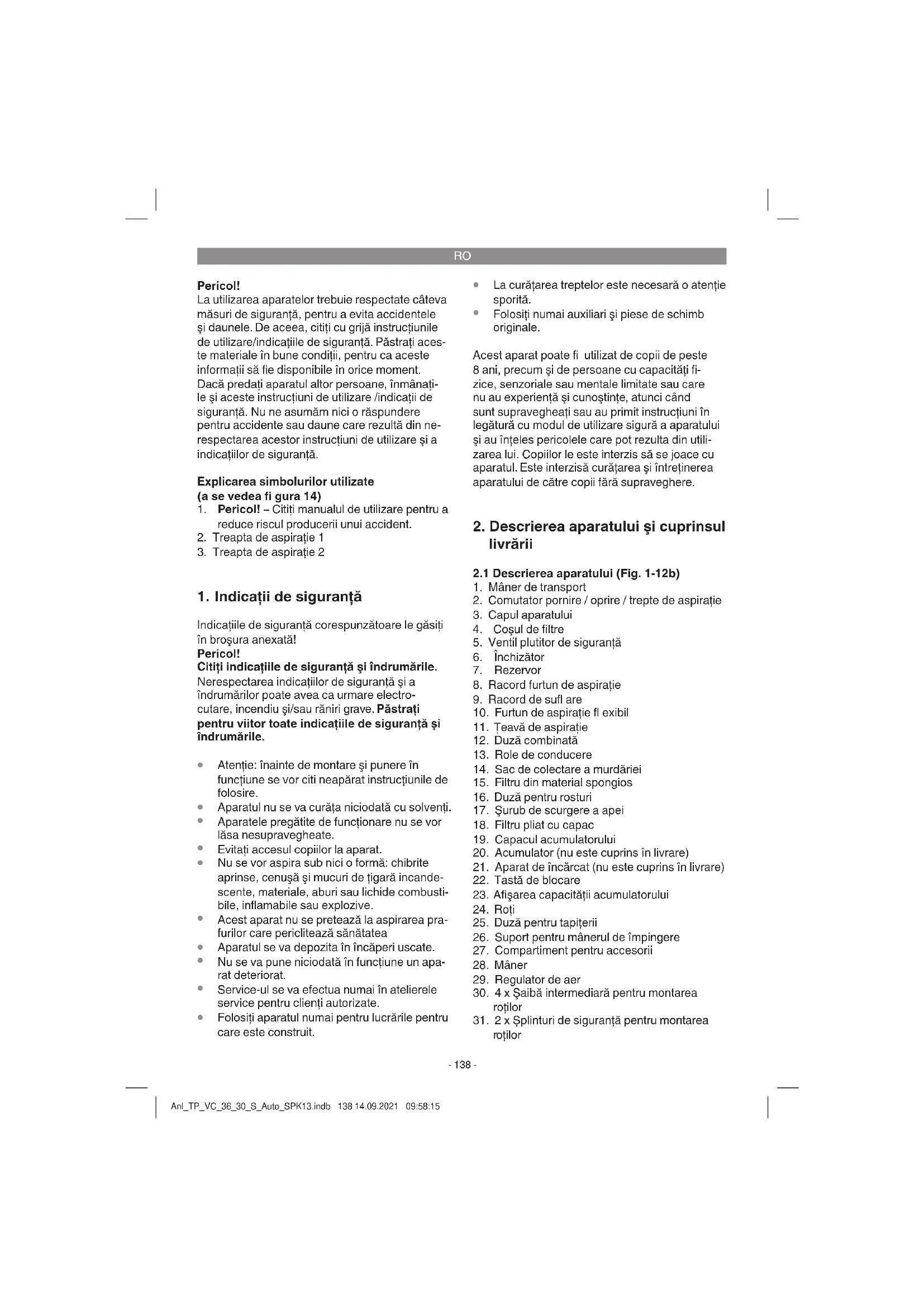 Curăţarea fi ltrului pliat (Fig. 2a) Curăţaţi fi ltrul pliat (18) cu regularitate prin lovirea uşoară a acestuia ori cu ajutorul unei perii sau a unei măturiţe. Anl_TP_VC_36_30_S_Auto_SPK13.indb 142 14.09.2021 09:58:15RO