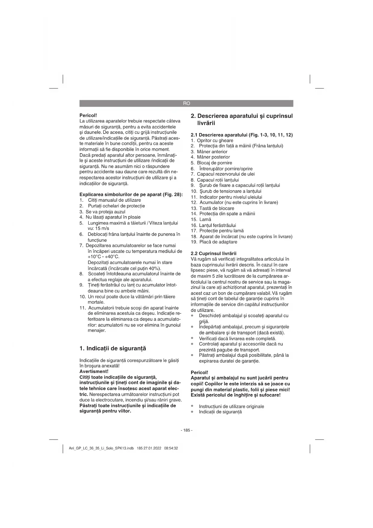 Frână de motor Motorul frânează lanţul ferăstrăului imediat ce întrerupătorul pornire/oprire (Fig. 1/Poz. 6) este eliberat sau alimentarea cu curent este întreruptă. Prin aceasta pericolul accidentării datorită rotirii din inerţie a lanţului este redus considerabil. Frâna lanţului Frâna lanţului este un mecanism de protecţie care se declanşează prin inermediul protecţiei din faţă a mâinii (Fig. 1/Poz. 2). Dacă ferăstrăul cu lanţ este aruncat înapoi datorită unui recul, frâna lanţului se declanşează şi opreşte ferăstrăul cu lan ţ într-un timp mai scurt de 0,1 secunde. Verifi caţi cu regularitate funcţionarea frânei lanţului. Pentru aceasta rabataţi protecţia mâinii (Fig. 1/Poz. 2) în faţă şi porniţi scurt ferăstrăul cu lanţ. Lanţul ferăstrăului nu are voie să pornească. Pentru a debloca frâna lanţului, trageţi înapoi protecţia din faţă a mâinii (Fig. 1/Poz. 2) până când aceasta a intrat în lăcaş. Anl_GP_LC_36_35_Li_Solo_SPK13.indb 188 27.01.2022 08:54:33RO