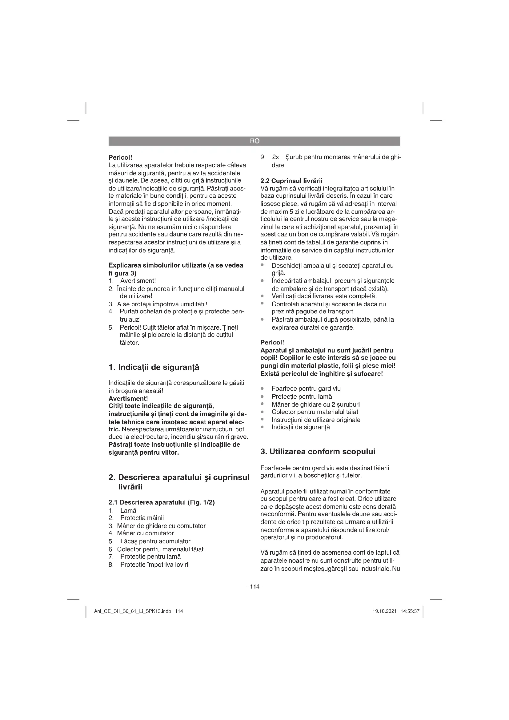 Foarfecele pentru gard viu este destinat tăierii gardurilor vii, a boscheţilor şi tufelor. Aparatul poate fi utilizat numai în conformitate cu scopul pentru care a fost creat. Orice utilizare care depăşeşte acest domeniu este considerată neconformă. Pentru eventualele daune sau acci- dente de orice tip rezultate ca urmare a utilizării neconforme a aparatului răspunde utilizatorul/ operatorul şi nu producătorul. Vă rugăm să ţineţi de asemenea cont de faptul că aparatele noastre nu sunt construite pentru utili- zare în scopuri meşteşugăreşti sau industriale. Nu Anl_GE_CH_36_61_Li_SPK13.indb 114Anl_GE_CH_36_61_Li_SPK13.indb 114 19.10.2021 14:55:3719.10.2021 14:55:37RO