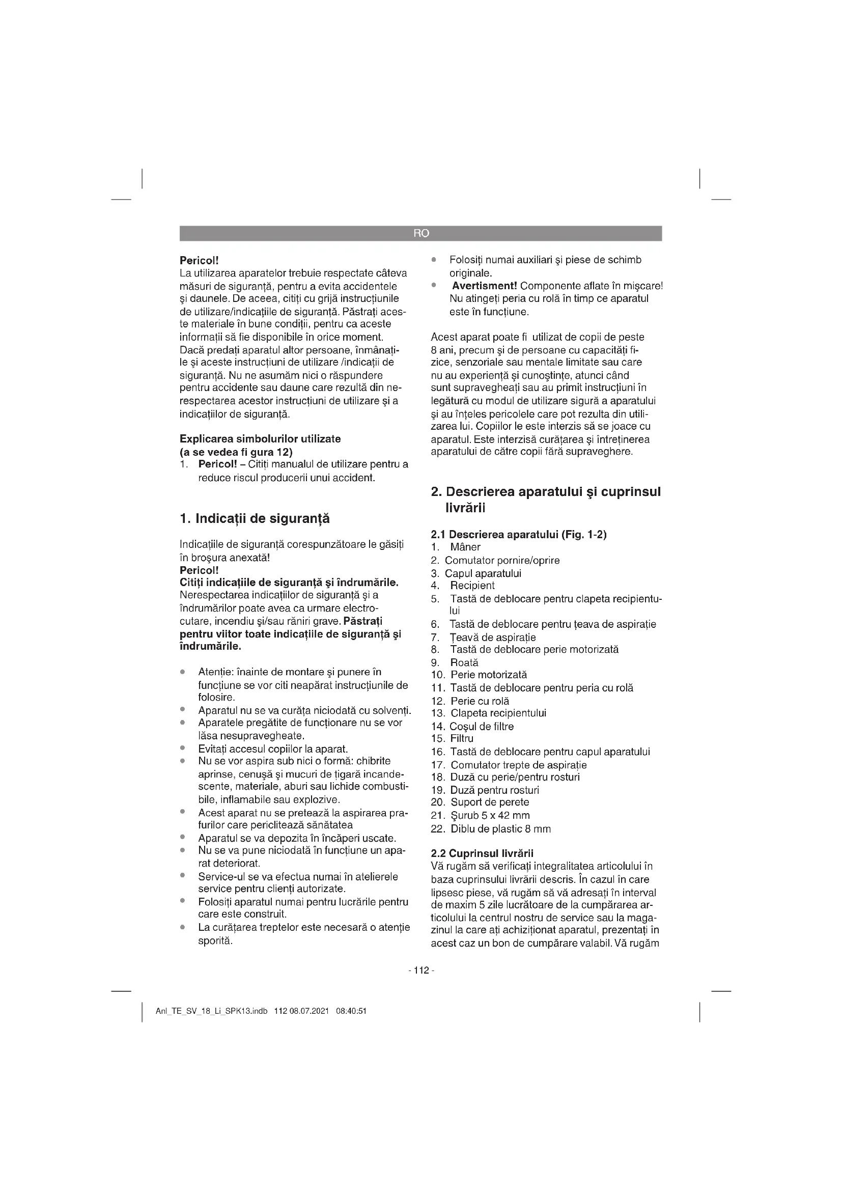 Vă rugăm să verifi caţi integralitatea articolului în baza cuprinsului livrării descris. În cazul în care lipsesc piese, vă rugăm să vă adresaţi în interval de maxim 5 zile lucră toare de la cumpărarea ar- ticolului la centrul nostru de service sau la maga- zinul la care aţi achiziţionat aparatul, prezentaţi în acest caz un bon de cumpărare valabil. Vă rugăm Anl_TE_SV_18_Li_SPK13.indb 112 08.07.2021 08:40:51RO