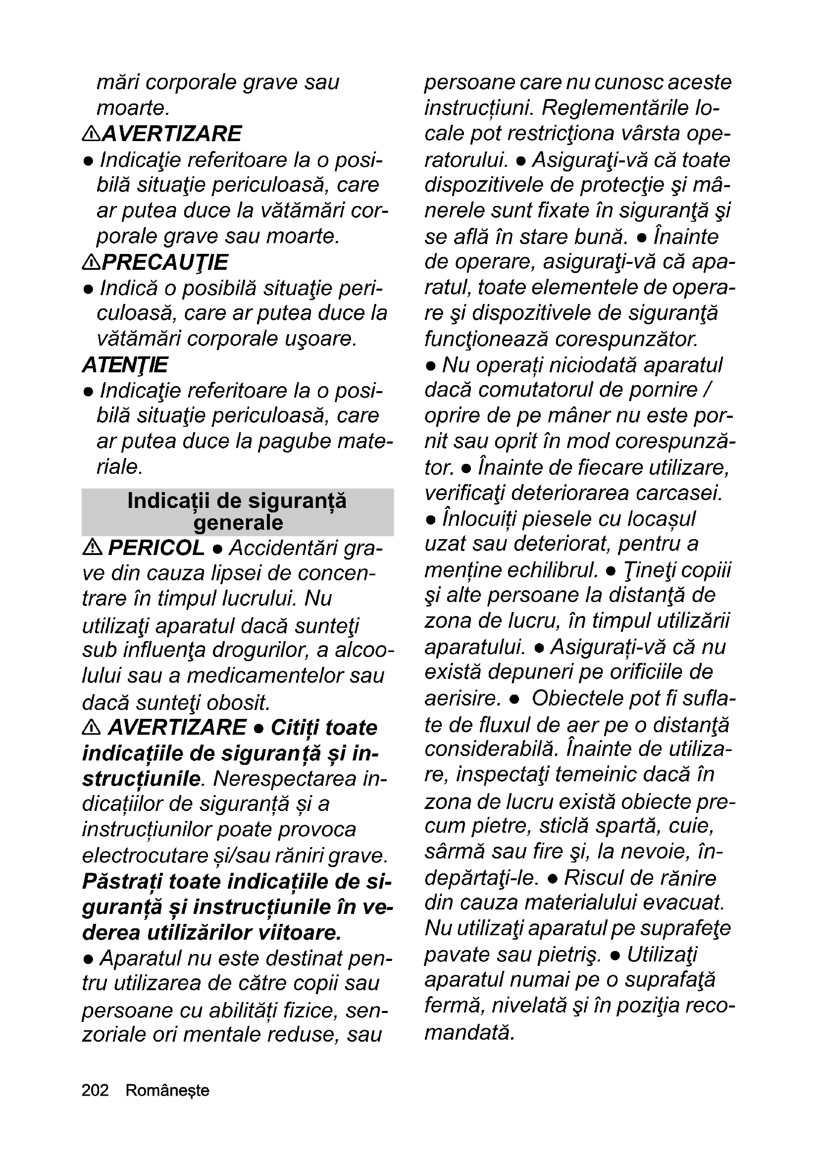 - Declaraţie de conformitate UE 02 Româneşte mări corporale grave sau moarte. 몇 AVERTIZARE ● Indicaţie referitoare la o posi- bilă situaţie periculoasă, care ar putea duce la vătămări cor- porale grave sau moarte. 몇 PRECAUŢIE ● Indică o posibilă situaţie peri- culoasă, care ar putea duce la vătămări corporale uşoare. ATENŢIE ● Indicaţie referitoare la o posi- bilă situaţie periculoasă, care ar putea duce la pagube mate- riale. Indicații de siguranță generale PERICOL ● Accidentări gra- ve din cauza lipsei de concen- trare în timpul lucrului. Nu utilizaţi aparatul dacă sunteţi sub influenţa drogurilor, a alcoo- lului sau a medicamentelor sau dacă sunteţi obosit. 몇 AVERTIZARE ● Citiți toate indicațiile de siguran ță și in- strucțiunile. Nerespectarea in- dicațiilor de siguranță și a instrucțiunilor poate provoca electrocutare și/sau răniri grave. Păstrați toate indicațiile de si- guranță și instrucțiunile în ve- derea utilizărilor viitoare. ● Aparatul nu este destinat pen- tru utilizarea de către copii sau persoane cu abilități fizice, sen- zoriale ori mentale reduse, sau persoane care nu cunosc aceste instrucțiuni. Reglementările lo- cale pot restricţiona vârsta ope- ratorului. ● Asiguraţi-vă că toate dispozitivele de protecţie şi mâ- nerele sunt fixate în siguranţă şi se află în stare bună. ● Înainte de operare, asiguraţi-vă că apa- ratul, toate elementele de opera- re şi dispozitivele de siguranţă funcţionează corespunzător. ● Nu operați niciodată aparatul dacă comutatorul de pornire / oprire de pe mâner nu este por- nit sau oprit în mod corespunză- tor. ● Înainte de fiecare utilizare, verificaţi deteriorarea carcasei. ● Înlocuiți piesele cu locașul uzat sau deteriorat, pentru a menține echilibrul. ● Ţineţi copiii şi alte persoane la distanţă de zona de lucru, în timpul utilizării aparatului. ● Asigurați-vă că nu există depuneri pe orificiile de aerisire. ● Obiectele pot fi sufla- te de fluxul de aer pe o distanţă considerabilă. Înainte de utiliza- re, inspectaţi temeinic dacă în zona de lucru există obiecte pre- cum pietre, sticlă spartă, cuie, sârmă sau fire şi, la nevoie, în- depărtaţi-le. ● Riscul de r ănire din cauza materialului evacuat. Nu utilizaţi aparatul pe suprafeţe pavate sau pietriş. ● Utilizaţi aparatul numai pe o suprafaţă fermă, nivelată şi în poziţia reco- mandată.Româneşte 203 몇 PRECAUŢIE ● Familiarizați- vă cu elementele de operare și cu utilizarea corespunzătoare a aparatului. ● Purtaţi o protecţie auditivă completă atunci când utilizaţi aparatul. Aparatul este extrem de zgomotos şi poate provoca leziuni permanente ale auzului dacă nu respectaţi cu stricteţe instrucţiunile privind ex- punerea, reducerea zgomotului şi protecţia auditivă. ● Purtaţi ochelari cu protecţie completă atunci când utilizaţi aparatul. Producătorul recomandă insis- tent să purtaţi o mască de faţă completă sau ochelari de pro- tecţie complet închişi. Ochelarii normali sau ochelarii de soare nu oferă protecţie împotriva obiectelor proiectate. ● Pericol de rănire în cazul în care hainele largi, părul sau bijuteriile sunt prinse în admisia de aer a apa- ratului. Legaţi părul lung deasu- pra nivelului umărului. ● În timpul lucrului, purtați pantaloni lungi, grei, încălțăminte de pro- tecție și mănuși fixe. Nu lucrați cu picioarele goale. Nu purtați bijuterii, sandale sau pantaloni scurți. ATENŢIE ● Operatorul aparatu- lui este responsabil pentru acci- dentele cu alte persoane sau bunurile acestora. Indicaţie ● În unele regiuni, re- glementările pot limita utilizarea acestui aparat. Consultați autori- tățile locale. ● Etichetele de avertizare deteriorate sau ilizibi- le de pe aparat trebuie înlocuite de către serviciul autorizat pen- tru clienți. ● Înainte de a utiliza suflanta cu acumulator, curăţaţi murdăria cu grebla şi mătura. Operare în siguranță PERICOL ● Se interzice funcţionarea în zone cu pericol de explozie. 몇 AVERTIZARE ● Păstrați o distanță minimă de 15 m față de persoane și animale. Opriți apa- ratul atunci când o persoană in- tră în această zonă. ● Ţineţi faţa şi corpul departe de portul de ali- mentare. ● Camera de alimenta- re trebuie să fie goală înainte de a porni aparatul. ● Nu menţineţi mâinile sau alte părţi ale corpu- lui în camera de alimentare, jgheab sau în apropierea altor componente mobile. ● Nu utili- zaţi aparatul dacă există perico- lul de descărcări electrice. ● Aveți nevoie de o vedere fără obstacole asupra zonei de lucru, pentru a detecta pericolele po- tențiale. Utilizați aparatul numai în condiții bune de lumină. ● În timpul lucrului cu aparatul, de- plasați-vă mergând, nu aler- gând. Nu mergeți înapoi. Evitați o postură corporală nefirească, asigurați-vă o poziție fixă, stabilă și păstrați-vă echilibrul tot tim- pul. ● Nu utilizaţi niciodată apa-204 Româneşte ratul cu dispozitive de protecţie defecte sau cu dispozitive de si- guranţă lipsă, de ex. coşul co- lector pentru resturi montat. ● Opriți imediat aparatul și verifi- cați dacă prezintă daune sau identificați cauza vibrației, dacă aparatul a căzut, a fost lovit sau vibrează anormal. Reparați dau- nele prin intermediul unui servi- ciu de relații cu clienții autorizat sau înlocuiți aparatul. ● În caz de accident sau defecţiune, opriţi imediat aparatul şi scoateţi setul de acumulatori. Este posi- bil ca aparatul să nu fie pus în funcţiune până când nu a fost verificat de un centru de service autorizat. ● Pericol de rănire de componentele rotative. Opriți motorul, scoateți setul de acu- mulatori și asigurați-vă că toate componentele mobile sunt opri- te complet: înainte de a lăsa aparatul ne- supravegheat. î