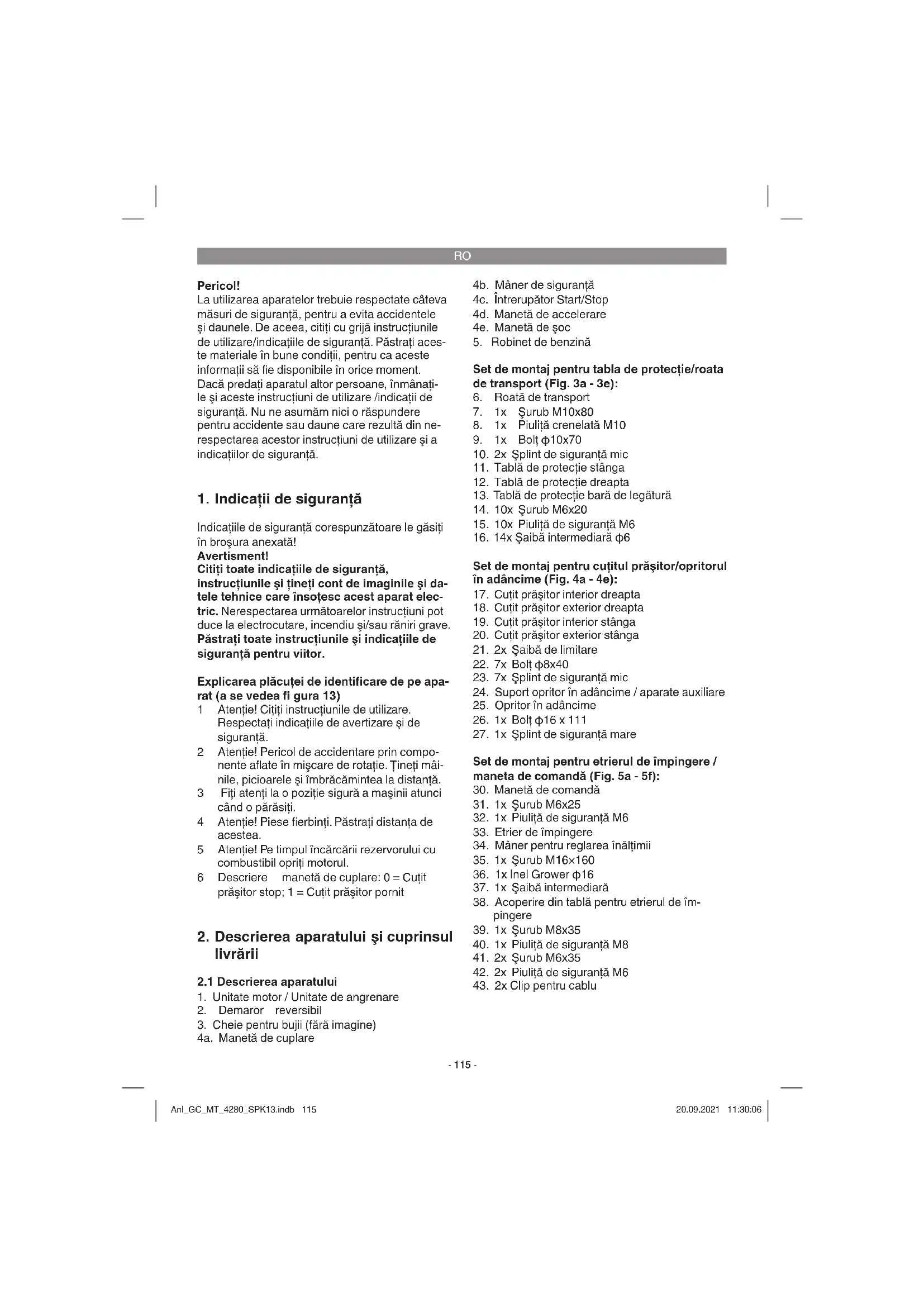 Indicaţiile de siguranţă corespunzătoare le găsiţi în broşura anexată! Avertisment! Citiţi toate indicaţiile de siguranţă, instrucţiunile şi ţineţi cont de imaginile şi da- tele tehnice care însoţesc acest aparat elec- tric. Nerespectarea următoarelor instrucţiuni pot duce la electrocutare, incendiu şi/sau răniri grave. Păstraţi toate instrucţiunile şi indicaţiile de siguranţă pentru viitor. Explicarea plăcuţei de identifi care de pe apa- rat (a se vedea fi gura 13) 1 Atenţie! Ciţiţi instrucţiunile de utilizare. Respectaţi indicaţiile de avertizare şi de siguranţă. 2 Atenţie! Pericol de accidentare prin compo- nente afl ate în mişcare de rotaţie. Ţineţi mâi- nile, picioarele şi îmbrăcămintea la distanţă. 3 Fiţi atenţi la o poziţie sigură a maşinii atunci când o părăsiţi. 4 Atenţie! Piese fi erbinţi. Păstraţi distanţa de acestea. 5 Atenţie! Pe timpul încărcării rezervorului cu combustibil opriţi motorul. 6 Descriere manetă de cuplare: 0 = Cuţit prăşitor stop; 1 = Cuţit prăşitor pornit