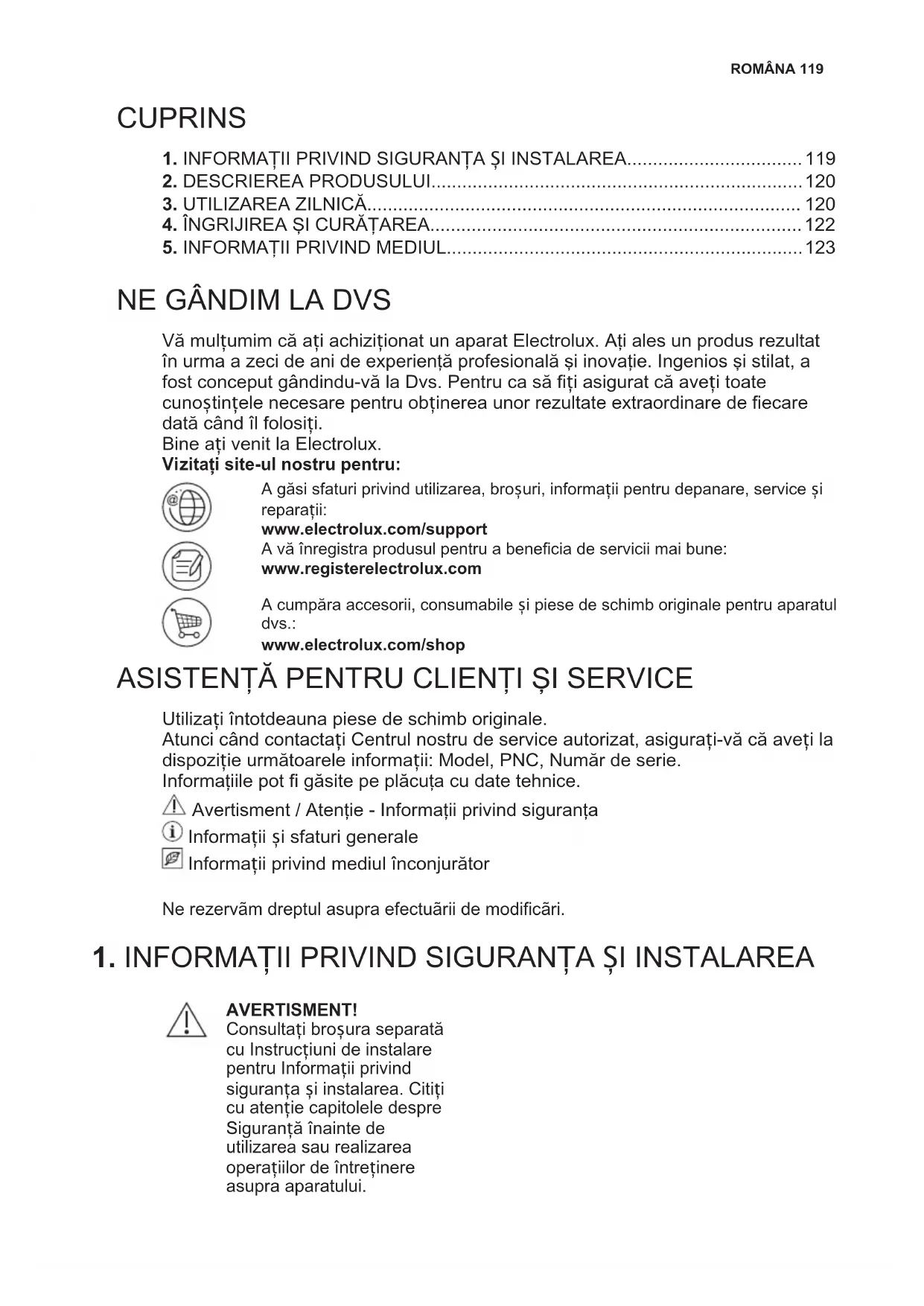 Vă mulțumim că ați achiziționat un aparat Electrolux. Aţi ales un produs rezultat în urma a zeci de ani de experienţă profesională şi inovaţie. Ingenios şi stilat, a fost conceput gândindu-vă la Dvs. Pentru ca să fiți asigurat că aveți toate cunoștințele necesare pentru obținerea unor rezultate extraordinare de fiecare dată când îl folosiți. Bine ați venit la Electrolux. Vizitați site-ul nostru pentru: A găsi sfaturi privind utilizarea, broșuri, informații pentru depanare, service și reparații: www.electrolux.com/support A vă înregistra produsul pentru a beneficia de servicii mai bune: www.registerelectrolux.com A cumpăra accesorii, consumabile și piese de schimb originale pentru aparatul dvs.: www.electrolux.com/shop