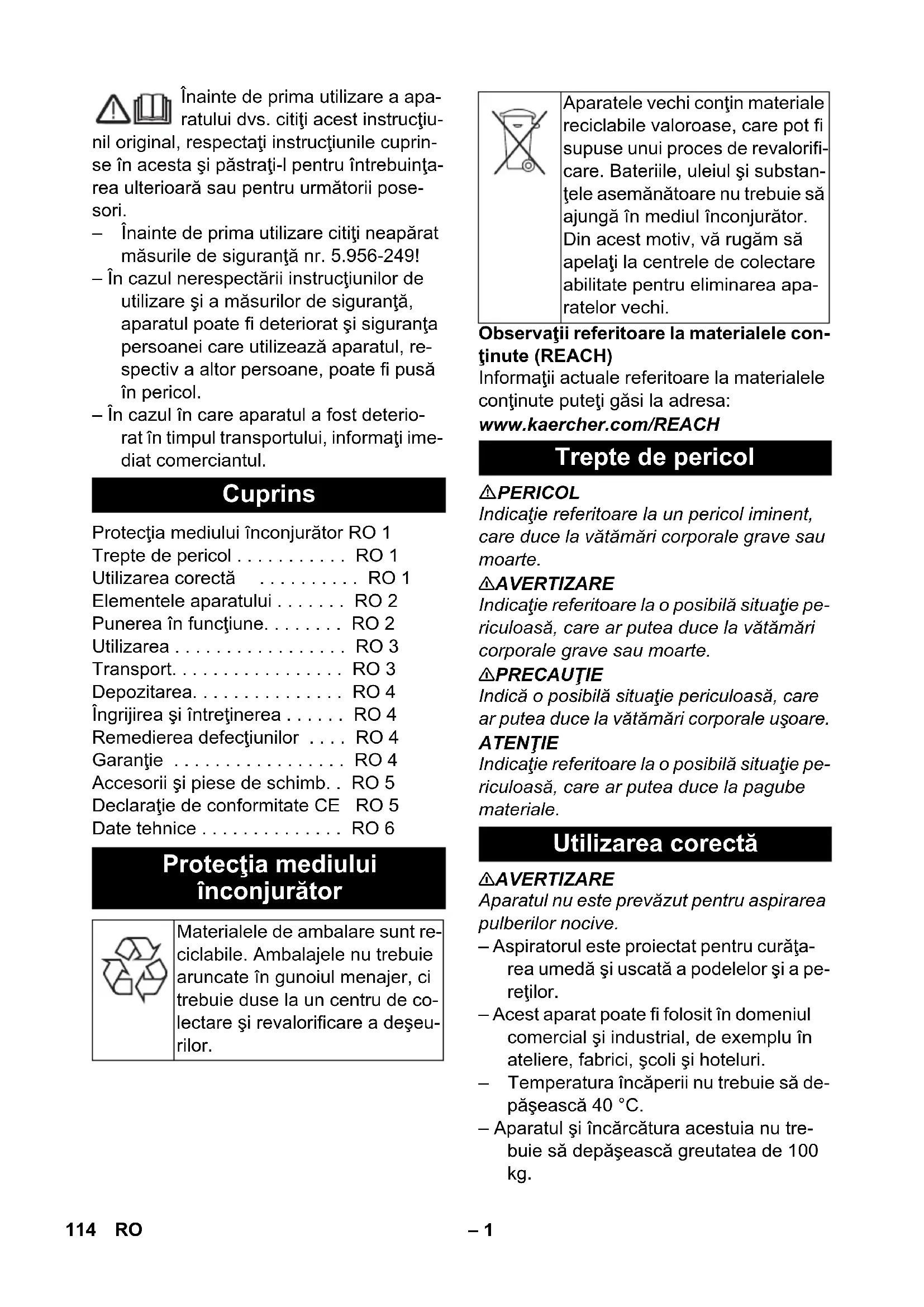 EU 6.647-069.0 10 m GB 6.649-803.0 10 m 113PL– 1 Înainte de prima utilizare a apa- ratului dvs. citiţi acest instrucţiu- nil original, respectaţi instrucţiunile cuprin- se în acesta şi păstraţi-l pentru întrebuinţa- rea ulterioară sau pentru următorii pose- sori. – Înainte de prima utilizare citiţi neapărat măsurile de siguranţă nr. 5.956-249! – În cazul nerespectării instrucţiunilor de utilizare şi a măsurilor de siguranţă, aparatul poate fi deteriorat şi siguranţa persoanei care utilizează aparatul, re- spectiv a altor persoane, poate fi pusă în pericol. – În cazul în care aparatul a fost deterio- rat în timpul transportului, informaţi ime- diat comerciantul. Observaţii referitoare la materialele con- ţinute (REACH) Informaţii actuale referitoare la materialele conţinute puteţi găsi la adresa: www.kaercher.com/REACH PERICOL Indicaţie referitoare la un pericol iminent, care duce la vătămări corporale grave sau moarte. 몇 AVERTIZARE Indicaţie referitoare la o posibilă situaţ ie pe- riculoasă, care ar putea duce la vătămări corporale grave sau moarte. 몇 PRECAUŢIE Indică o posibilă situaţie periculoasă, care ar putea duce la vătămări corporale uşoare. ATENŢIE Indicaţie referitoare la o posibilă situaţie pe- riculoasă, care ar putea duce la pagube materiale. 몇 AVERTIZARE Aparatul nu este prevăzut pentru aspirarea pulberilor nocive. – Aspiratorul este proiectat pentru curăţa- rea umedă şi uscată a podelelor şi a pe- reţilor. – Acest aparat poate fi folosit în domeniul comercial şi industrial, de exemplu în ateliere, fabrici, şcoli şi hoteluri. – Temperatura încăperii nu trebuie să de- păşească 40 °C. – Aparatul şi încărcătura acestuia nu tre- buie să depăşească greutatea de 100 kg. Cuprins Protecţia mediului înconjurător RO 1 Trepte de pericol . . . . . . . . . . . RO 1 Utilizarea corectă . . . . . . . . . . RO 1 Elementele aparatului . . . . . . . RO 2 Punerea în funcţiune. . . . . . . . RO 2 Utilizarea . . . . . . . . . . . . . . . . . RO 3 Transport. . . . . . . . . . . . . . . . . RO 3 Depozitarea. . . . . . . . . . . . . . . RO 4 Îngrijirea şi întreţinerea . . . . . . RO 4 Remedierea defecţiunilor . . . . RO 4 Garanţie . . . . . . . . . . . . . . . . . RO 4 Accesorii şi piese de schimb. . RO 5 Declaraţie de conformitate CE RO 5 Date tehnice . . . . . . . . . . . . . . RO 6 Protecţia mediului înconjurător Materialele de ambalare sunt re- ciclabile. Ambalajele nu trebuie aruncate în gunoiul menajer, ci trebuie duse la un centru de co- lectare şi revalorificare a deşeu- rilor. Aparatele vechi conţin materiale reciclabile valoroase, care pot fi supuse unui proces de revalorifi- care. Bateriile, uleiul şi substan- ţele asemănătoare nu trebuie să ajungă în mediul înconjurător. Din acest motiv, vă rugăm să apelaţi la centrele de colectare abilitate pentru eliminarea apa- ratelor vechi. Trepte de pericol Utilizarea corectă 114 RO– 2 1 Şurub cu cap stea 2 Filtru-cartuş 3 Protecţie de preaplin mecanică 4 Cap de aspirare 5 Furtun pentru aspirare 6 Bară de manevrare 7 Cârlig pentru cablu 8Zăvor cap de aspirare 9 Recipient pentru murdărie 10 Ştuţul de aspirare 11 Rolă de ghidare 12 Aparat de rulare 13 Mâner aparat de rulare 14 Duză pentru sol 15 Tub de aspirare 16 Mâner pentru transport 17 Cot 18 Comutator turbină aspiratoare 2 19 Comutator turbină aspiratoare 1 20 Comutator turbină aspiratoare 3 21 Suport pentru duza de podea 22 Furtun de evacuare 23 Suport tuburi de aspiraţie 24 Suport duză pentru rosturi 25 Cablu de reţea 26 Plăcuţa de tip ATENŢIE Nu este permisă depăşirea impedanţei ma- xime admise a reţelei la punctul de conexi- une electrică (a se vedea datele tehnice). Dacă există nelămuriri referitor la impedan- ţa reţelei la punctul de conexiune electrică, vă rugăm să contactaţi compania locală de furnizare a energiei. ATENŢIE Pericol de deteriorare! În timpul aspirării nu este permis ă îndepărtarea filtrului cartuş. – Când se aspiră praf fin, se poate folosi în plus şi un sac de filtrare din hârtie sau un filtru-membrană (accesoriu opţional). Figura Deblocaţi capul de aspirare şi îndepăr- taţi-l. Aplicaţi sacul de filtrare din hârtie sau filtrul-membrană (accesoriu opţional). Puneţi capul de aspirare la loc şi blo- caţi-l. Figura Demontaţi peria. Montaţi lamelele de cauciuc. Notă: Porţiunea texturată a lamelei de cau- ciuc trebuie să fie spre exterior. – Când se aspiră murdărie umedă sacul de filtrare din hârtie sau filtrul-membra- nă (accesoriu opţional) trebuie scos. – Se recomandă folosirea unui sac filtrant special (ud) (vezi sistemele de filtrare). ATENŢIE Pericol de deteriorare! În timpul aspirării nu este permisă îndepărtarea filtrului cartuş. – După terminarea procesului de aspirare umedă : Curăţaţi rezervorul şi protecţia de preaplin mecanică cu o cârpă ume- dă şi lăsaţi-le să se usuce. – La trecerea directă de la aspirare ume- dă la aspirare uscată, filtrele-cartuş tre- buie înlocuite cu unele uscate. Elementele aparatului Punerea în funcţiune Alimentarea cu curent Aspirarea uscată Montarea sacului - filtru din hârtie (opţional) Aspirarea umedă Montarea lamelor de cauciuc Scoaterea sacului de filtrare din hârtie Aspirare umedă cu filtru-cartuş 115RO– 3 Deblocaţi capul de aspirare şi îndepăr- taţi-l. Desfaceţi şurubul cu cap stea şi scoa- teţi filtrul-cartuş. Figura Înşurubaţi şurubul cu cap stea. Introduceţi filtrul pentru lichide. Puneţi capul de aspirare la loc şi blo- caţi-l. ATENŢIE Pericol de deteriorare! În timpul aspirării nu este permisă îndepărtarea filtrului pentru li- chide. – După terminarea procesului de aspirare umedă: Curăţaţi rezervorul şi protecţia de preaplin mecanică cu o cârpă ume- dă şi lăsaţi-le să se usuce. – La trecerea directă de la aspi
