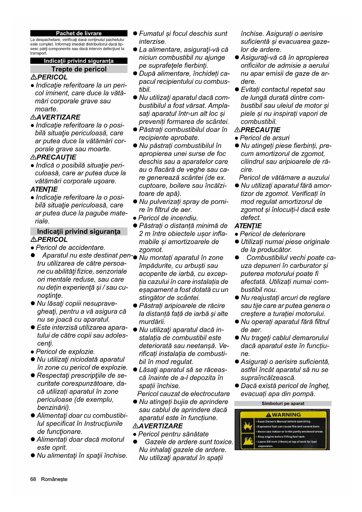 • Declaraţie de conformitate UE Româneşte Pachet de livrare La despachetare, verificaţi dacă conţinutul pachetului este complet. Informaţi imediat distribuitorul dacă lip- sesc părţi componente sau dacă intervin defecţiuni la transport. Indicaţii privind siguranţa Trepte de pericol PERICOL ● Indicaţie referitoare la un peri- col iminent, care duce la vătă- mări corporale grave sau moarte. 몇 AVERTIZARE ● Indicaţie referitoare la o posi- bilă situaţie periculoasă, care ar putea duce la vătămări cor- porale grave sau moarte. 몇 PRECAUŢIE ● Indică o posibilă situaţie peri- culoasă, care ar putea duce la vătămări corporale uşoare. ATENŢIE ● Indicaţie referitoare la o posi- bilă situaţie periculoasă, care ar putea duce la pagube mate- riale. Indicaţii privind siguranţa PERICOL ● Pericol de accidentare. Aparatul nu este destinat pen- tru utilizarea de către persoa- ne cu abilităţi fizice, senzoriale ori mentale reduse, sau care nu dețin experienţă și / sau cu- noştinţe. Nu lăsaţi copiii nesuprave- gheaţi, pentru a vă asigura că nu se joacă cu aparatul. Este interzisă utilizarea apara- tului de către copii sau adoles- cenţi. ● Pericol de explozie. Nu utilizaţi niciodată aparatul în zone cu pericol de explozie. Respectaţi prescripţiile de se- curitate corespunzătoare, da- că utilizați aparatul în zone periculoase (de exemplu, benzinării). Alimentaţi doar cu combustibi- lul specificat în Instrucţiunile de funcţionare. Alimentați doar dacă motorul este oprit. Nu alimentaţi în spaţii închise. Fumatul și focul deschis sunt interzise. La alimentare, asiguraţi-vă că niciun combustibil nu ajunge pe suprafeţele fierbinţi. După alimentare, închideți ca- pacul recipientului cu combus- tibil. Nu utilizaţi aparatul dacă com- bustibilul a fost vărsat. Ampla- sați aparatul într-un alt loc și preveniți formarea de scântei. Păstrați combustibilul doar în recipiente aprobate. Nu păstrați combustibilul în apropierea unei surse de foc deschis sau a aparatelor care au o flacără de veghe sau ca- re generează scântei (de ex. cuptoare, boilere sau încălzi- toare de apă). Nu pulverizați spray de porni- re în filtrul de aer. ● Pericol de incendiu. Păstrați o distanță minimă de 2 m între obiectele ușor infla- mabile și amortizoarele de zgomot. Nu montați aparatul în zone împădurite, cu arbuști sau acoperite de iarbă, cu excep- ția cazului în care instalația de eșapament a fost dotată cu un sting ător de scântei. Păstrați aripioarele de răcire la distanță față de iarbă și alte murdării. Nu utilizaţi aparatul dacă in- stalația de combustibil este deteriorată sau neetanșă. Ve- rificați instalația de combusti- bil în mod regulat. Lăsaţi aparatul să se răceas- că înainte de a-l depozita în spații închise. Pericol cauzat de electrocutare Nu atingeți bujia de aprindere sau cablul de aprindere dacă aparatul este în funcțiune. 몇 AVERTIZARE ● Pericol pentru sănătate Gazele de ardere sunt toxice. Nu inhalaţi gazele de ardere. Nu utilizaţi aparatul în spații închise. Asigurați o aerisire suficientă și evacuarea gaze- lor de ardere. Asiguraţi-vă că în apropierea orificiilor de admisie a aerului nu apar emisii de gaze de ar- dere. Evitați contactul repetat sau de lungă durată dintre com- bustibil sau uleiul de motor și piele și nu inspirați vapori de combustibil. 몇 PRECAUŢIE ● Pericol de arsuri Nu atingeți piese fierbinți, pre- cum amortizorul de zgomot, cilindrul sau aripioarele de ră- cire. Pericol de vătămare a auzului Nu utilizaţi aparatul fără amor- tizor de zgomot. Verificați în mod regulat amortizorul de zgomot și înlocuiți-l dacă este defect. ATENŢIE ● Pericol de deteriorare Utilizați numai piese originale de la producător. Combustibilul vechi poate ca- uza depuneri în carburator și puterea motorului poate fi afectată. Utilizați numai com- bustibil nou. Nu reajustați arcuri de reglare sau tije care ar putea genera o creștere a turației motorului. Nu operați aparatul fără filtrul de aer. Nu trageți cablul demarorului dacă aparatul este în funcțiu- ne. Asigurați o aerisire suficientă, astfel încât aparatul să nu se supraîncălzească. Dacă există pericol de îngheț, evacuați apa din pompă. Simboluri pe aparatRomâneşte 69 몇 AVERTIZARE Pericol de explozie, pericol de incendiu. Benzina poate provoca incendii sau explozii, dacă este manipulată în mod necorespunzător. Înainte de utilizarea aparatului, citiți acest manual de uti- lizare. Nu utilizaţi aparatul în spații închise sau pe suprafețe parțial închise. Înainte de alimentare, scoateți motorul din funcțiune. Alimentați numai până la 16 mm sub marginea superi- oară de alimentare, pentru a rămâne spațiu pentru dila- tarea combustibilului. 몇PRECAUŢIE Suprafeţe fierbinţi În timpul funcționării, instalația de eșa- pament devine foarte fierbinte și poate cauza arsuri. Evitați contactul cu instalația de eșapa- ment. 몇AVERTIZARE Pericol de vătămare a auzului și a ochilor. În cadrul utilizării aparatului, purtați ochelari de protecție și protecție auditi- vă. Descrierea aparatului Pentru imagini, vezi coperta Figura A 1 Comutator aparat 2 Demaror cu sfoară 3 Filtru de aer 4 Orificiu de umplere 5 Capac rezervor de combustibil 6 Rezervor de combustibil 7 Jojă de ulei 8 Şurub de scurgere a uleiului 9 Ieşire 10 Prize de aspirare 11 Șurub de scurgere a apei 12 Plăcuţă cu caracteristici 13 Robinet de combustibil 14 Manetă șoc 15 Manetă de accelerație Simboluri pe aparat Curățați filtrul de aer la fiecare 50 de ore, iar în cazul uti- lizării în atmosfere cu praf, curățați-l la fiecare 10 ore („Îngrijirea şi întreţinerea/Curățarea filtrului de aer”). Indicație cu privire la controlul nive- lului de ulei. Manetă șoc Manetă de accelerație P