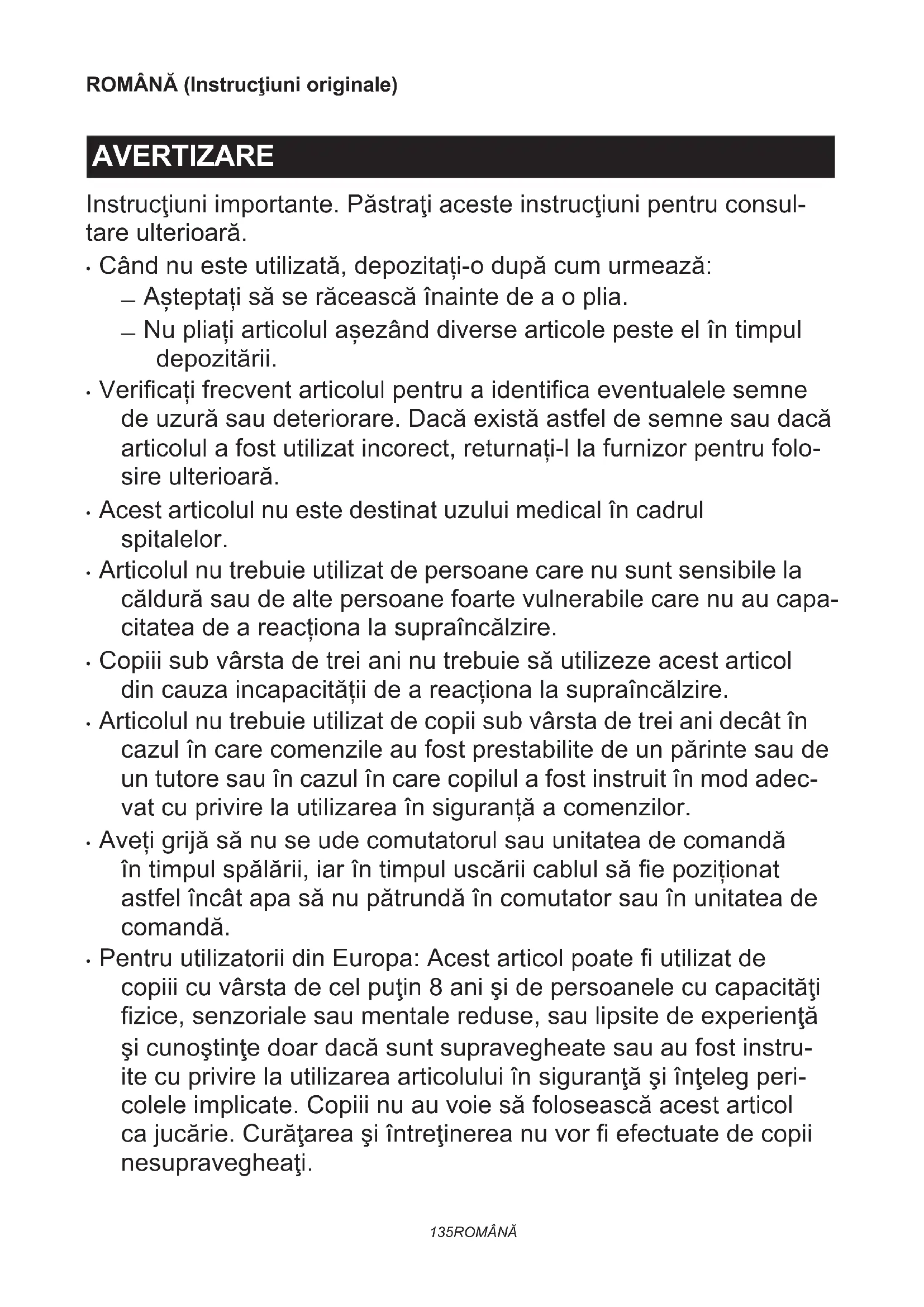 - Copiii sub vârsta de trei ani nu trebuie să utilizeze acest articol din cauza incapacității de a reacționa la supraîncălzire.