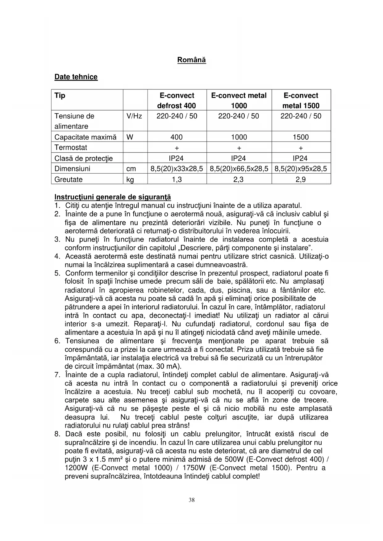 supraîncălzire şi de incendiu. În cazul în care utilizarea unui cablu prelungitor nu poate fi evitată, asiguraţi-vă că acesta nu este deteriorat, că are diametrul de cel puţin 3 x 1.5 mm² şi o putere minimă admisă de 500W (E-Convect defrost 400) / 1200W (E-Convect metal 1000) / 1750W (E-Convect metal 1500). Pentru a preveni supraîncălzirea, întotdeauna întindeţi cablul complet!39