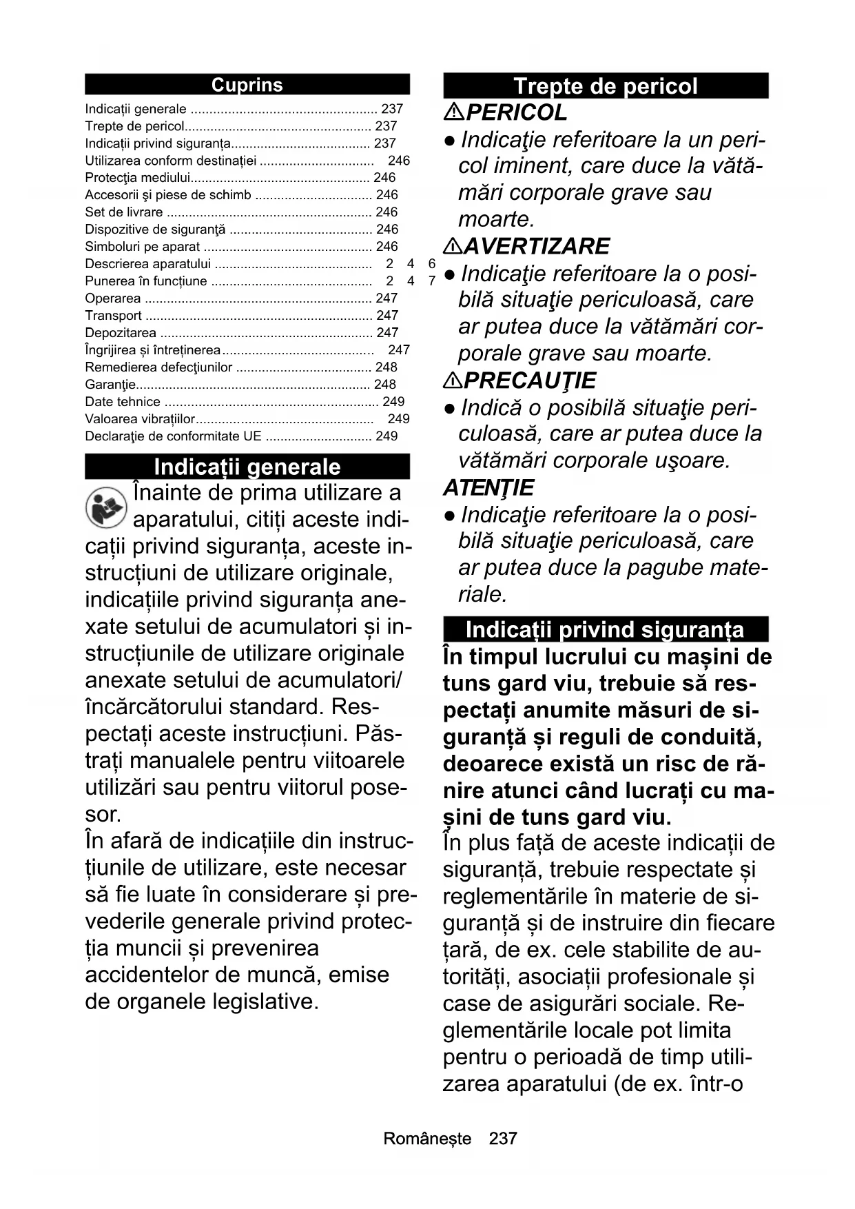 - Poziom mocy akustycznej dB(A) Zmierzony:91,2 Gwarantowany:93 Niżej podpisane osoby działają na zlecenie i z upoważ- nienia zarządu. Administrator dokumentacji: S. Reiser Alfred Kärcher SE & Co. KG Alfred-Kärcher-Str. 28 - 40 71364 Winnenden (Germany) Tel.: +49 7195 14-0 Faks: +49 7195 14-2212 Winnenden, 01.07.2018 Chairman of the Board of ManagementDirector Regulatory Affairs & Certification H. Jenner S. ReiserRomâneşte 237 Cuprins Indicații generale Înainte de prima utilizare a aparatului, citiți aceste indi- cații privind siguranța, aceste in- strucțiuni de utilizare originale, indicațiile privind siguranța ane- xate setului de acumulatori și in- strucțiunile de utilizare originale anexate setului de acumulatori/ încărcătorului standard. Res- pectați aceste instrucțiuni. Păs- trați manualele pentru viitoarele utilizări sau pentru viitorul pose- sor. În afară de indicațiile din instruc- țiunile de utilizare, este necesar să fie luate în considerare și pre- vederile generale privind protec- ția muncii și prevenirea accidentelor de muncă, emise de organele legislative. Trepte de pericol PERICOL ● Indicaţie referitoare la un peri- col iminent, care duce la vătă- mări corporale grave sau moarte. 몇 AVERTIZARE ● Indicaţie referitoare la o posi- bilă situaţie periculoasă, care ar putea duce la vătămări cor- porale grave sau moarte. 몇 PRECAUŢIE ● Indică o posibilă situaţie peri- culoasă, care ar putea duce la vătămări corporale uşoare. ATENŢIE ● Indicaţie referitoare la o posi- bilă situaţie periculoasă, care ar putea duce la pagube mate- riale. Indicații privind siguranța În timpul lucrului cu mașini de tuns gard viu, trebuie să res- pectați anumite măsuri de si- guranță și reguli de conduită, deoarece există un risc de ră- nire atunci când lucrați cu ma- șini de tuns gard viu. În plus față de aceste indicații de siguranță, trebuie respectate și reglementările în materie de si- guranță și de instruire din fiecare țară, de ex. cele stabilite de au- torități, asociații profesionale și case de asigurări sociale. Re- glementările locale pot limita pentru o perioadă de timp utili- zarea aparatului (de ex. într-o Indicații generale p. 237