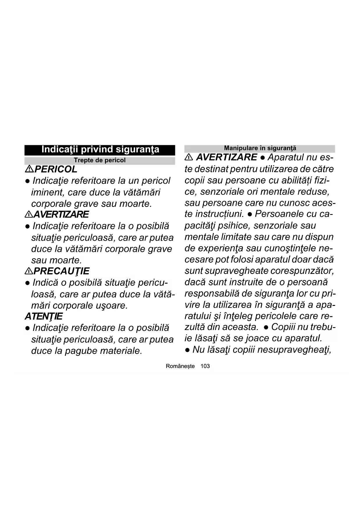- Date tehnice Româneşte 103 Indicaţii privind siguranţa Trepte de pericol PERICOL ● Indicaţie referitoare la un pericol iminent, care duce la vătămări corporale grave sau moarte. 몇 AVERTIZARE ● Indicaţie referitoare la o posibilă situaţie periculoasă, care ar putea duce la vătămări corporale grave sau moarte. 몇 PRECAUŢIE ● Indică o posibilă situaţie pericu- loasă, care ar putea duce la vătă- mări corporale uşoare. ATENŢIE ● Indicaţie referitoare la o posibilă situaţie periculoasă, care ar putea duce la pagube materiale. Manipulare în siguranţă 몇 AVERTIZARE ● Aparatul nu es- te destinat pentru utilizarea de către copii sau persoane cu abilități fizi- ce, senzoriale ori mentale reduse, sau persoane care nu cunosc aces- te instrucțiuni. ● Persoanele cu ca- pacităţi psihice, senzoriale sau mentale limitate sau care nu dispun de experienţa sau cunoştinţele ne- cesare pot folosi aparatul doar dacă sunt supravegheate corespunzător, dacă sunt instruite de o persoană responsabilă de siguranţa lor cu pri- vire la utilizarea în siguranţă a apa- ratului şi înţeleg pericolele care re- zultă din aceasta. ● Copiii nu trebu- ie lăsaţi să se joace cu aparatul. ● Nu lăsaţi copiii nesupravegheaţi,104 Româneşte pentru a vă asigura că nu se joacă cu aparatul. ● Folosiţi aparatul doar conform destinaţiei. Luaţi în consi- derare condiţiile locale şi aveţi grijă în timpul lucrului cu aparatul la terţe persoane, în special la copii. ● Acordaţi atenţie în zonele pericu- loase (de ex. benzinării) prescripţii- lor de securitate corespunzătoare. Nu utilizaţi aparatul în încăperi cu pericol de explozie. ● Nu curăţaţi cu jet obiecte care conţin substanţe periculoase (de ex. azbest). ● Peri- col de accidentare. Nu orientaţi jetul de pulverizare spre ochi. 몇 PRECAUŢIE ● Nu utilizaţi apa- ratul dacă acesta a căzut în preala- bil, prezintă deteriorări vizibile sau este neetanş. ● Operaţi sau depozi- taţi aparatul doar conform descrie- rii, respectiv conform figurii. ATENŢIE ● Nu umpleţi cu soluţii de curăţare sau alţi aditivi. ● Deteriora- rea aparatului. Nu utilizați niciodată aparatul cu dizolvanți, lichide care conțin dizolvanți sau acizi nediluați (de exemplu, substanțe de curăța- re, benzină, diluant pentru vopsea și acetonă). ● Nu utilizaţi aparatul la temperaturi sub 0° C. Utilizarea conform destinaţiei Utilizați waterbooster WBS 3 exclusiv pentru menajul privat. Aparatul este destinat curățării de mobilier de grădină, jucării, unelte, ghivece de plante, găleți de gunoi, aparate de grădină care prezintă urme ușoare și superficiale de murdărie. Utilizat cu atenție, aparatul este potrivit și pentru irigare. Protecţia mediului Materialele de ambalare sunt reciclabile. Vă rugăm să eliminaţi ambalajele în mod ecologic.Româneşte 105 Aparatele electrice şi electronice conţin materiale reci- clabile preţioase şi, uneori, componente precum baterii, acumulatoare sau uleiuri, care, în cazul utilizării incorec- te sau al eliminării necorespunzătoare, pot reprezenta un potenţial pericol pentru sănătatea oamenilor şi pentru me- diul înconjurător. Pentru funcţionarea corectă a aparatului, aceste componente sunt necesare. Aparatele marcate cu acest simbol nu trebuie aruncate împreună cu gunoiul menajer. Lucrări de curăţare care produc apă uzată uleioasă, de ex. la spălarea motoarelor, spălarea caroseriei pot fi efectuate numai în spălătorii cu separatoare de ulei. Lucrări cu soluţie de curăţat pot fi efectuate numai pe su- prafeţe de lucru etanşe la lichide, conectate la sistemul de canalizare. Nu permiteţi ca soluţia de curăţat să ajungă în ape sau sol. Extragerea de apă din apele publice nu este permisă în unele ţări. Observaţii referitoare la materialele conţinute (REACH) Informaţii actuale referitoare la materialele conţinute puteţi găsi la adresa: www.kaercher.de/REACH Accesorii şi piese de schimb Utilizaţi numai accesorii originale şi piese de schimb origina- le; ele asigură funcţionarea în siguranţă şi fără avarii a apara- tului. Informaţii despre accesorii şi piesele de schimb se găsesc la adresa www.kaercher.com. Set de livrare Setul de livrare a aparatului este ilustrat pe ambalaj. La des- pachetare, verificaţi dacă conţinutul este complet. Informaţi imediat distribuitorul dacă lipsesc accesorii sau dacă există deteriorări provocate în timpul transportului. Dispozitive de siguranţă 몇 PRECAUŢIE Dispozitive de siguranţă care lipsesc sau care au fost modificate Dispozitivele de siguranţă au drept scop protecţia dvs. Nu modificaţi şi nu ignoraţi niciodată dispozitivele de siguran- ţă. Comutator aparat Comutatorul aparatului închide motorul atunci când este eli- berat și jetul de pulverizare se oprește. Descrierea aparatului În aceste instrucţiuni de utilizare se prezintă echiparea maxi- mă. În funcţie de model, există diferenţe în pachetul de livrare (consultaţi ambalajul). Pentru imagini, vezi pagina de grafice Figura A 1 Comutator aparat 2 Duză 3 Plăcuță cu caracteristici 4 Capac de baterie 5 Conectarea aparatului Punerea în funcţiune Introducerea bateriilor Indicaţie Utilizați două baterii AA 1,5 V. Nu utilizați alte tipuri de baterii. Nu scurtați polii.106 Româneşte Durata de funcționare cu încărcare completă a bateriei, vezi cap Date tehnice. p. 107