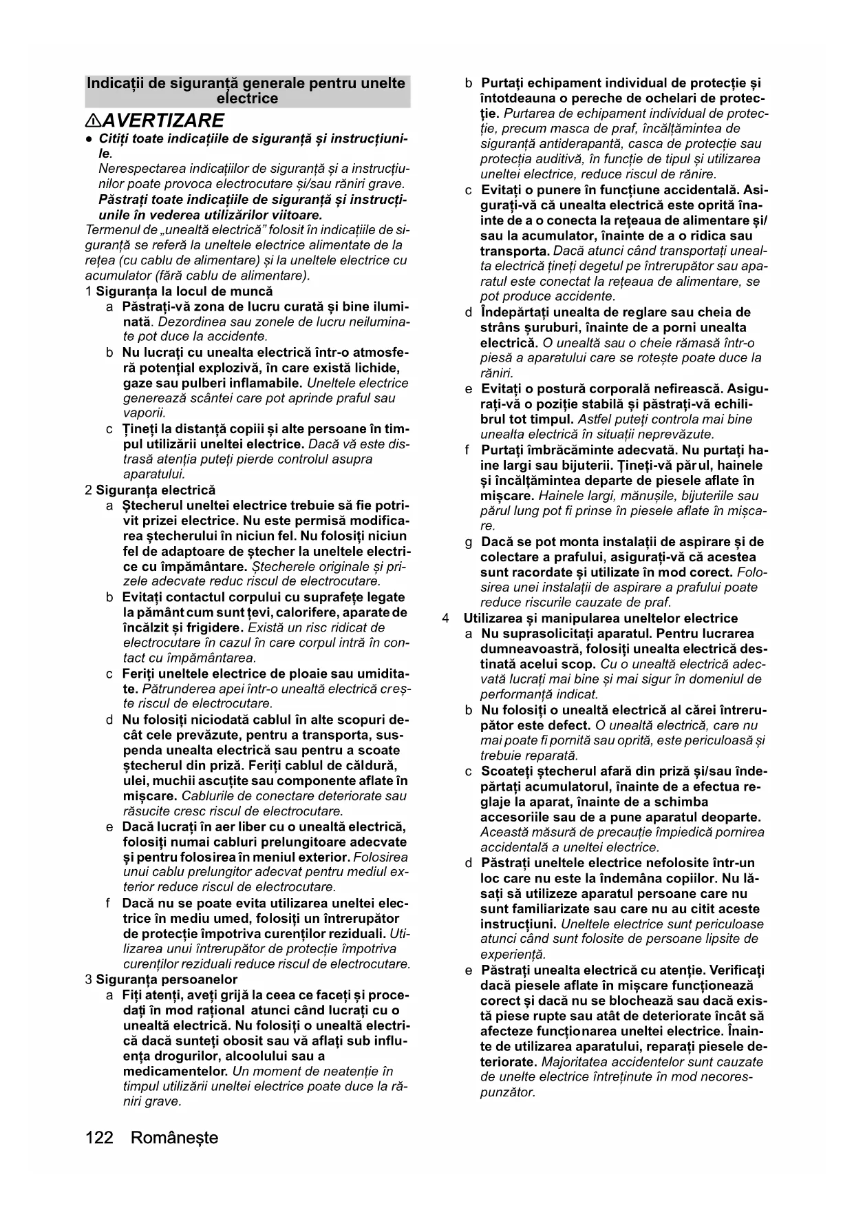 - Declaraţie de conformitate UE 22 Româneşte Indicații de siguranță generale pentru unelte electrice 몇 AVERTIZARE ● Citiți toate indicațiile de siguranță și instrucțiuni- le. Nerespectarea indicațiilor de siguranță și a instrucțiu- nilor poate provoca electrocutare și/sau răniri grave. Păstrați toate indicațiile de siguranță și instrucți- unile în vederea utilizărilor viitoare. Termenul de „unealtă electrică” folosit în indicațiile de si- guranță se referă la uneltele electrice alimentate de la rețea (cu cablu de alimentare) și la uneltele electrice cu acumulator (fără cablu de alimentare). 1 Siguranța la locul de muncă a Păstrați-vă zona de lucru curată și bine ilumi- nată. Dezordinea sau zonele de lucru neilumina- te pot duce la accidente. b Nu lucrați cu unealta electrică într-o atmosfe- ră potențial explozivă, în care există li chide, gaze sau pulberi inflamabile. Uneltele electrice generează scântei care pot aprinde praful sau vaporii. c Țineți la distanță copiii și alte persoane în tim- pul utilizării uneltei electrice. Dacă vă este dis- trasă atenția puteți pierde controlul asupra aparatului. 2 Siguranța electrică a Ștecherul uneltei electrice trebuie să fie potri- vit prizei electrice. Nu este permisă modifica- rea ștecherului în niciun fel. Nu folosiți niciun fel de adaptoare de ștecher la uneltele electri- ce cu împământare. Ștecherele originale și pri- zele adecvate reduc riscul de electrocutare. b Evitați contactul corpului cu suprafețe legate la pământ cum sunt țevi, calorifere, aparate de încălzit și frigidere. Există un risc ridicat de electrocutare în cazul în care corpul intră în con- tact cu împământarea. c Feriți uneltele electrice de ploaie sau umidita- te. Pătrunderea apei într-o unealtă electrică cr eș- te riscul de electrocutare. d Nu folosiți niciodată cablul în alte scopuri de- cât cele prevăzute, pentru a transporta, sus- penda unealta electrică sau pentru a scoate ștecherul din priză. Feriți cablul de căldură, ulei, muchii ascuțite sau componente aflate în mișcare. Cablurile de conectare deteriorate sau răsucite cresc riscul de electrocutare. e Dacă lucrați în aer liber cu o unealtă electrică, folosiți numai cabluri prelungitoare adecvate și pentru folosirea în meniul exterior. Folosirea unui cablu prelungitor adecvat pentru mediul ex- terior reduce riscul de electrocutare. f Dacă nu se poate evita utilizarea uneltei elec- trice în mediu umed, folosiți un întrerupător de protecție împotriva curenților reziduali. Uti- lizarea unui întrerupător de protecție împotriva curenților reziduali reduce riscul de electrocutare. 3 Siguranța persoanelor a Fiți atenți, aveți grijă la ceea ce faceți și proce- daț i în mod rațional atunci când lucrați cu o unealtă electrică. Nu folosiți o unealtă electri- că dacă sunteți obosit sau vă aflați sub influ- ența drogurilor, alcoolului sau a medicamentelor. Un moment de neatenție în timpul utilizării uneltei electrice poate duce la ră- niri grave. b Purtați echipament individual de protecție și întotdeauna o pereche de ochelari de protec- ție. Purtarea de echipament individual de protec- ție, precum masca de praf, încălțămintea de siguranță antiderapantă, casca de protecție sau protecția auditivă, în funcție de tipul și utilizarea uneltei electrice, reduce riscul de rănire. c Evitați o punere în funcțiune accidentală. Asi- gurați-vă că unealta electrică este oprită îna- inte de a o conecta la rețeaua de alimentare și/ sau la acumulator, înainte de a o ridica sau transporta. Dacă at unci când transportați uneal- ta electrică țineți degetul pe întrerupător sau apa- ratul este conectat la rețeaua de alimentare, se pot produce accidente. d Îndepărtați unealta de reglare sau cheia de strâns șuruburi, înainte de a porni unealta electrică. O unealtă sau o cheie rămasă într-o piesă a aparatului care se rotește poate duce la răniri. e Evitați o postură corporală nefirească. Asigu- rați-vă o poziție stabilă și păstrați-vă echili- brul tot timpul. Astfel puteți controla mai bine unealta electrică în situații neprevăzute. f Purtați îmbrăcăminte adecvată. Nu purtați ha- ine largi sau bijuterii. Țineți-vă păr ul, hainele și încălțămintea departe de piesele aflate în mișcare. Hainele largi, mănușile, bijuteriile sau părul lung pot fi prinse în piesele aflate în mișca- re. g Dacă se pot monta instalații de aspirare și de colectare a prafului, asigurați-vă că acestea sunt racordate și utilizate în mod corect. Folo- sirea unei instalații de aspirare a prafului poate reduce riscurile cauzate de praf. 4 Utilizarea și manipularea uneltelor electrice a Nu suprasolicitați aparatul. Pentru lucrarea dumneavoastră, folosiți unealta electrică des- tinată acelui scop. Cu o unealtă electrică adec- vată lucrați mai bine și mai sigur în domeniul de performanță indicat. b Nu folosiți o unealtă electrică al cărei întreru- pător este defect. O unealtă electrică, care nu mai poate fi pornită sau oprită, este periculoasă și trebuie reparată. c Scoateți ștecherul afară din priză și/sau înde- părtați acumulatorul, înainte de a efectua re- glaje la aparat, înainte de a schimba accesoriile sau de a pune aparatul deoparte. Această măsură de precauție împiedică pornirea accidentală a uneltei electrice. d Păstrați uneltele electrice nefolosite într-un loc care nu este la îndemâna copiilor. Nu lă- sați să utilizeze aparatul persoane care nu sunt familiarizate sau care nu au citit aceste instrucțiuni. Uneltele electrice sunt periculoase atunci când sunt folosite de persoane lipsite de experiență. e Păstrați unealta electrică cu atenție. Verificați dacă piesele aflate în mișcare funcționează corect și dacă nu se blochează sau dacă exi