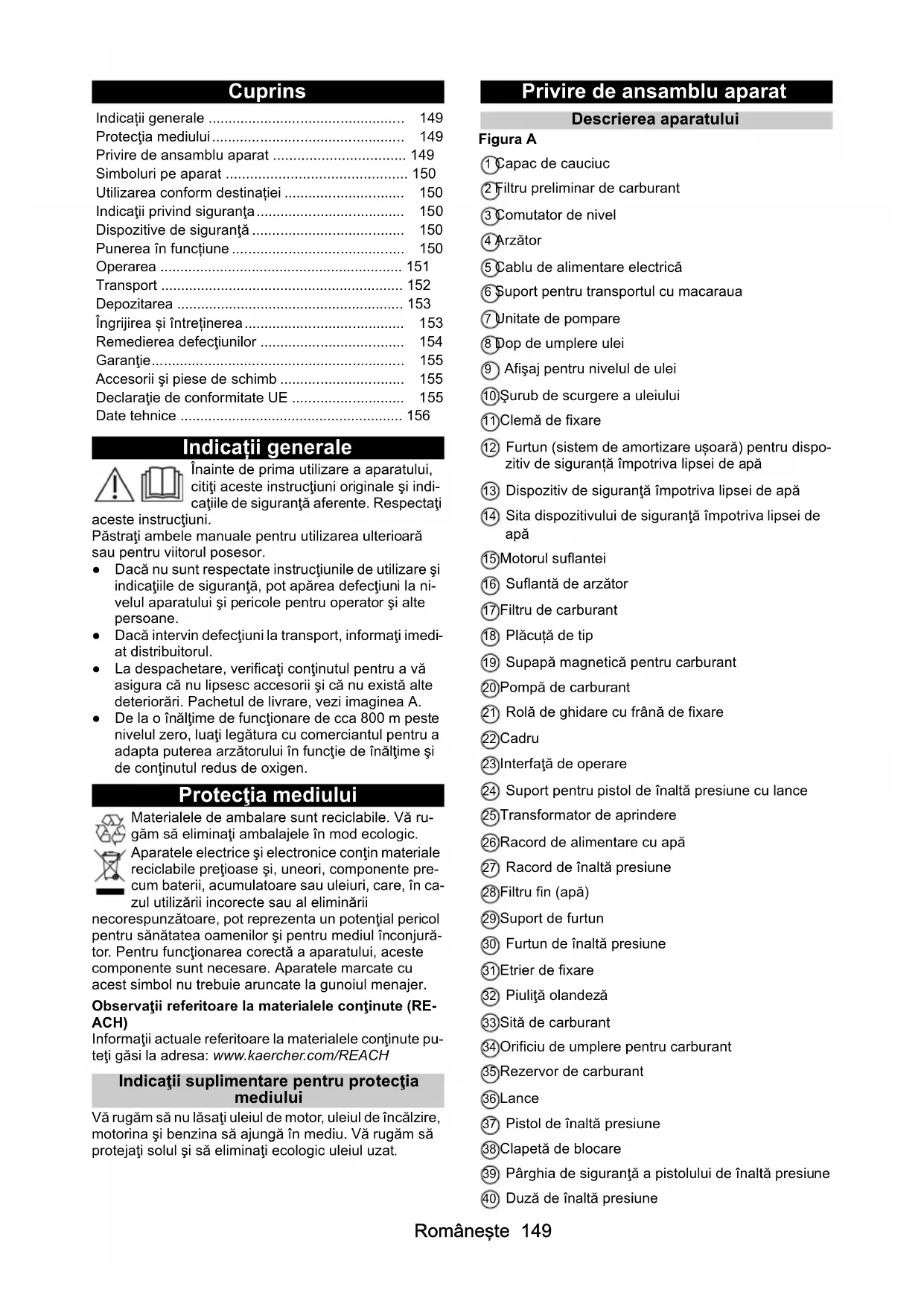 • 1,5Româneşte 149 Cuprins Indicații generale Înainte de prima utilizare a aparatului, citiţi aceste instrucţiuni originale şi indi- caţiile de siguranţă aferente. Respectaţi aceste instrucţiuni. Păstraţi ambele manuale pentru utilizarea ulterioară sau pentru viitorul posesor. ● Dacă nu sunt respectate instrucţiunile de utilizare şi indicaţiile de siguranţă, pot apărea defecţiuni la ni- velul aparatului şi pericole pentru operator şi alte persoane. ● Dacă intervin defecţiuni la transport, informaţi imedi- at distribuitorul. ● La despachetare, verificaţi conţinutul pentru a vă asigura că nu lipsesc accesorii şi că nu există alte deteriorări. Pachetul de livrare, vezi imaginea A. ● De la o înălţime de funcţionare de cca 800 m peste nivelul zero, luaţi legătura cu comerciantul pentru a adapta puterea arzătorului în funcţie de înălţime şi de conţinutul redus de oxigen. Protecţia mediului Materialele de ambalare sunt reciclabile. Vă ru- găm să eliminaţi ambalajele în mod ecologic. Aparatele electrice şi electronice conţin materiale reciclabile preţioase şi, uneori, componente pre- cum baterii, acumulatoare sau uleiuri, care, în ca- zul utilizării incorecte sau al eliminării necorespunzătoare, pot reprezenta un potenţial pericol pentru sănătatea oamenilor şi pentru mediul înconjură- tor. Pentru funcţionarea corectă a aparatului, aceste componente sunt necesare. Aparatele marcate cu acest simbol nu trebuie aruncate la gunoiul menajer. Observaţii referitoare la materialele conţinute (RE- ACH) Informaţii actuale referitoare la materialele conţinute pu- teţi găsi la adresa: www.kaercher.com/REACH Indicaţii suplimentare pentru protecţia mediului Vă rugăm să nu lăsaţi uleiul de motor, uleiul de încălzire, motorina şi benzina să ajungă în mediu. Vă rugăm să protejaţi solul şi să eliminaţi ecologic uleiul uzat. Privire de ansamblu aparat Descrierea aparatului Figura A 1 Capac de cauciuc 2 Filtru preliminar de carburant 3 Comutator de nivel 4 Arzător 5 Cablu de alimentare electrică 6 Suport pentru transportul cu macaraua 7 Unitate de pompare 8 Dop de umplere ulei 9 Afişaj pentru nivelul de ulei 10 Şurub de scurgere a uleiului 11 Clemă de fixare 12 Furtun (sistem de amortizare ușoară) pentru dispo- zitiv de siguranță împotriva lipsei de apă 13 Dispozitiv de siguranţă împotriva lipsei de apă 14 Sita dispozitivului de siguranţă împotriva lipsei de apă 15 Motorul suflantei 16 Suflantă de arzător 17 Filtru de carburant 18 Plăcuță de tip 19 Supapă magnetică pentru carburant 20 Pompă de carburant 21 Rolă de ghidare cu frână de fixare 22 Cadru 23 Interfaţă de operare 24 Suport pentru pistol de înaltă presiune cu lance 25 Transformator de aprindere 26 Racord de alimentare cu apă 27 Racord de înaltă presiune 28 Filtru fin (apă) 29 Suport de furtun 30 Furtun de înaltă presiune 31 Etrier de fixare 32 Piuliţă olandeză 33 Sită de carburant 34 Orificiu de umplere pentru carburant 35 Rezervor de carburant 36 Lance 37 Pistol de înaltă presiune 38 Clapetă de blocare 39 Pârghia de siguranţă a pistolului de înaltă presiune 40 Duză de înaltă presiune Indicații generale p. 149