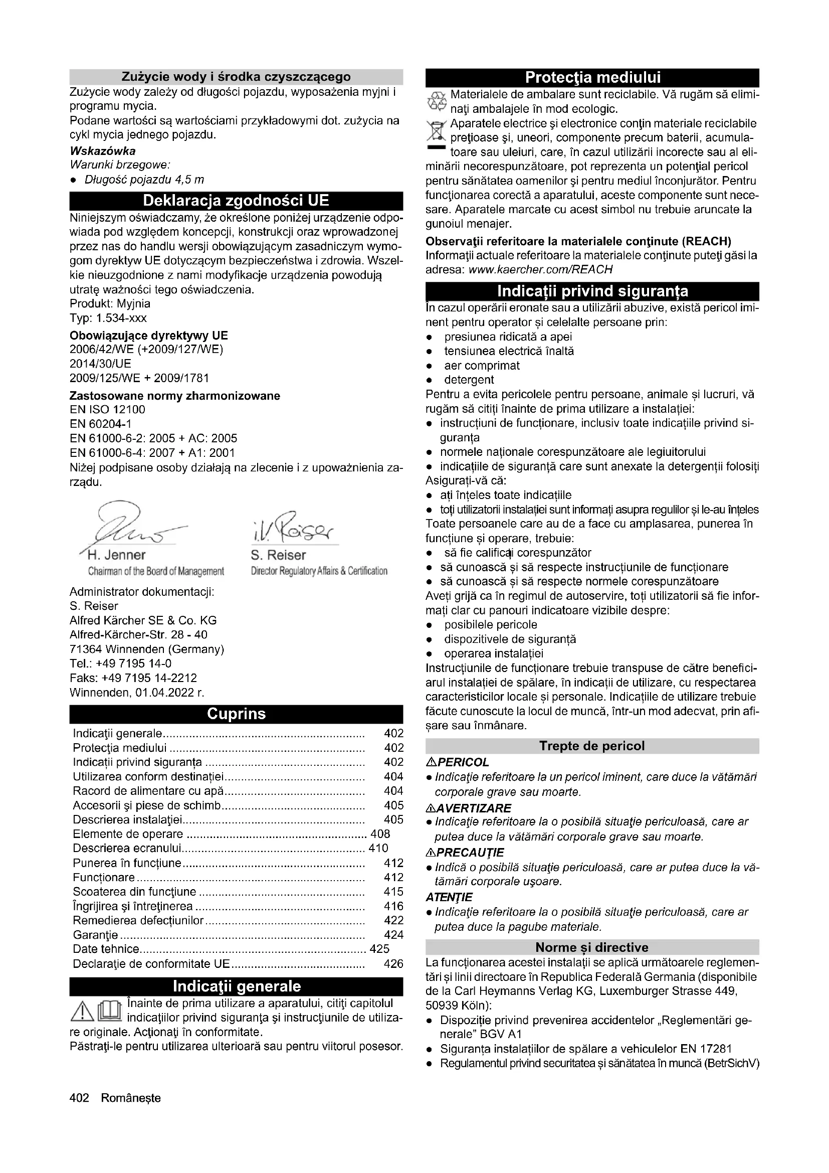 - Dane techniczne Zmiany techniczne zastrzeżone. CW 3 / CW 5 (CWB 3/1) CW 3 / CW 5 (CWB 3/2) CW 3 / CW 5 (CWB 3/3) Wymiary myjni Wysokość mycia mm 2100, 2200, 2300 2400, 2500, 2600 2700, 2800, 2900 Wysokość ramy mm 2900 3200 3500 Łączna wysokość mm 2930, 3030, 3130 3230, 3330, 3430 3530, 3630, 3730 Szerokość ramy mm 3500 3500 3500 Łączna szerokość szczotek bocznych mm 4040 4040 4040 Łączna szerokość ochrony przeciwbryzgowej mm 4060 4060 4060 Głębokość ramy/głębokość z obrotowymi szczotkami mm 1600 / 2170 1600 / 2170 1600 / 2170 Łączna długość krótkiej hali mm 2070 2070 2070 Szerokość urządzenia na wysokości lustra mm 2450 2450 2450 Szerokość urządzenia w strefie mycia kół mm 2100 2100 2100 Rozstaw szyn jezdnych mm 2550, 2700, 2800 2550, 2700, 2800 2550, 2700, 2800 Szerokość hali z odstępem bezpieczeństwa mm 4500 4500 4500 Wymiary graniczne pojazdu Szczotki myjące Średnica szczotki, bok mm 975 975 975 Prędkość obrotowa szczotki, bok 1/min 107 107 107 Średnica szczotki, dach mm 975 975 975 Prędkość obrotowa szczotki, dach 1/min 127 127 127 Prędkość bramki portalowej m/min 0 - 24 0 - 24 0 - 24 Przyłącze elektryczne Napięcie sieciowe V 400 400 400 Częstotliwość Hz 50 50 50 Moc przyłącza kW 10-16 10-16 10-16 Maks. bezpiecznik do sterownika A 35-50 35-50 35-50 Przyłącze wody Średnica znamionowa cale 1 1 1 Ciśnienie hydrauliczne zgodnie z DIN 1988 (przy 100 l/min) MPa 0,4 - 0,6 0,4 - 0,6 0,4 - 0,6 Maks. temperatura °C 50 50 50 Przyłącze sprężonego powietrza Średnica znamionowa cale 1/2 1/2 1/2 Ciśnienie MPa 0,6 - 0,8 0,6 - 0,8 0,6 - 0,8 Zużycie/ mycie (bez ochrony przed zamarzaniem, zależnie od programu przy długości pojazdu 4,5 m) l505050 Zużycie w przypadku ochrony przed zamarzaniem, ok. l 700 700 700 Wartości określone zgodnie z EN 60335-2-79 Poziom hałasu przy pracy na sucho dB(A) 94 94 94 Poziom hałasu modułu wysokociśnieniowego dB(A) 87 87 87402 Româneşte Zużycie wody i środka czyszczącego Zużycie wody zależy od długości pojazdu, wyposażenia myjni i programu mycia. Podane wartości są wartościami przykładowymi dot. zużycia na cykl mycia jednego pojazdu. Wskazówka Warunki brzegowe: ● Długość pojazdu 4,5 m Deklaracja zgodności UE Niniejszym oświadczamy, że określone poniżej urządzenie odpo- wiada pod względem koncepcji, konstrukcji oraz wprowadzonej przez nas do handlu wersji obowiązującym zasadniczym wymo- gom dyrektyw UE dotyczącym bezpieczeństwa i zdrowia. Wszel- kie nieuzgodnione z nami modyfikacje urządzenia powodują utratę ważności tego oświadczenia. Produkt: Myjnia Typ: 1.534-xxx Obowiązujące dyrektywy UE 2006/42/WE (+2009/127/WE) 2014/30/UE 2009/125/WE + 2009/1781 Zastosowane normy zharmonizowane EN ISO 12100 EN 60204-1 EN 61000-6-2: 2005 + AC: 2005 EN 61000-6-4: 2007 + A1: 2001 Niżej podpisane osoby działają na zlecenie i z upoważnienia za- rządu. Administrator dokumentacji: S. Reiser Alfred Kärcher SE & Co. KG Alfred-Kärcher-Str. 28 - 40 71364 Winnenden (Germany) Tel.: +49 7195 14-0 Faks: +49 7195 14-2212 Winnenden, 01.04.2022 r. Cuprins Indicaţii generale Înainte de prima utilizare a aparatului, citiţi capitolul indicaţiilor privind siguranţa şi instrucţiunile de utiliza- re originale. Acţionaţi în conformitate. Păstraţi-le pentru utilizarea ulterioară sau pentru viitorul posesor. Protecţia mediului Materialele de ambalare sunt reciclabile. Vă rugăm să elimi- naţi ambalajele în mod ecologic. Aparatele electrice şi electronice conţin materiale reciclabile preţioase şi, uneori, componente precum baterii, acumula- toare sau uleiuri, care, în cazul utilizării incorecte sau al eli- minării necorespunzătoare, pot reprezenta un potenţial pericol pentru sănătatea oamenilor şi pentru mediul înconjurător. Pentru funcţionarea corectă a aparatului, aceste componente sunt nece- sare. Aparatele marcate cu acest simbol nu trebuie aruncate la gunoiul menajer. Observaţii referitoare la materialele conţinute (REACH) Informaţii actuale referitoare la materialele conţinute puteţi găsi la adresa: www.kaercher.com/REACH Indicații privind siguranța În cazul operării eronate sau a utilizării abuzive, există pericol imi- nent pentru operator și celelalte persoane prin: ● presiunea ridicată a apei ● tensiunea electrică înaltă ● aer comprimat ● detergent Pentru a evita pericolele pentru persoane, animale și lucruri, vă rugăm să citiți înainte de prima utilizare a instalației: ● instrucțiuni de funcționare, inclusiv toate indicațiile privind si- guranța ● normele naționale corespunzătoare ale legiuitorului ● indicațiile de siguranță care sunt anexate la detergenții folosiți Asigurați-vă că: ● ați înțeles toate indicațiile ● toți utilizatorii instalației sunt informați asupra regulilor și le-au înțeles Toate persoanele care au de a face cu amplasarea, punerea în funcțiune și operare, trebuie: ● să fie califica ți corespunzător ● să cunoască și să respecte instrucțiunile de funcționare ● să cunoască și să respecte normele corespunzătoare Aveți grijă ca în regimul de autoservire, toți utilizatorii să fie infor- mați clar cu panouri indicatoare vizibile despre: ● posibilele pericole ● dispozitivele de siguranță ● operarea instalației Instrucțiunile de funcționare trebuie transpuse de către benefici- arul instalației de spălare, în indicații de utilizare, cu respectarea caracteristicilor locale și personale. Indicațiile de utilizare trebuie făcute cunoscute la locul de muncă, într-un mod adecvat, prin afi- șare sau înmânare. Trepte de pericol PERICOL ● Indicaţie referitoare la un pericol iminent, care duce la vătămări corporale grave sau moarte. 몇 AVERTIZARE ● Indicaţie referitoare la o posibilă situaţie periculoasă, care ar putea duce la vătămări corporale grave sau moarte. 몇 PRECAUŢIE ● Indică o posibilă