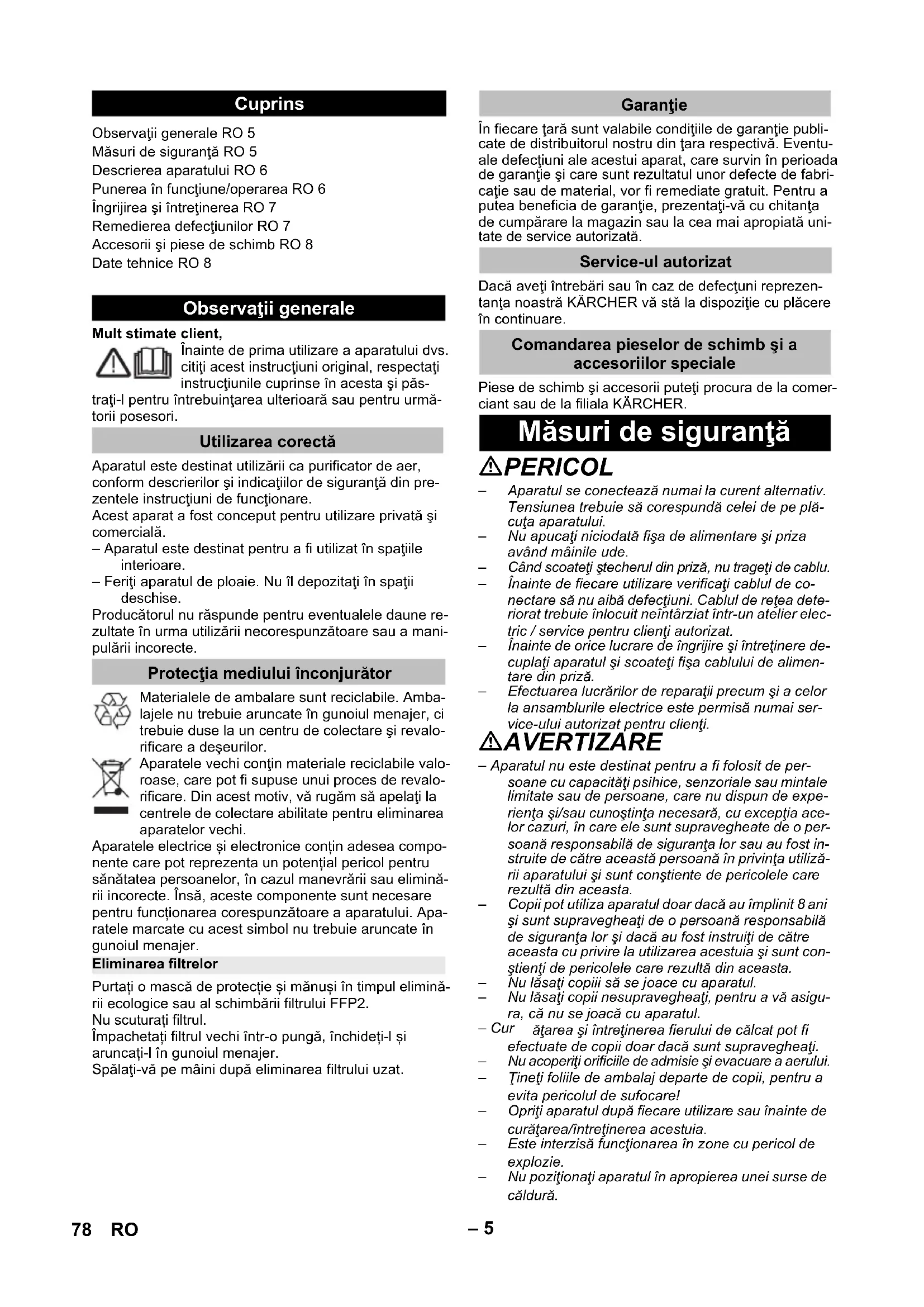 dB(A) dB(A) dB(A) 77PL– 5 Mult stimate client, Înainte de prima utilizare a aparatului dvs. citiţi acest instrucţiuni original, respectaţi instrucţiunile cuprinse în acesta şi păs- traţi-l pentru întrebuinţarea ulterioară sau pentru urmă- torii posesori. Aparatul este destinat utilizării ca purificator de aer, conform descrierilor şi indicaţiilor de siguranţă din pre- zentele instrucţiuni de funcţionare. Acest aparat a fost conceput pentru utilizare privată şi comercială. – Aparatul este destinat pentru a fi utilizat în spaţiile interioare. – Feriţi aparatul de ploaie. Nu îl depozitaţi în spaţii deschise. Producătorul nu răspunde pentru eventualele daune re- zultate în urma utilizării necorespunzătoare sau a mani- pulării incorecte. Materialele de ambalare sunt reciclabile. Amba- lajele nu trebuie aruncate în gunoiul menajer, ci trebuie duse la un centru de colectare şi revalo- rificare a deşeurilor. Aparatele vechi conţin materiale reciclabile valo- roase, care pot fi supuse unui proces de revalo- rificare. Din acest motiv, vă rugăm să apelaţi la centrele de colectare abilitate pentru eliminarea aparatelor vechi. Aparatele electrice și electronice conțin adesea compo- nente care pot reprezenta un potențial pericol pentru sănătatea persoanelor, în cazul manevrării sau elimină- rii incorecte. Însă, aceste componente sunt necesare pentru funcționarea corespunzătoare a aparatului. Apa- ratele marcate cu acest simbol nu trebuie aruncate în gunoiul menajer. Purtați o mască de protecție și mănuși în timpul elimină- rii ecologice sau al schimbării filtrului FFP2. Nu scuturați filtrul. Împachetați filtrul vechi într-o pungă, închideți-l și aruncați-l în gunoiul menajer. Spălaţi-vă pe mâini după eliminarea filtrului uzat. În fiecare ţară sunt valabile condiţiile de garanţie publi- cate de distribuitorul nostru din ţara respectivă. Eventu- ale defecţiuni ale acestui aparat, care survin în perioada de garanţie şi care sunt rezultatul unor defecte de fabri- caţie sau de material, vor fi remediate gratuit. Pentru a putea beneficia de garanţie, prezentaţi-vă cu chitanţa de cumpărare la magazin sau la cea mai apropiată uni- tate de service autorizată. Dacă aveţi întrebări sau în caz de defecţuni reprezen- tanţa noastră KÄRCHER vă stă la dispoziţie cu plăcere în continuare. Piese de schimb şi accesorii puteţi procura de la comer- ciant sau de la filiala KÄRCHER. PERICOL – Aparatul se conectează numai la curent alternativ. Tensiunea trebuie să corespundă celei de pe plă- cuţa aparatului. – Nu apucaţi niciodată fişa de alimentare şi priza având mâinile ude. – Când scoateţi ştecherul din priză, nu trageţi de cablu. – Înainte de fiecare utilizare verificaţi cablul de co- nectare să nu aibă defecţiuni. Cablul de reţea dete- riorat trebuie înlocuit neîntârziat într-un atelier elec- tric / service pentru clienţi autorizat. – Înainte de orice lucrare de îngrijire şi întreţinere de- cuplaţi aparatul şi scoateţi fişa cablului de alimen- tare din priză. – Efectuarea lucrărilor de reparaţii precum şi a celor la ansamblurile electrice este permisă numai ser- vice-ului autorizat pentru clienţi. AVERTIZARE – Aparatul nu este destinat pentru a fi folosit de per- soane cu capacităţi psihice, senzoriale sau mintale limitate sau de persoane, care nu dispun de expe- rienţa şi/sau cunoştinţa necesară, cu excepţia ace- lor cazuri, în care ele sunt supravegheate de o per- soană responsabilă de siguranţa lor sau au fost in- struite de către această persoană în privinţa utiliză- rii aparatului şi sunt conştiente de pericolele care rezultă din aceasta. – Copii pot utiliza aparatul doar dacă au împlinit 8 ani şi sunt supravegheaţi de o persoană responsabilă de siguranţa lor şi dacă au fost instruiţi de către aceasta cu privire la utilizarea acestuia şi sunt con- ştienţi de pericolele care rezultă din aceasta. – Nu lăsaţi copiii să se joace cu aparatul. – Nu lăsaţi copii nesupravegheaţi, pentru a vă asigu- ra, că nu se joacă cu aparatul. – Cur ăţarea şi întreţinerea fierului de călcat pot fi efectuate de copii doar dacă sunt supravegheaţi. – Nu acoperiţi orificiile de admisie şi evacuare a aerului. – Ţineţi foliile de ambalaj departe de copii, pentru a evita pericolul de sufocare! – Opriţi aparatul după fiecare utilizare sau înainte de curăţarea/întreţinerea acestuia. – Este interzisă funcţionarea în zone cu pericol de explozie. – Nu poziţionaţi aparatul în apropierea unei surse de căldură. Cuprins Observaţii generale RO 5 Măsuri de siguranţă RO 5 Descrierea aparatului RO 6 Punerea în funcţiune/operarea RO 6 Îngrijirea şi întreţinerea RO 7 Remedierea defecţiunilor RO 7 Accesorii şi piese de schimb RO 8 Date tehnice RO 8 Observaţii generale Utilizarea corectă Protecţia mediului înconjurător Eliminarea filtrelor Garanţie Service-ul autorizat Comandarea pieselor de schimb şi a accesoriilor speciale Măsuri de siguranţă 78 RO– 6 PRECAUŢIE – Aparatul nu înlocuieşte o aerisire adecvată. – Aşezaţi aparatul pe o suprafaţă plană şi stabilă, po- ziţionaţi-l în mod corespunzător. – Utilizaţi exclusiv piese de schimb KÄRCHER origi- nale. – Nu utilizaţi aparatul în medii umede sau în încăperi cu temperaturi de ambianţă ridicate, de exemplu în baie, bucătărie. PERICOL Indicaţie referitoare la un pericol iminent, care duce la vătămări corporale grave sau moarte. 몇 AVERTIZARE Indicaţie referitoare la o posibilă situaţie periculoasă, care ar putea duce la vătămări corporale grave sau moarte. 몇 PRECAUŢIE Indică o posibilă situaţie periculoasă, care ar putea duce la vătămări corporale uşoare. ATENŢIE Indicaţie referitoare la o posibilă situaţie periculoasă, care ar putea duce la pagube materiale. La 