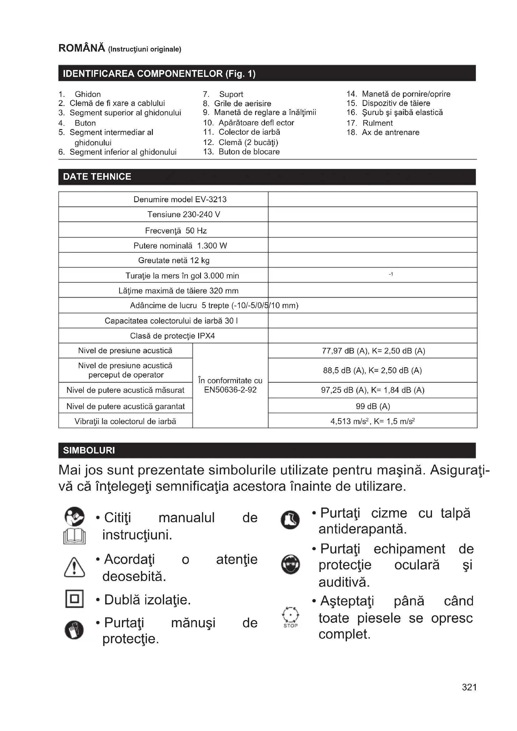Lăţime maximă de tăiere 320 mm Adâncime de lucru 5 trepte (-10/-5/0/5/10 mm) Capacitatea colectorului de iarbă 30 l Clasă de protecţie IPX4 Nivel de presiune acustică În conformitate cu EN50636-2-92 77,97 dB (A), K= 2,50 dB (A) Nivel de presiune acustică perceput de operator 88,5 dB (A), K= 2,50 dB (A) Nivel de putere acustică măsurat 97,25 dB (A), K= 1,84 dB (A) Nivel de putere acustică garantat 99 dB (A) Vibraţii la colectorul de iarbă 4,513 m/s
