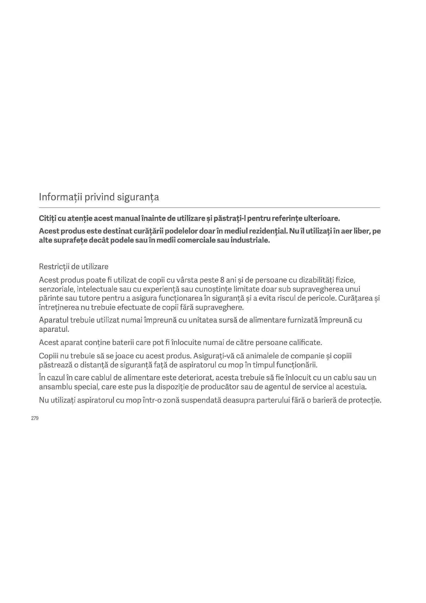 Copii nu trebuie sse joace cu acest produs. Asigura-i-va cai animalele de companie si copii i pastrea z o distanta de siguranta fata de aspiratorul cu mop in timpul functiarii.