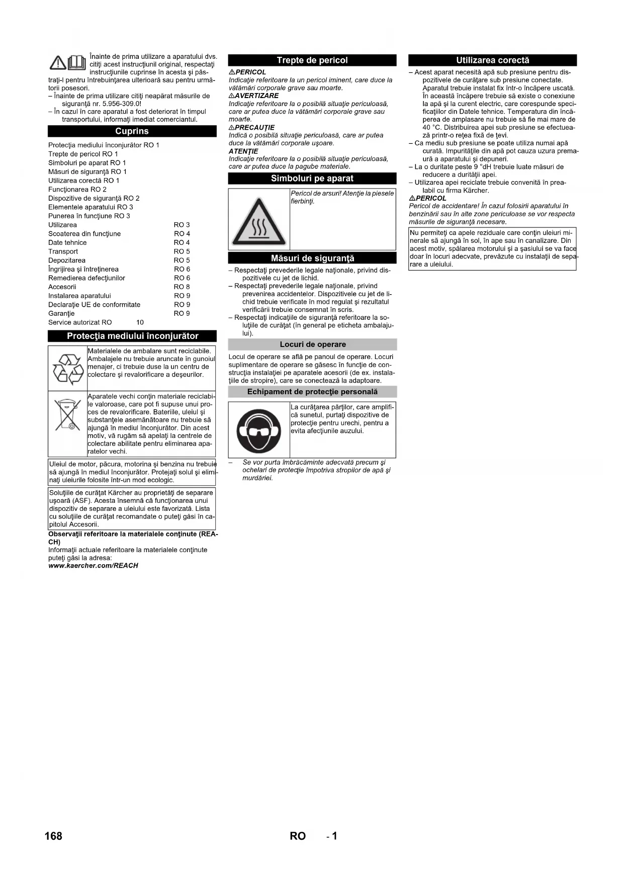 Lămpi de control Punerea în funcţiune Utilizarea Măsuri de siguranţă 170 RO- 4 PERICOL Pericol de electrocutare! Nu îndreptaţi jetul de apă pe dispozitivele următoare: – Aparate şi instalaţii electrice, – acest aparat, – piesele conducătoare de curent din zona de lucru. Jetul de apă care iese prin lance provoacă un efect de recul. Din cauza unghiului lăncii, apare o forţă care ac-ţionează în sus. PERICOL – Pericol de accidentare! Forţa de recul poate deter- mina pierderea echilibrului dvs. Aceasta poate tra- ge după sine căderea dvs. Lancea poate să scape şi să rănească persoanele. Staţi pe o suprafaţă stabilă şi ţineţi bine pistolul de stropit. Nu blocaţi ni- ciodată maneta pistolului de stropit. – Nu îndreptaţi jetul spre dvs. înşivă sau spre altcineva, pentru a curăţa îmbrăcămintea sau încălţămintea. – Pericol de accidentare din cauza componentelor care pot scăpa. Piesele desprinse şi obiectele aruncate pot răni persoane sau animale. Nu în- dreptaţi niciodată jetul de apă spre obiecte fragile şi libere. – Pericol de accidente din cauza deteriorării! Curăţaţi roţile şi supapele de la o distanţă minimă de 30 cm. PERICOL Pericol din cauza substanţelor nocive! Nu stropiţi mate- rialele următoare, căci se pot genera substanţe, care re- prezintă pericol pentru sănătate: – Materiale, care conţin azbest – Materialele, care probabil conţin substanţe pericu- loase pentru sănătate. PERICOL – Pericol de rănire din cauza jetului fierbinte. Apara- tul funcţionează optimal numai cu furtunurile de presiune originale Kärcher. La utilizarea altor furtu- nuri garanţia îşi pierde valabilitatea. – Pericol pentru sănătate prin soluţia de curăţat! Da- torită soluţiei de curăţat, care se amestecă la nevo- ie la apa evacuată, aceasta nu are proprietăţi de apă potabilă.