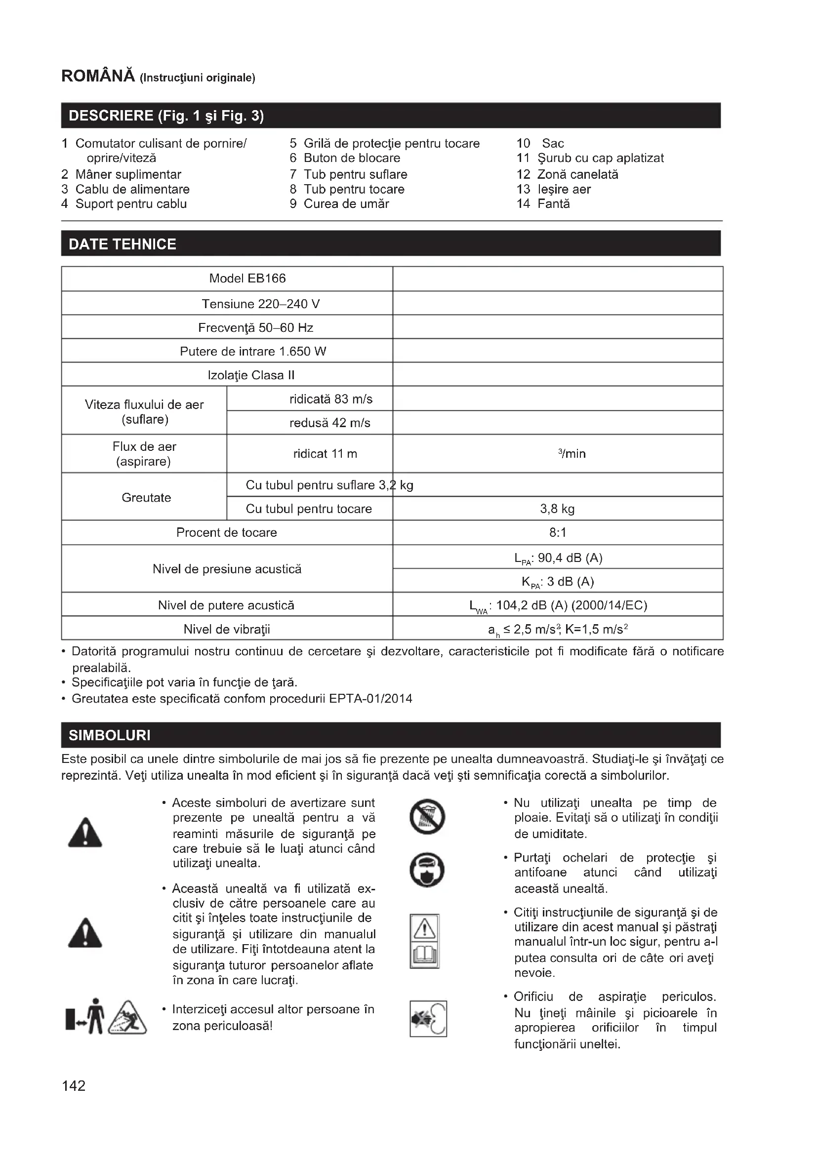 ја ако е потребно. ИЗЈАВА ЗА СООБРАЗНОСТ НА ЕC Само за европските држави Изјавата за сообразност на ЕC е вклучена како Анекс А на ова упатство за работа.142 ROMÂNĂ (Instrucţiuni originale) DESCRIERE (Fig. 1 şi Fig. 3) 1 Comutator culisant de pornire/ oprire/viteză 2 Mâner suplimentar 3 Cablu de alimentare 4 Suport pentru cablu 5 Grilă de protecţie pentru tocare 6 Buton de blocare 7 Tub pentru suare 8 Tub pentru tocare 9 Curea de umăr 10 Sac 11 Şurub cu cap aplatizat 12 Zonă canelată 13 Ieşire aer 14 Fantă DATE TEHNICE Model EB166 Tensiune 220–240 V Frecvenţă 50–60 Hz Putere de intrare 1.650 W Izolaţie Clasa II Viteza uxului de aer (suare) ridicată 83 m/s redusă 42 m/s Flux de aer (aspirare) ridicat 11 m