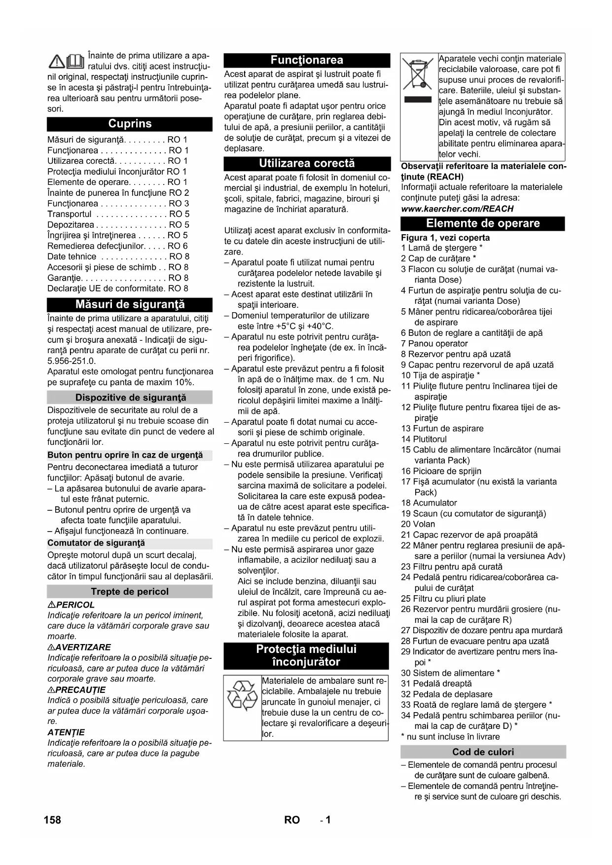 - nu sunt incluse în livrare – Elementele de comandă pentru procesul de curăţare sunt de culoare galbenă. – Elementele de comandă pentru întreţine- re şi service sunt de culoare gri deschis. Cuprins Măsuri de siguranţă. . . . . . . . . RO 1 Funcţionarea . . . . . . . . . . . . . . RO 1 Utilizarea corectă. . . . . . . . . . . RO 1 Protecţia mediului înconjurător RO 1 Elemente de operare. . . . . . . . RO 1 Înainte de punerea în funcţiune RO 2 Funcţionarea . . . . . . . . . . . . . . RO 3 Transportul . . . . . . . . . . . . . . . RO 5 Depozitarea . . . . . . . . . . . . . . . RO 5 Îngrijirea şi întreţinerea . . . . . . RO 5 Remedierea defecţiunilor. . . . . RO 6 Date tehnice . . . . . . . . . . . . . . RO 8 Accesorii şi piese de schimb . . RO 8 Garanţie. . . . . . . . . . . . . . . . . . RO 8 Declaraţie UE de conformitate. RO 8 Măsuri de siguranţă Dispozitive de siguranţă Buton pentru oprire în caz de urgenţă Comutator de siguranţă Trepte de pericol Funcţionarea Utilizarea corectă Protecţia mediului înconjurător Materialele de ambalare sunt re- ciclabile. Ambalajele nu trebuie aruncate în gunoiul menajer, ci trebuie duse la un centru de co- lectare şi revalorificare a deşeuri- lor. Aparatele vechi conţin materiale reciclabile valoroase, care pot fi supuse unui proces de revalorifi- care. Bateriile, uleiul şi substan- ţele asemănătoare nu trebuie să ajungă în mediul înconjurător. Din acest motiv, vă rugăm să apelaţi la centrele de colectare abilitate pentru eliminarea apara- telor vechi. Elemente de operare Cod de culori 158 RO- 2 Figura 2, vezi coperta 1 Comutator pentru direcţia de deplasare 2 Comutator pentru program 3 Claxon 4 Comutator cu cheie 5 Buton pentru oprire în caz de urgenţă 6 Comutator pentru dispozitivul de doza- re a soluţiei de curăţare (numai la versi- unea Dose) 7 Comutator pentru indicator de avertiza- re pentru mers înapoi * 8 Buton pentru informaţii (numai varianta Adv.) 9Ecran 10 Lampă de control: service 11 Lampă de control: frâna de imobilizare automată activă 12 Lampă de control: monitorizarea acu- mulatorului 13 Lampă de control: defecţiuni 14 Lampă de control: rezervorul de apă uzată plin 15 Lampă de control: suprasolicitarea peri-