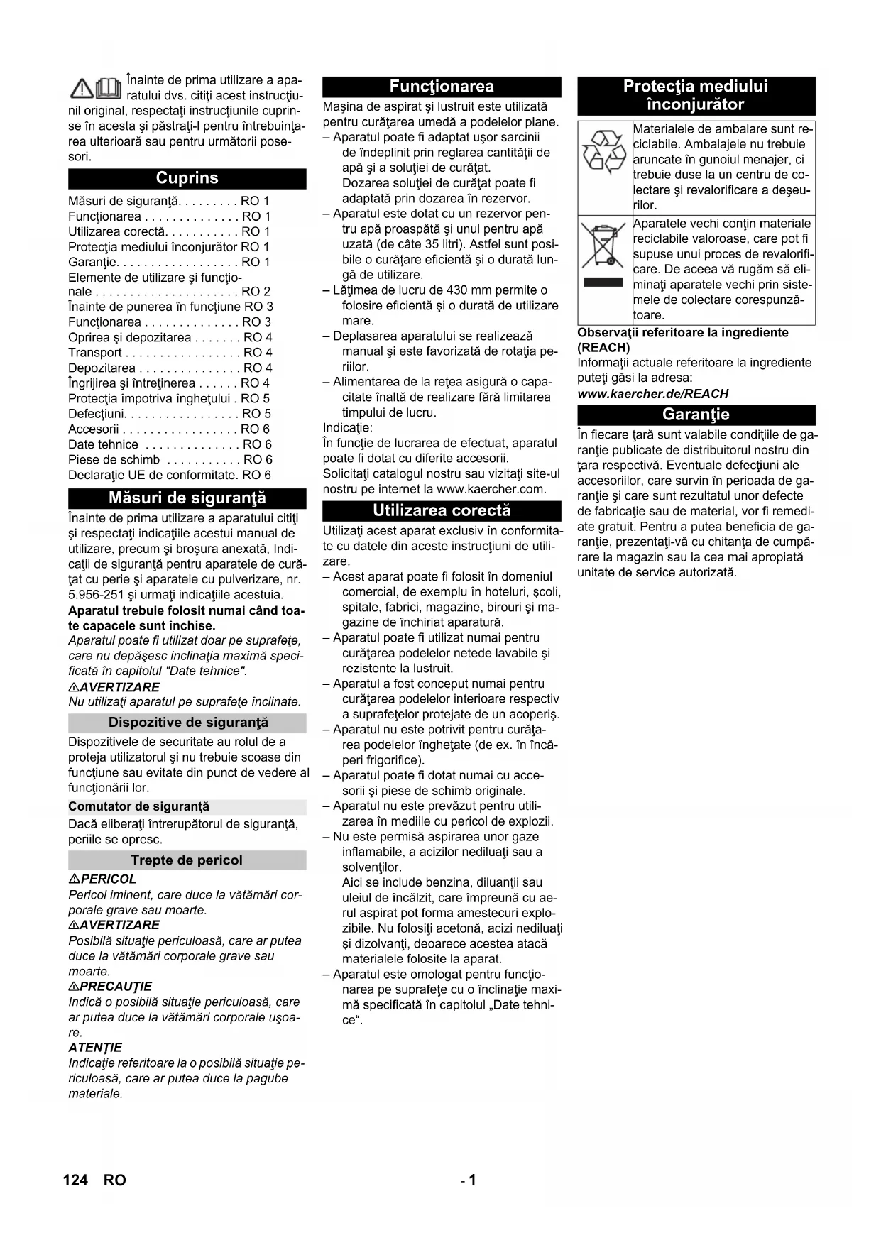 Chairman of the Board of Management Director Regulatory Affairs & Certification 123PL- 1 Înainte de prima utilizare a apa- ratului dvs. citiţi acest instrucţiu- nil original, respectaţi instrucţiunile cuprin- se în acesta şi păstraţi-l pentru întrebuinţa- rea ulterioară sau pentru următorii pose- sori. Înainte de prima utilizare a aparatului citiţi şi respectaţi indicaţiile acestui manual de utilizare, precum şi broşura anexată, Indi- caţii de siguranţă pentru aparatele de cură- ţat cu perie şi aparatele cu pulverizare, nr. 5.956-251 şi urmaţi indicaţiile acestuia. Aparatul trebuie folosit numai când toa- te capacele sunt închise. Aparatul poate fi utilizat doar pe suprafeţe, care nu depăşesc inclinaţia maximă speci- ficată în capitolul "Date tehnice". 몇 AVERTIZARE Nu utilizaţi aparatul pe suprafeţe înclinate. Dispozitivele de securitate au rolul de a proteja utilizatorul şi nu trebuie scoase din funcţiune sau evitate din punct de vedere al funcţionării lor. Dacă eliberaţi întrerupătorul de siguranţă, periile se opresc. PERICOL Pericol iminent, care duce la vătămări cor- porale grave sau moarte. 몇 AVERTIZARE Posibilă situaţie periculoasă, care ar putea duce la vătămări corporale grave sau moarte. 몇 PRECAUŢIE Indică o posibilă situaţie periculoasă, care ar putea duce la vătămări corporale uşoa- re. ATENŢIE Indicaţie referitoare la o posibilă situaţie pe- riculoasă, care ar putea duce la pagube materiale. Maşina de aspirat şi lustruit este utilizată pentru curăţarea umedă a podelelor plane. – Aparatul poate fi adaptat uşor sarcinii de îndeplinit prin reglarea cantităţii de apă şi a soluţiei de curăţat. Dozarea soluţiei de curăţat poate fi adaptată prin dozarea în rezervor. – Aparatul este dotat cu un rezervor pen- tru apă proaspătă şi unul pentru apă uzată (de câte 35 litri). Astfel sunt posi- bile o curăţare eficientă şi o durată lun- gă de utilizare. – Lăţimea de lucru de 430 mm permite o folosire eficientă şi o durată de utilizare mare. – Deplasarea aparatului se realizează manual şi este favorizată de rotaţia pe- riilor. – Alimentarea de la reţea asigură o capa- citate înaltă de realizare fără limitarea timpului de lucru. Indicaţie: În funcţie de lucrarea de efectuat, aparatul poate fi dotat cu diferite accesorii. Solicitaţi catalogul nostru sau vizitaţi site-ul nostru pe internet la www.kaercher.com. Utilizaţi acest aparat exclusiv în conformita- te cu datele din aceste instrucţiuni de utili- zare. – Acest aparat poate fi folosit în domeniul comercial, de exemplu în hoteluri, şcoli, spitale, fabrici, magazine, birouri şi ma- gazine de închiriat aparatură. – Aparatul poate fi utilizat numai pentru curăţarea podelelor netede lavabile şi rezistente la lustruit. – Aparatul a fost conceput numai pentru curăţarea podelelor interioare respectiv a suprafeţelor protejate de un acoperiş. – Aparatul nu este potrivit pentru curăţa- rea podelelor îngheţate (de ex. în încă- peri frigorifice). – Aparatul poate fi dotat numai cu acce- sorii şi piese de schimb originale. – Aparatul nu este prevăzut pentru utili- zarea în mediile cu pericol de explozii. – Nu este permisă aspirarea unor gaze inflamabile, a acizilor nediluaţi sau a solvenţilor. Aici se include benzina, diluanţii sau uleiul de încălzit, care împreună cu ae- rul aspirat pot forma amestecuri explo- zibile. Nu folosiţi acetonă, acizi nediluaţi şi dizolvanţi, deoarece acestea atacă materialele folosite la aparat. – Aparatul este omologat pentru funcţio- narea pe suprafeţe cu o înclinaţie maxi- mă specificată în capitolul „Date tehni- ce“. Observaţii referitoare la ingrediente (REACH) Informaţii actuale referitoare la ingrediente puteţi găsi la adresa: www.kaercher.de/REACH În fiecare ţară sunt valabile condiţiile de ga- ranţie publicate de distribuitorul nostru din ţara respectivă. Eventuale defecţiuni ale accesoriilor, care survin în perioada de ga- ranţie şi care sunt rezultatul unor defecte de fabricaţie sau de material, vor fi remedi- ate gratuit. Pentru a putea beneficia de ga- ranţie, prezentaţi-vă cu chitanţa de cumpă- rare la magazin sau la cea mai apropiată unitate de service autorizată. Cuprins Măsuri de siguranţă. . . . . . . . . RO 1 Funcţionarea . . . . . . . . . . . . . . RO 1 Utilizarea corectă. . . . . . . . . . . RO 1 Protecţia mediului înconjurător RO 1 Garanţie. . . . . . . . . . . . . . . . . . RO 1 Elemente de utilizare şi funcţio- nale . . . . . . . . . . . . . . . . . . . . . RO 2 Înainte de punerea în funcţiune RO 3 Funcţionarea . . . . . . . . . . . . . . RO 3 Oprirea şi depozitarea . . . . . . . RO 4 Transport . . . . . . . . . . . . . . . . . RO 4 Depozitarea . . . . . . . . . . . . . . . RO 4 Îngrijirea şi întreţinerea . . . . . . RO 4 Protecţia împotriva îngheţului . RO 5 Defecţiuni. . . . . . . . . . . . . . . . . RO 5 Accesorii . . . . . . . . . . . . . . . . . RO 6 Date tehnice . . . . . . . . . . . . . . RO 6 Piese de schimb . . . . . . . . . . . RO 6 Declaraţie UE de conformitate. RO 6 Măsuri de siguranţă Dispozitive de siguranţă Comutator de siguranţă Trepte de pericol Funcţionarea Utilizarea corectă Protecţia mediului înconjurător Materialele de ambalare sunt re- ciclabile. Ambalajele nu trebuie aruncate în gunoiul menajer, ci trebuie duse la un centru de co- lectare şi revalorificare a deşeu- rilor. Aparatele vechi conţin materiale reciclabile valoroase, care pot fi supuse unui proces de revalorifi- care. De aceea vă rugăm să eli- minaţi aparatele vechi prin siste- mele de colectare corespunză- toare. Garanţie 124 RO- 2 1 Filtru de trecere 2 Comutator de siguranţă 3 Furtun de evacuare apă uzată cu dispo- zitiv de dozare 4 Şină de suport pentru Homebase 5 Plutitorul 6 Rezervor de apă curată 7 Capac rezervor de apă curată