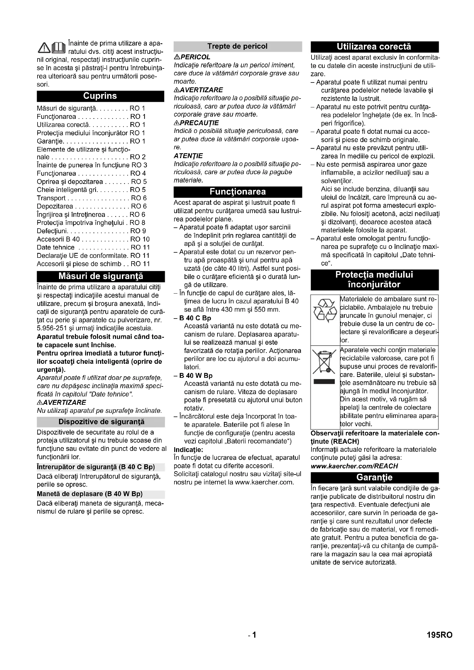 Chairman of the Board of Management Director Regulatory Affairs & Certification Wyposażenie dodatkowe i części zamienne 194 PL- 1 Înainte de prima utilizare a apa- ratului dvs. citiţi acest instrucţiu- nil original, respectaţi instrucţiunile cuprin- se în acesta şi păstraţi-l pentru întrebuinţa- rea ulterioară sau pentru următorii pose- sori. Înainte de prima utilizare a aparatului citiţi şi respectaţi indicaţiile acestui manual de utilizare, precum şi broşura anexată, Indi- caţii de siguranţă pentru aparatele de cură- ţat cu perie şi aparatele cu pulverizare, nr. 5.956-251 şi urmaţi indicaţiile acestuia. Aparatul trebuie folosit numai când toa- te capacele sunt închise. Pentru oprirea imediată a tuturor funcţi- ilor scoateţi cheia inteligentă (oprire de urgenţă). Aparatul poate fi utilizat doar pe suprafeţe, care nu depăşesc inclinaţia maximă speci- ficată în capitolul "Date tehnice". 몇 AVERTIZARE Nu utilizaţi aparatul pe suprafeţe înclinate. Dispozitivele de securitate au rolul de a proteja utilizatorul şi nu trebuie scoase din funcţiune sau evitate din punct de vedere al funcţionării lor. Dacă eliberaţi întrerupătorul de siguranţă, periile se opresc. Dacă eliberaţi maneta de siguranţă, meca- nismul de rulare şi periile se opresc. PERICOL Indicaţie referitoare la un pericol iminent, care duce la vătămări corporale grave sau moarte. 몇 AVERTIZARE Indicaţie referitoare la o posibilă situaţie pe- riculoasă, care ar putea duce la vătămări corporale grave sau moarte. 몇 PRECAUŢIE Indică o posibilă situaţie periculoasă, care ar putea duce la vătămări corporale uşoa- re. ATENŢIE Indicaţie referitoare la o posibilă situaţie pe- riculoasă, care ar putea duce la pagube materiale. Acest aparat de aspirat şi lustruit poate fi utilizat pentru curăţarea umedă sau lustrui- rea podelelor plane. – Aparatul poate fi adaptat uşor sarcinii de îndeplinit prin reglarea cantităţii de apă şi a soluţiei de curăţat. – Aparatul este dotat cu un rezervor pen- tru apă proaspătă şi unul pentru apă uzată (de câte 40 litri). Astfel sunt posi- bile o curăţare eficientă şi o durată lun- gă de utilizare. – În funcţie de capul de curăţare ales, lă- ţimea de lucru în cazul aparatului B 40 se află între 430 mm şi 550 mm. – B 40 C Bp Această variantă nu este dotată cu me- canism de rulare. Deplasarea aparatu- lui se realizează manual şi este favorizată de rotaţia periilor. Acţionarea periilor are loc cu ajutorul a doi acumu- latori. – B 40 W Bp Această variantă nu este dotată cu me- canism de rulare. Viteza de deplasare poate fi presetată cu ajutorul unui buton rotativ. – Încărcătorul este deja încorporat în toa- te aparatele. Bateriile pot fi alese în funcţie de configuraţie (pentru acesta vezi capitolul „Baterii recomandate“) Indicaţie: În funcţie de lucrarea de efectuat, aparatul poate fi dotat cu diferite accesorii. Solicitaţi catalogul nostru sau vizitaţi site-ul nostru pe internet la www.kaercher.com. Utilizaţi acest aparat exclusiv în conformita- te cu datele din aceste instrucţiuni de utili- zare. – Aparatul poate fi utilizat numai pentru curăţarea podelelor netede lavabile şi rezistente la lustruit. – Aparatul nu este potrivit pentru curăţa- rea podelelor îngheţate (de ex. în încă- peri frigorifice). – Aparatul poate fi dotat numai cu acce- sorii şi piese de schimb originale. – Aparatul nu este prevăzut pentru utili- zarea în mediile cu pericol de explozii. – Nu este permisă aspirarea unor gaze inflamabile, a acizilor nediluaţi sau a solvenţilor. Aici se include benzina, diluanţii sau uleiul de încălzit, care împreună cu ae- rul aspirat pot forma amestecuri explo- zibile. Nu folosiţi acetonă, acizi nediluaţi şi dizolvanţi, deoarece acestea atacă materialele folosite la aparat. – Aparatul este omologat pentru funcţio- narea pe suprafeţe cu o înclinaţie maxi- mă specificată în capitolul „Date tehni- ce“. Observaţii referitoare la materialele con- ţinute (REACH) Informaţii actuale referitoare la materialele conţinute puteţi găsi la adresa: www.kaercher.com/REACH În fiecare ţară sunt valabile condiţiile de ga- ranţie publicate de distribuitorul nostru din ţara respectivă. Eventuale defecţiuni ale accesoriilor, care survin în perioada de ga- ranţie şi care sunt rezultatul unor defecte de fabricaţie sau de material, vor fi remedi- ate gratuit. Pentru a putea beneficia de ga- ranţie, prezentaţi-vă cu chitanţa de cumpă- rare la magazin sau la cea mai apropiată unitate de service autorizată. Cuprins Măsuri de siguranţă. . . . . . . . . RO 1 Funcţionarea . . . . . . . . . . . . . . RO 1 Utilizarea corectă. . . . . . . . . . . RO 1 Protecţia mediului înconjurător RO 1 Garanţie. . . . . . . . . . . . . . . . . . RO 1 Elemente de utilizare şi funcţio- nale . . . . . . . . . . . . . . . . . . . . . RO 2 Înainte de punerea în funcţiune RO 3 Funcţionarea . . . . . . . . . . . . . . RO 4 Oprirea şi depozitarea . . . . . . . RO 5 Cheie inteligentă gri. . . . . . . . . RO 5 Transport . . . . . . . . . . . . . . . . . RO 6 Depozitarea . . . . . . . . . . . . . . . RO 6 Îngrijirea şi întreţinerea . . . . . . RO 6 Protecţia împotriva îngheţului . RO 8 Defecţiuni. . . . . . . . . . . . . . . . . RO 9 Accesorii B 40 . . . . . . . . . . . . . RO 10 Date tehnice . . . . . . . . . . . . . . RO 11 Declaraţie UE de conformitate. RO 11 Accesorii şi piese de schimb . . RO 11 Măsuri de siguranţă Dispozitive de siguranţă Întrerupător de siguranţă (B 40 C Bp) Manetă de deplasare (B 40 W Bp) Trepte de pericol Funcţionarea Utilizarea corectă Protecţia mediului înconjurător Materialele de ambalare sunt re- ciclabile. Ambalajele nu trebuie aruncate în gunoiul menajer, ci trebuie duse la un centru de co- lectare şi revalorificare a deşeuri- lor. Aparatele vechi c